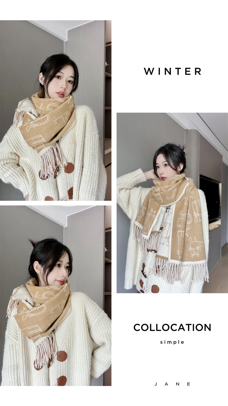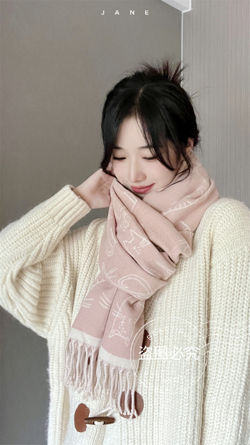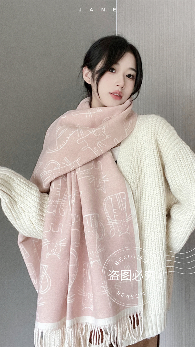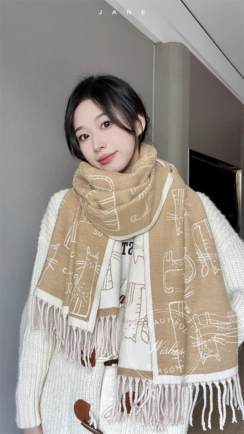 2025년 신상 두꺼운 프린지 스카프 여성용 고양이 프린트 모조 캐시미어 인기 숄 가을 겨울 보온 스카프스토어 가기