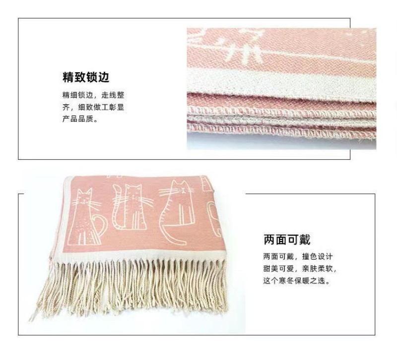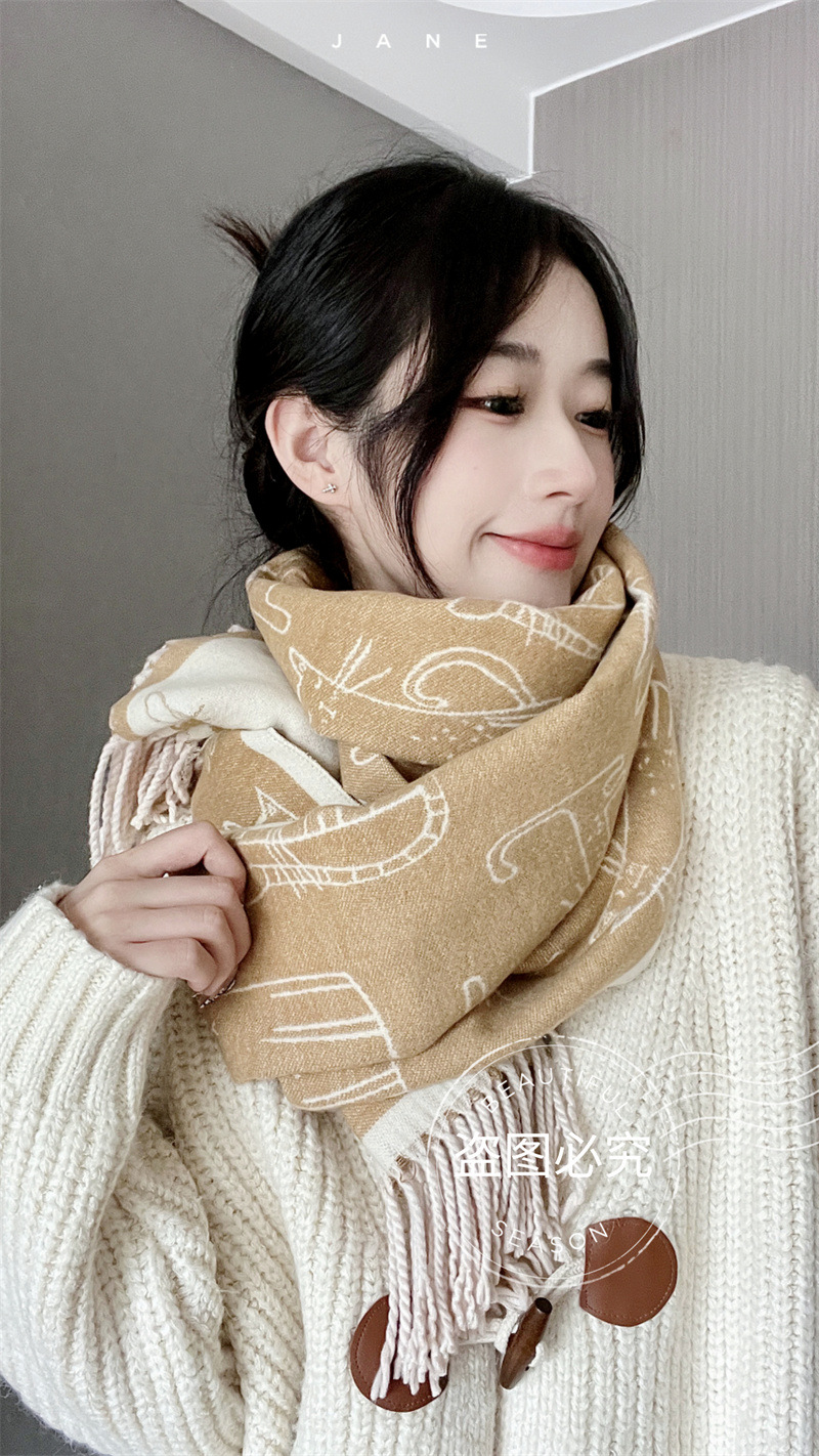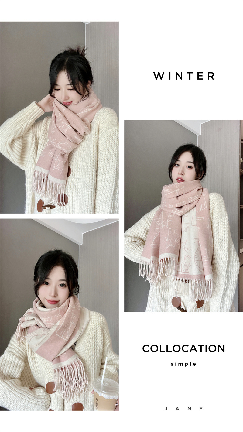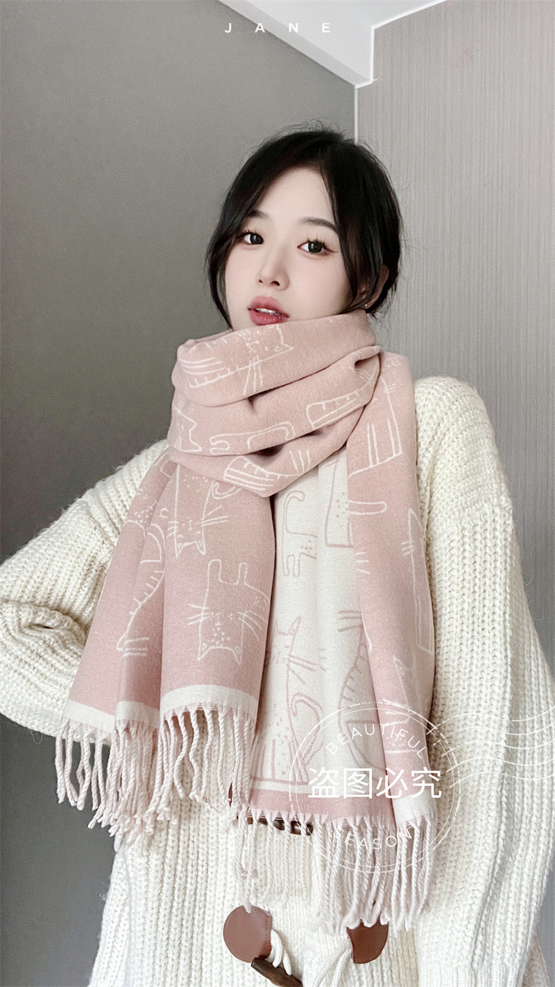 2025년 신상 두꺼운 프린지 스카프 여성용 고양이 프린트 모조 캐시미어 인기 숄 가을 겨울 보온 스카프스토어 가기