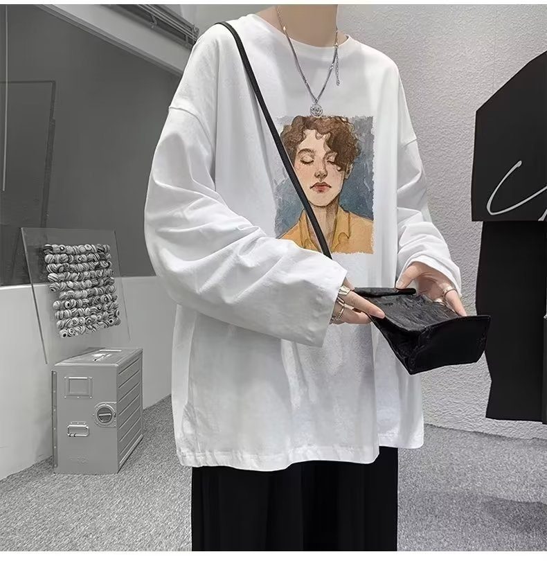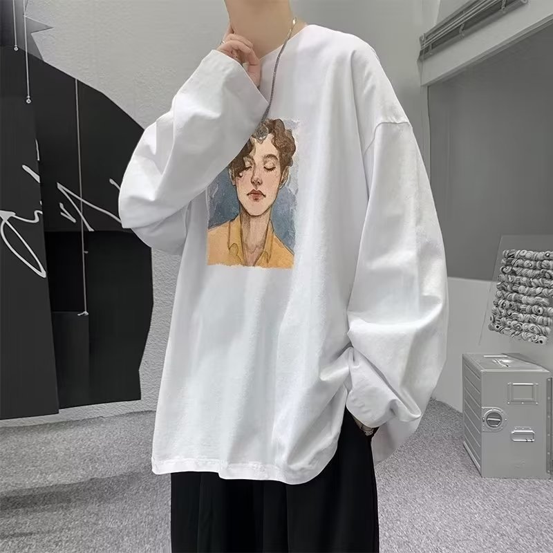 흰색 긴팔 티셔츠 남성용 가을 심플 루즈한 캐주얼 커플 베이스 셔츠 패션 브랜드 홍콩 스타일 올매치 탑