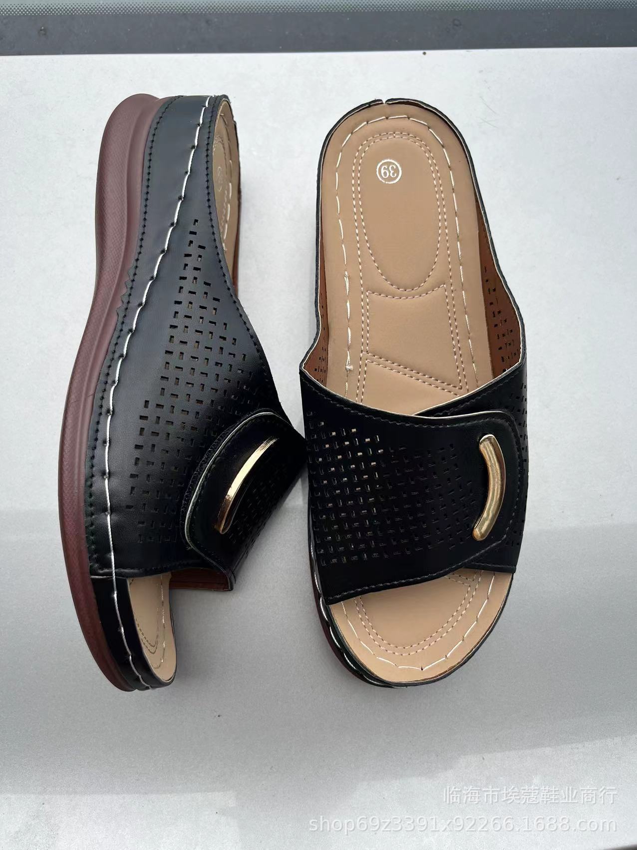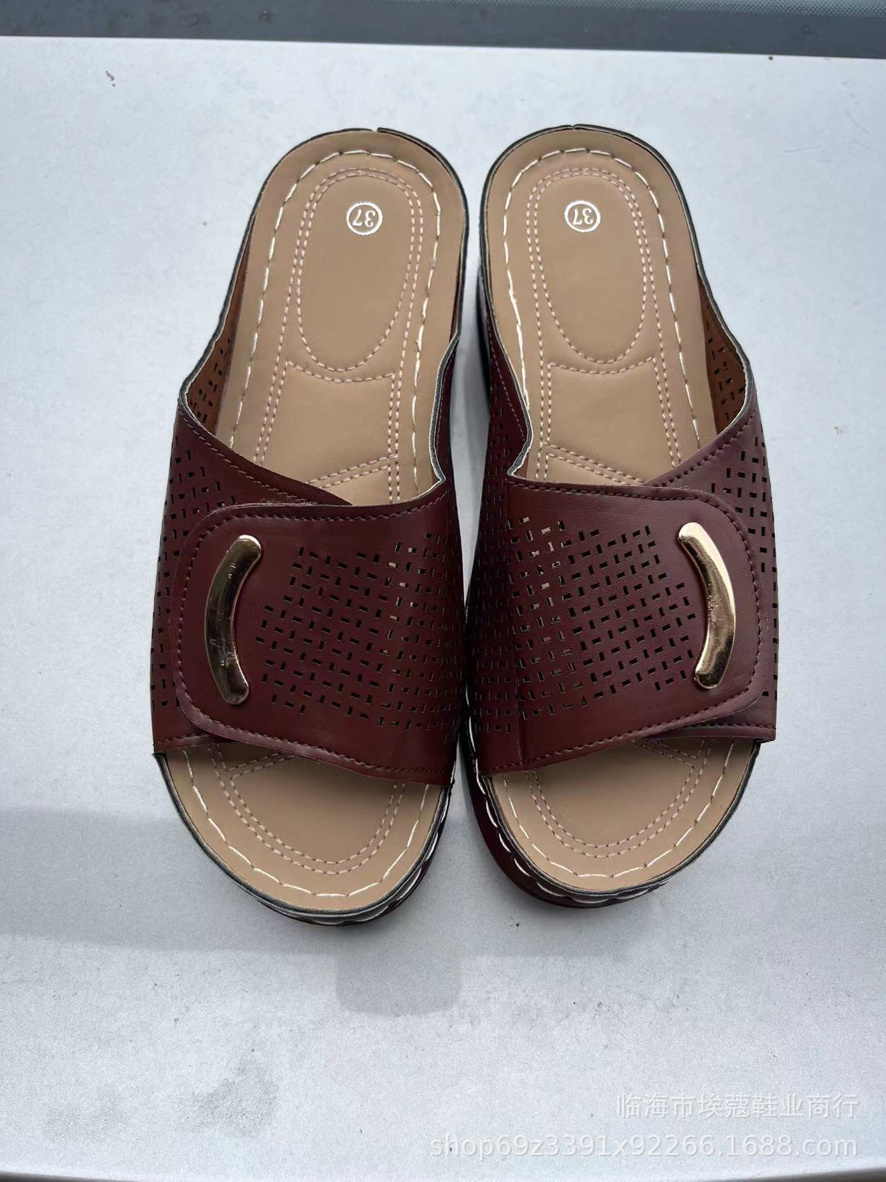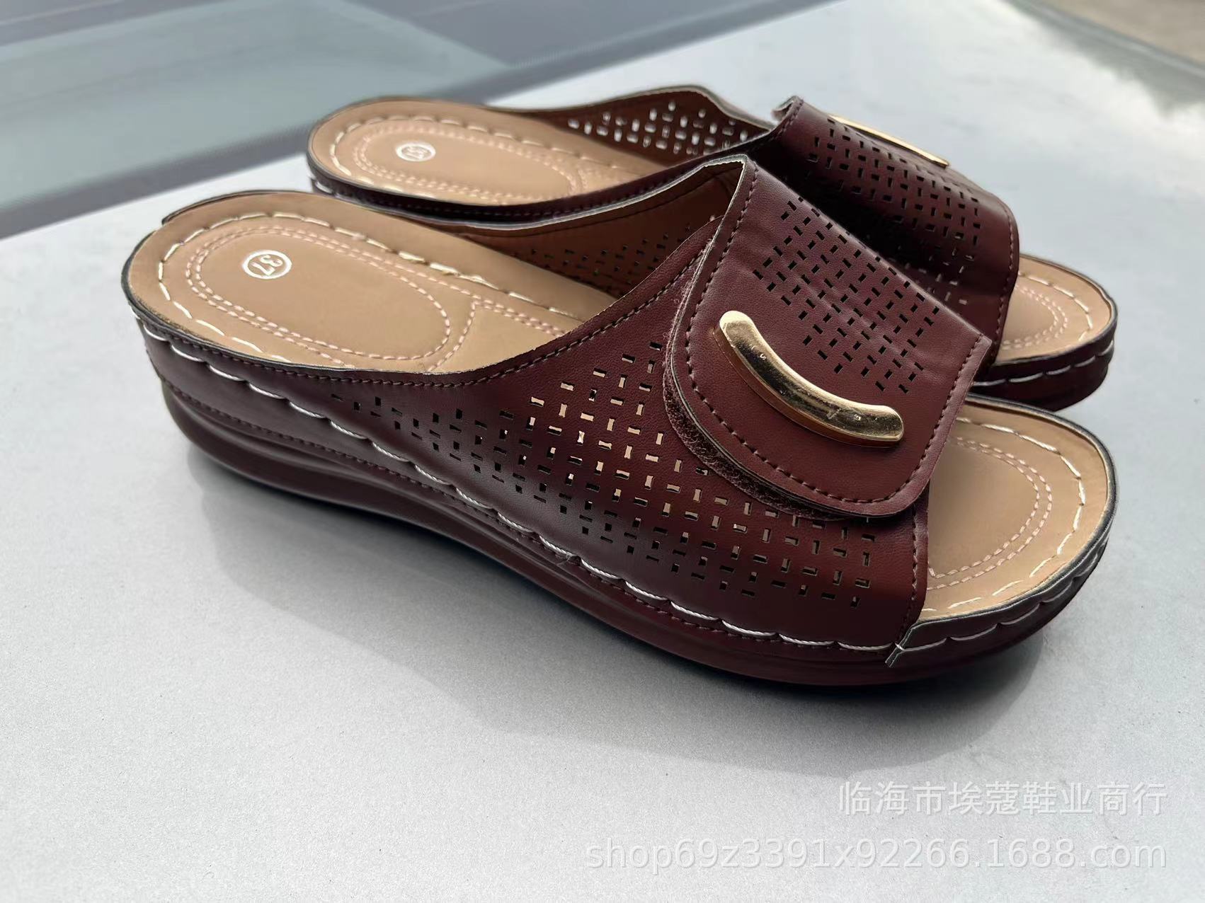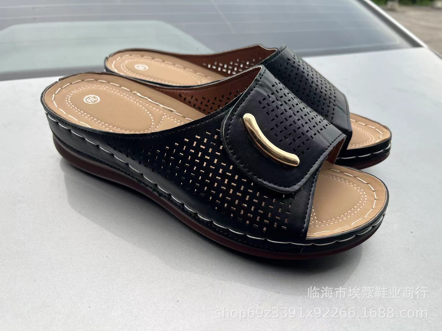 2023 크로스 보더 새로운 유럽과 미국 플러스 사이즈 캐주얼 라운드 헤드 복합 버클 PU 가죽 웨지 슬리퍼 여성용스토어 가기