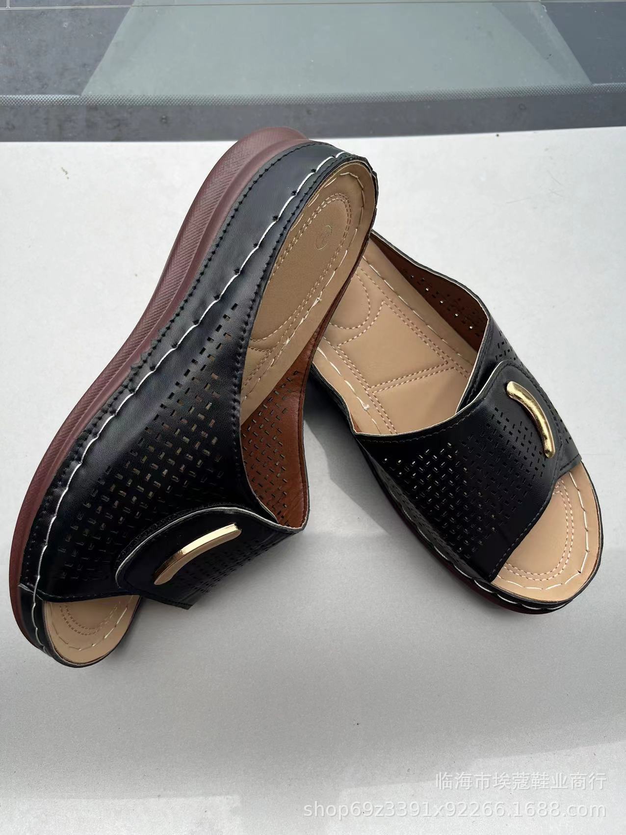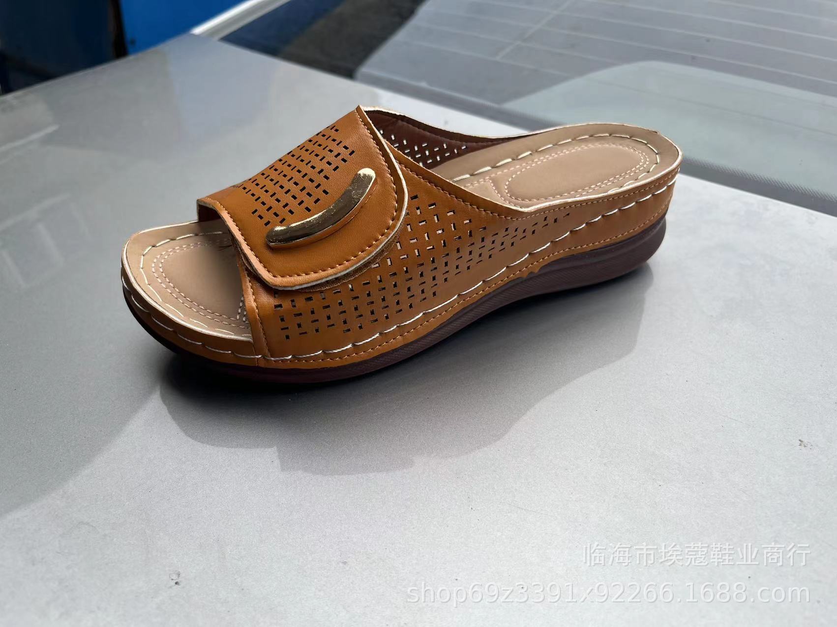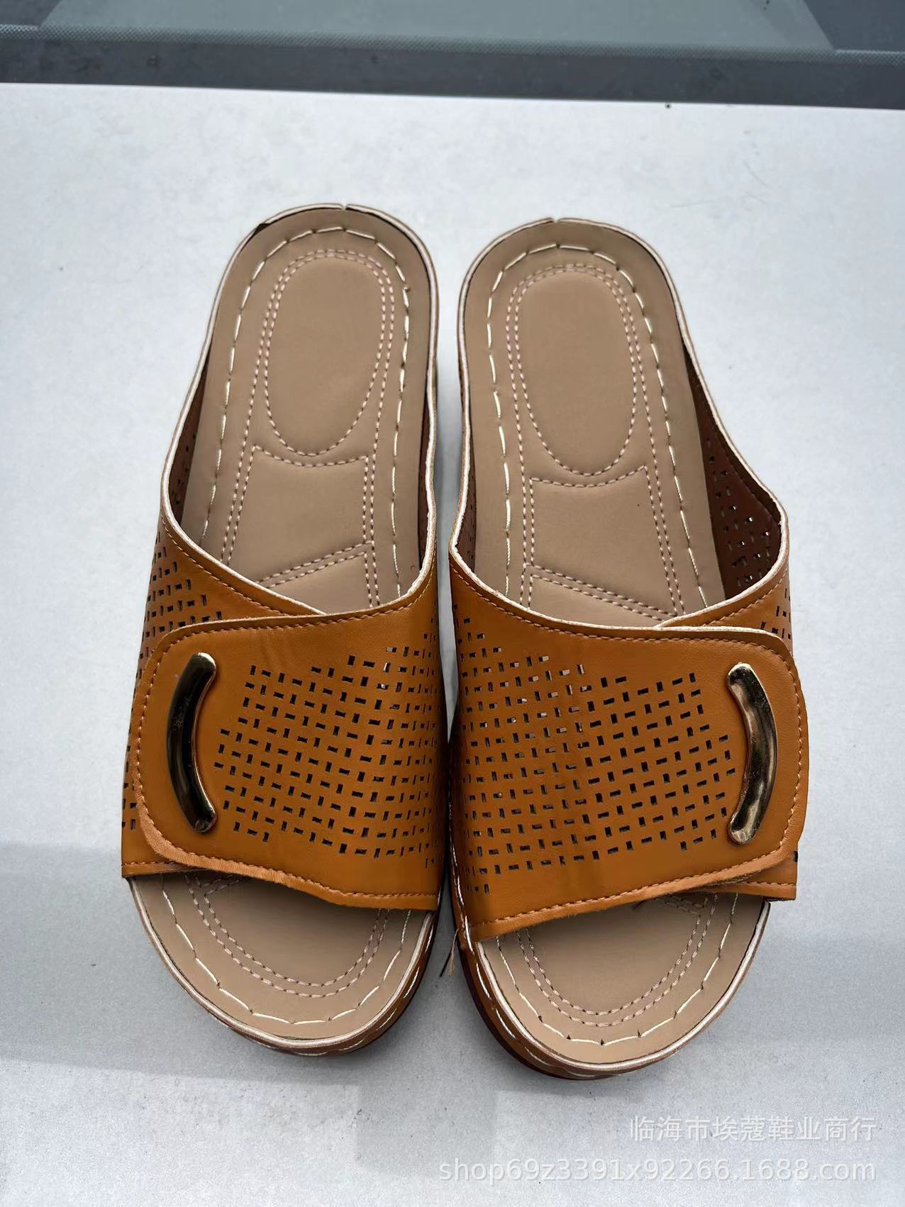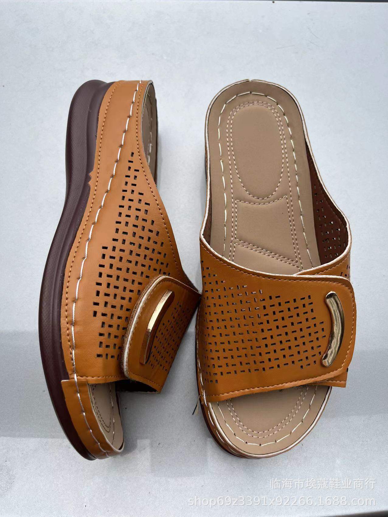 2023 크로스 보더 새로운 유럽과 미국 플러스 사이즈 캐주얼 라운드 헤드 복합 버클 PU 가죽 웨지 슬리퍼 여성용스토어 가기