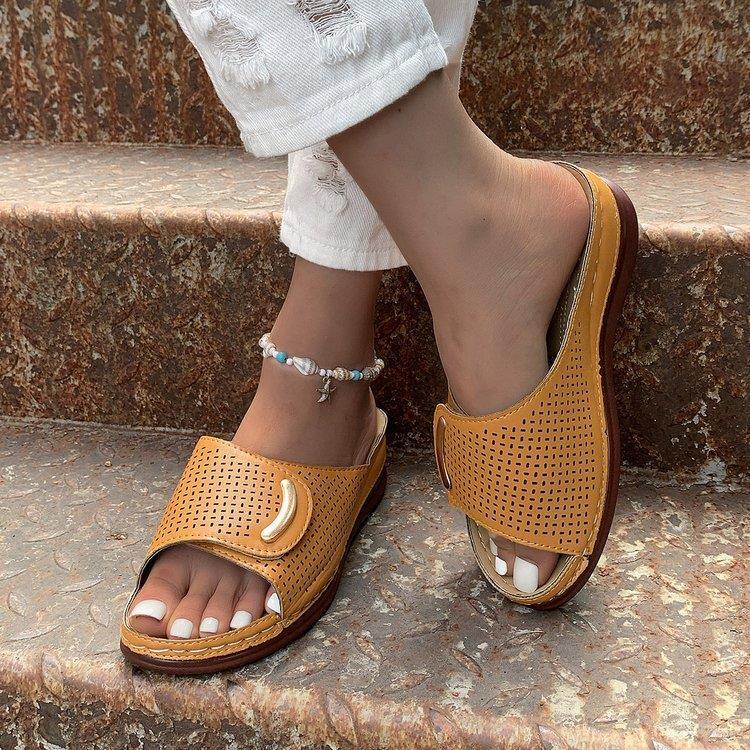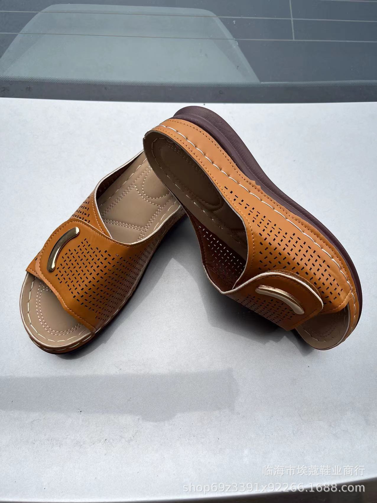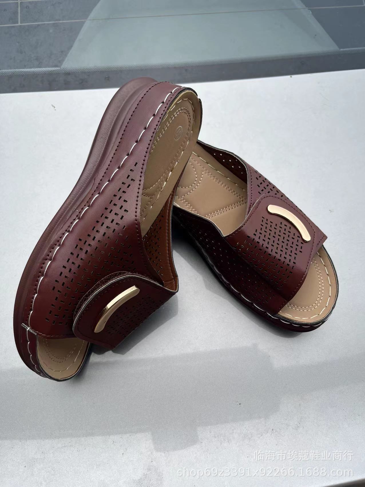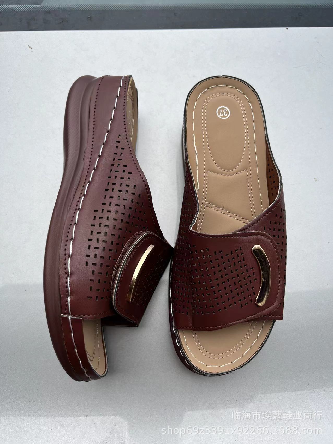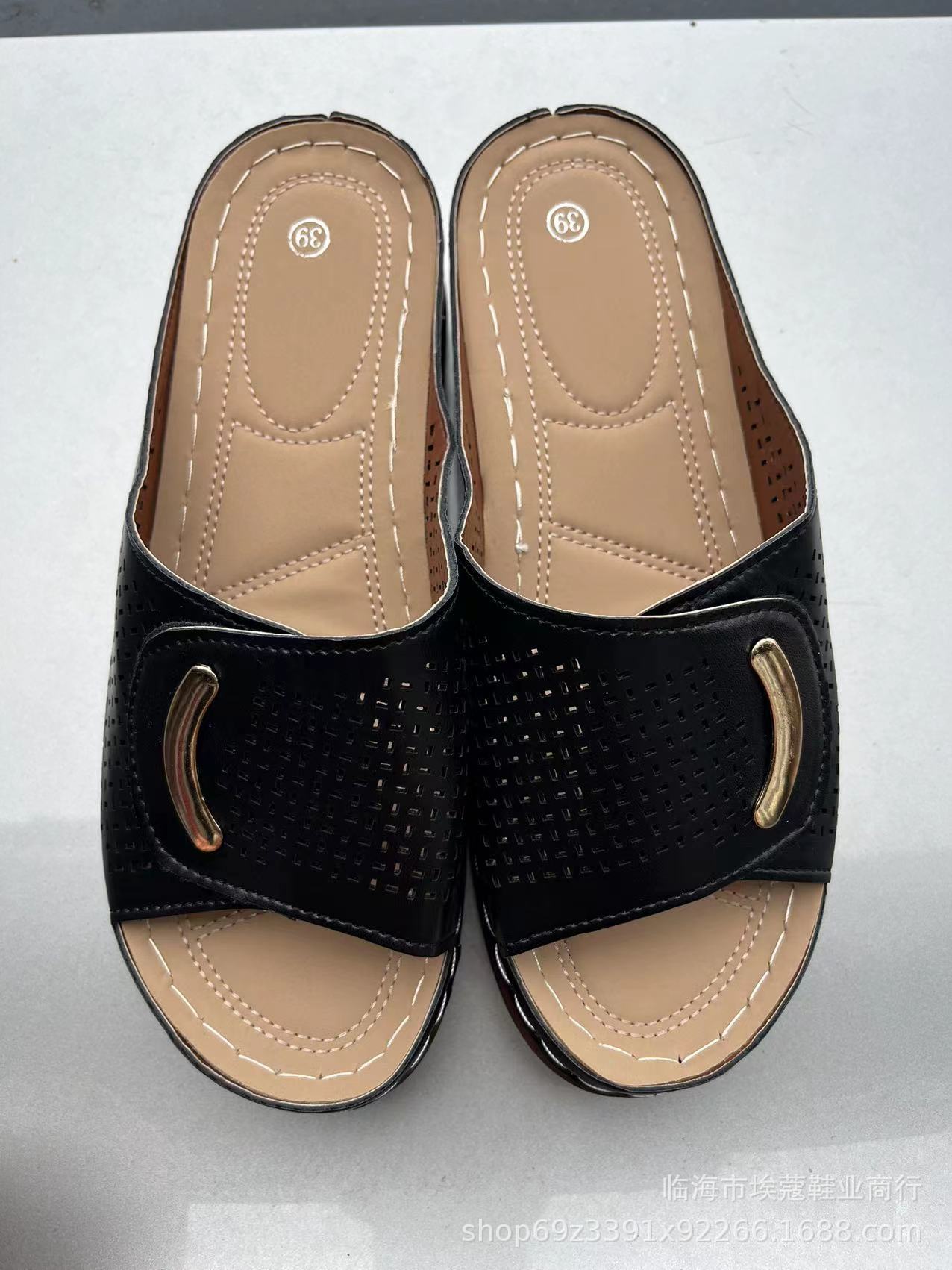 2023 크로스 보더 새로운 유럽과 미국 플러스 사이즈 캐주얼 라운드 헤드 복합 버클 PU 가죽 웨지 슬리퍼 여성용스토어 가기