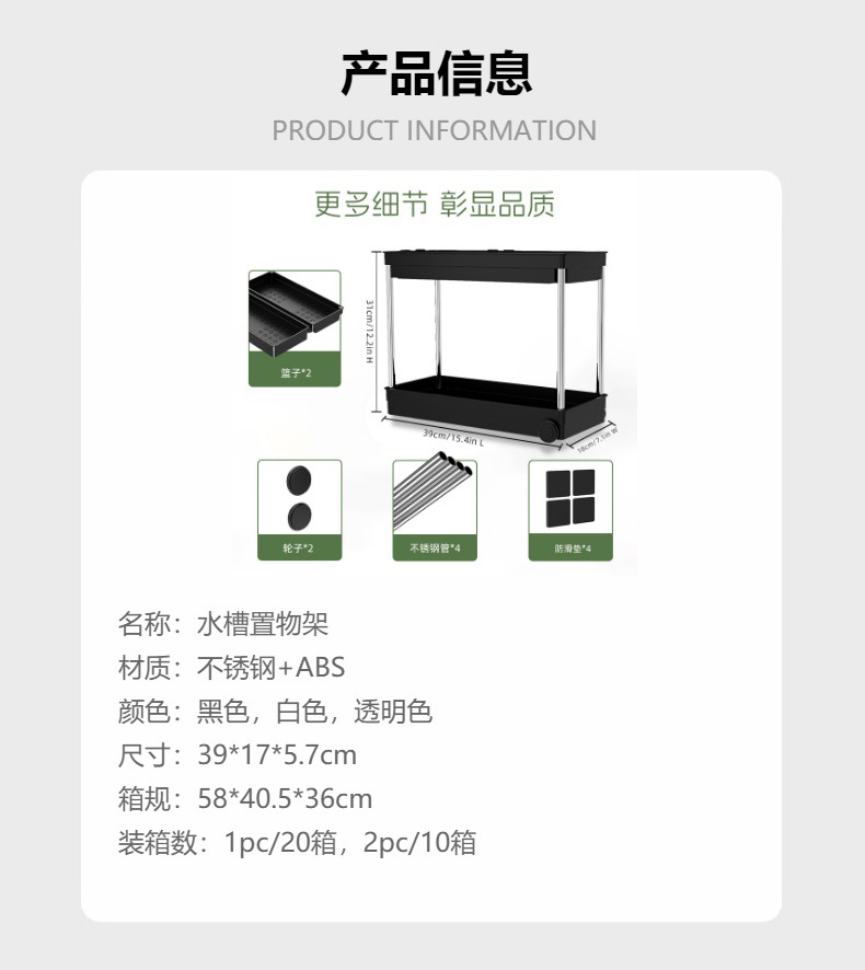 内盒子(内含两套双层置物架):18*40*10.7cm/1.4kg