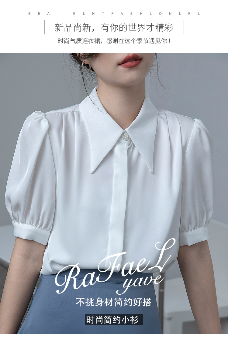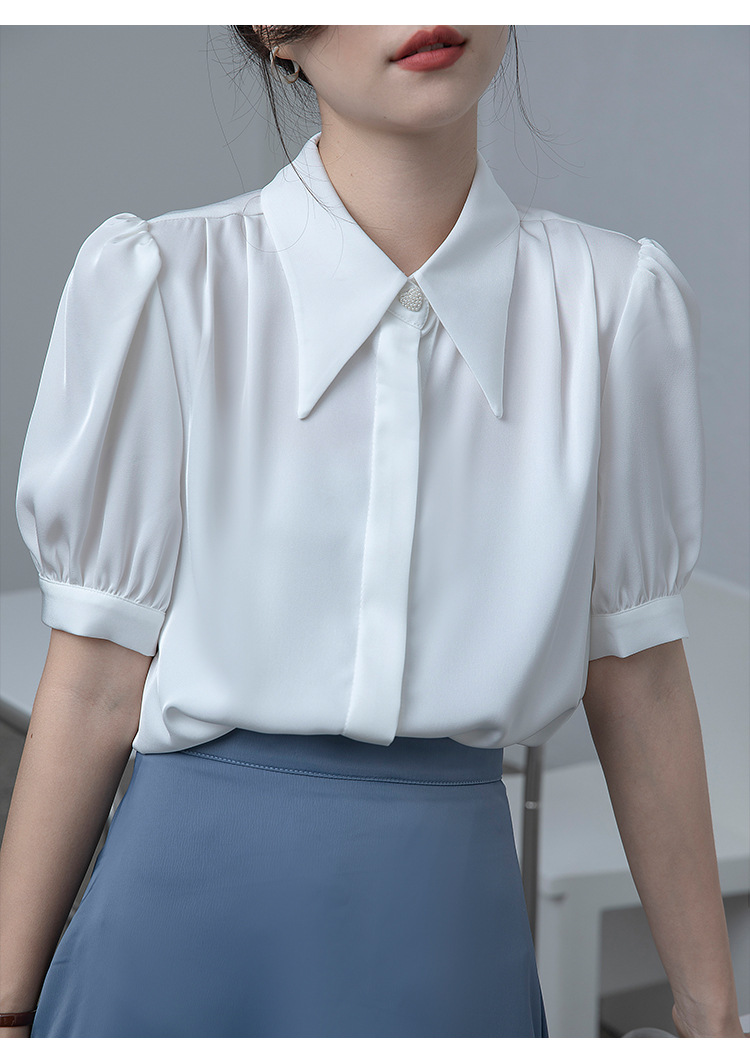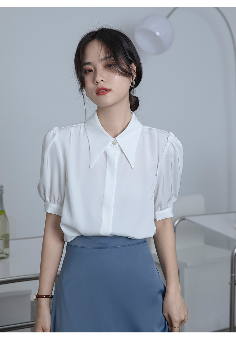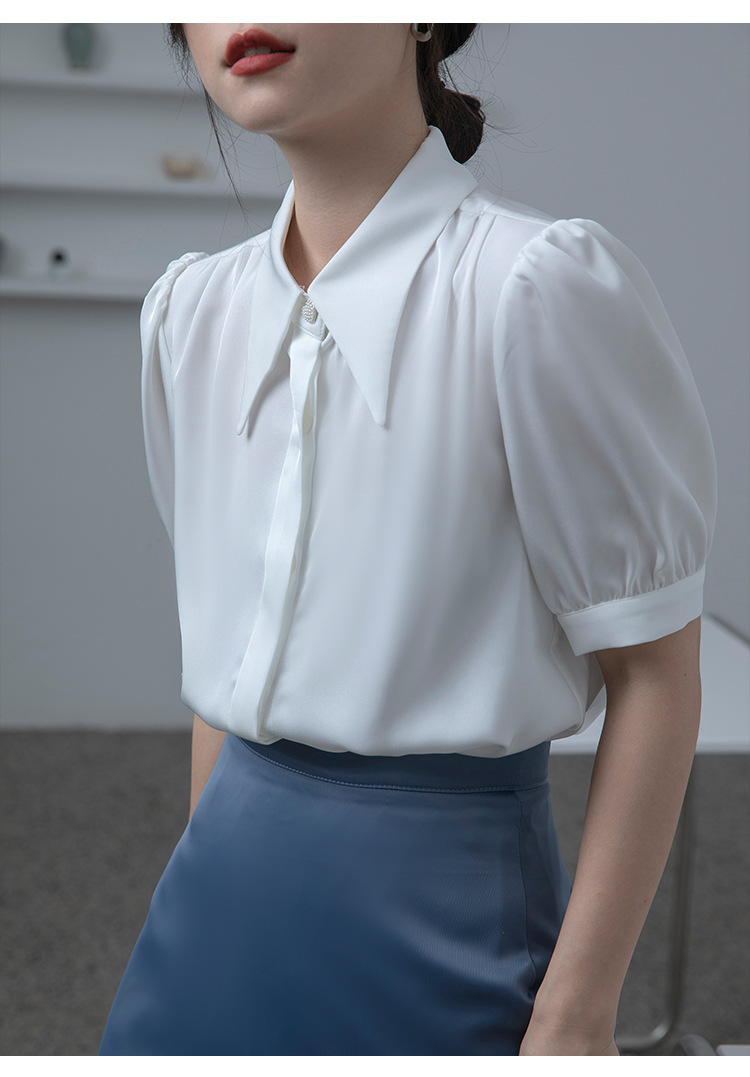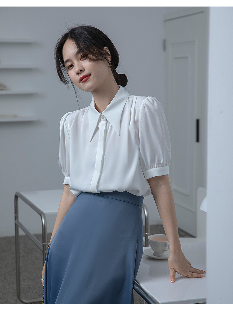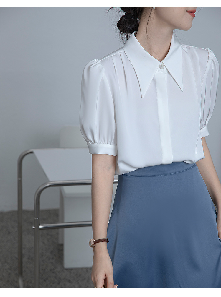 프랑스 스타일 우아한 흰색 셔츠 디자인 감각 틈새 짧은 소매 쉬폰 셔츠 여성용 여름 얇은 퍼프 슬리브 탑스토어 가기