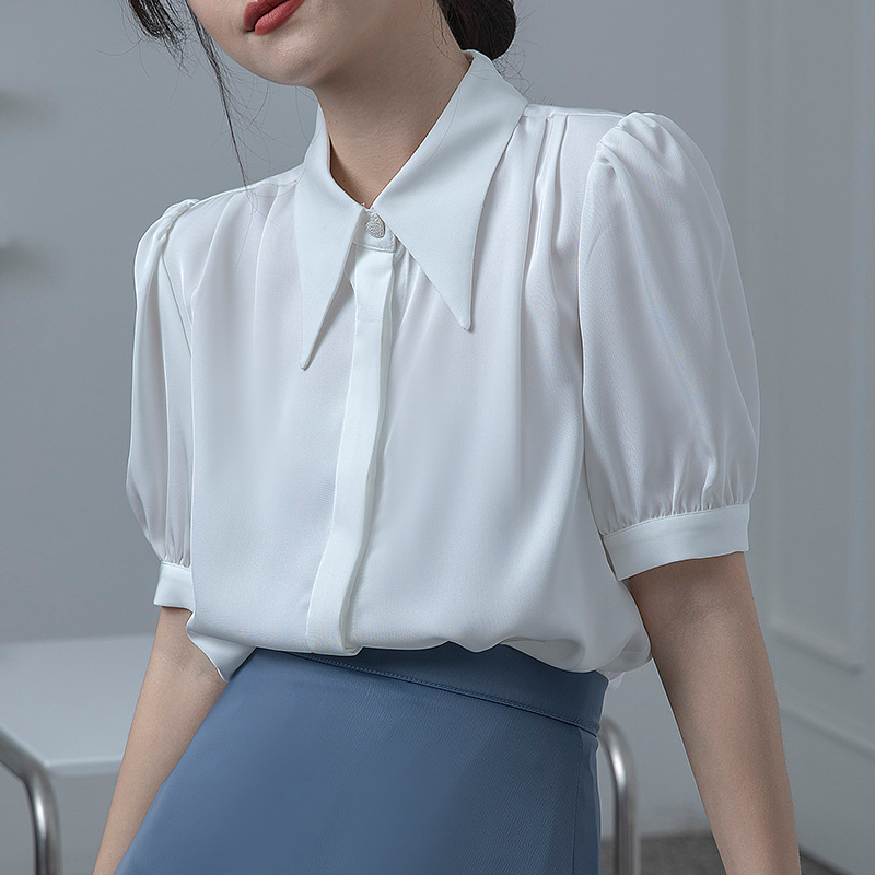 프랑스 스타일 우아한 흰색 셔츠 디자인 감각 틈새 짧은 소매 쉬폰 셔츠 여성용 여름 얇은 퍼프 슬리브 탑