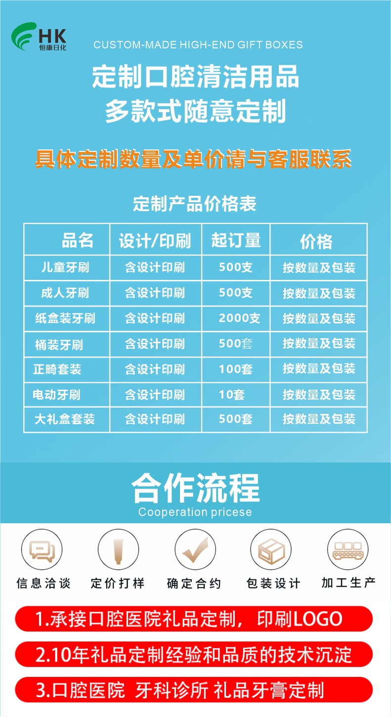 치과 병원 및 치과 클리닉은 로고를 인쇄하여 개원 기념품으로 치약, 성인 및 어린이용 칫솔, 잇몸 보호제를 홍보할 수 있습니다.스토어 가기