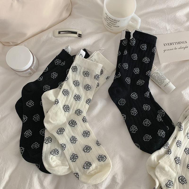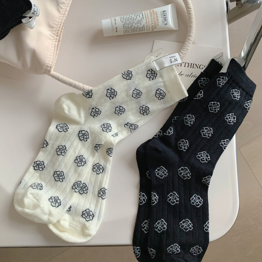 동백 양말 천 라벨 튜브 양말 여성용 조수 양말 흑백 작은 향기로운 바람 더미 양말 얇은