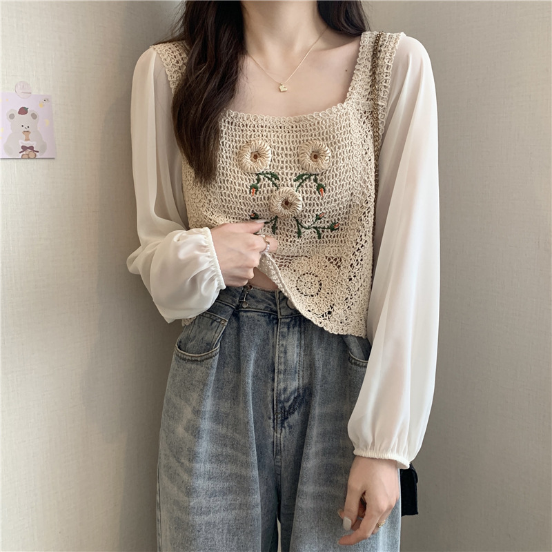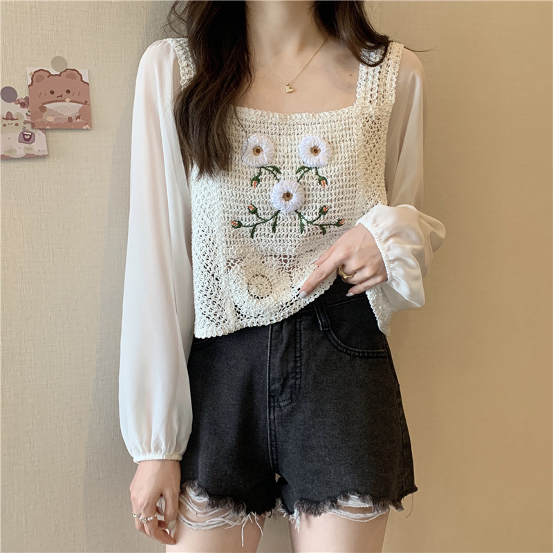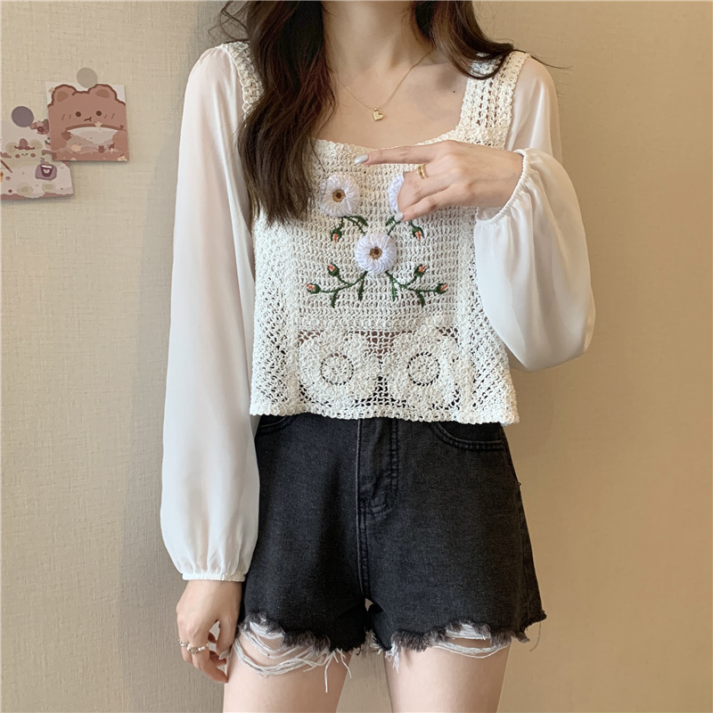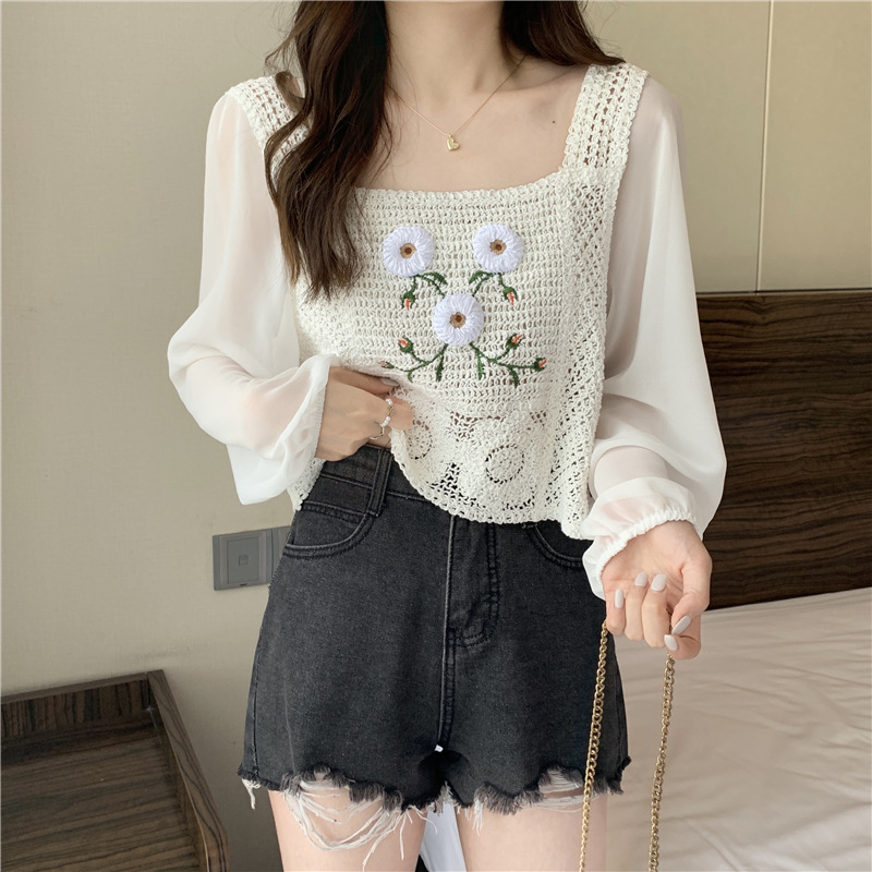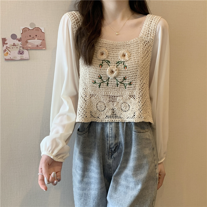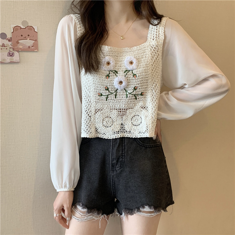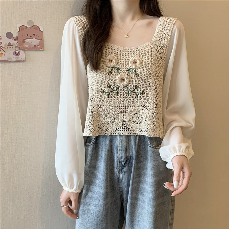 设计感镂空针织拼接方领衬衫女夏2023新款盐系防晒雪纺衫长袖上衣