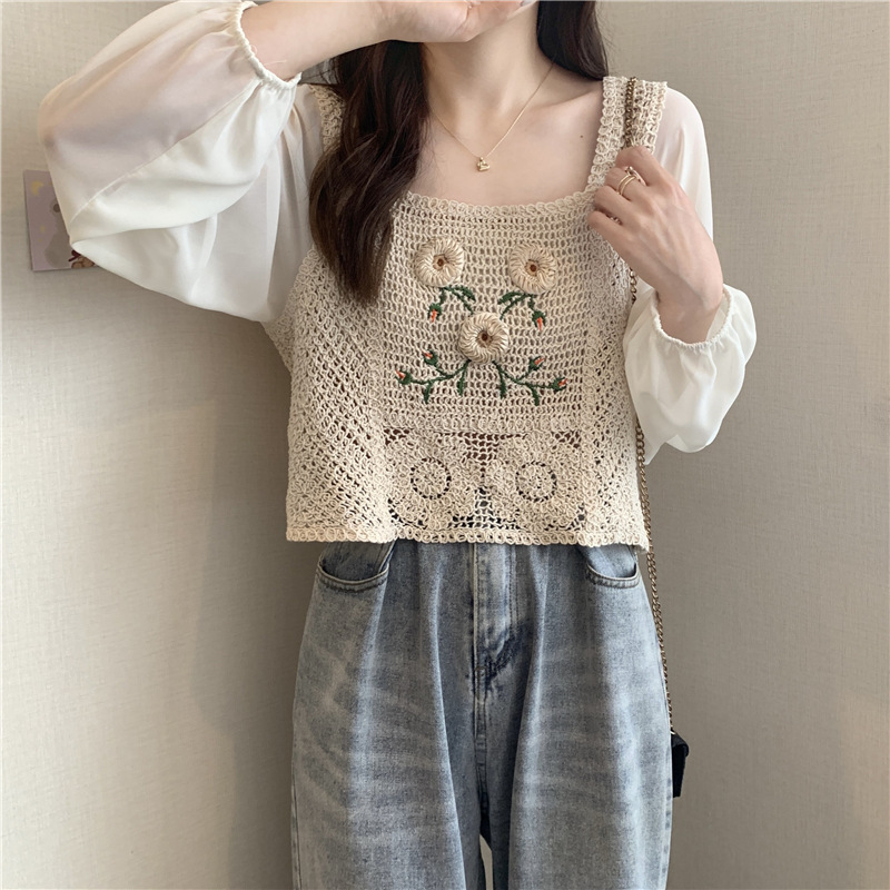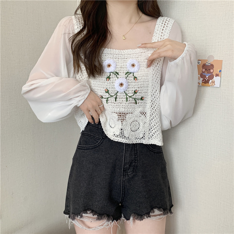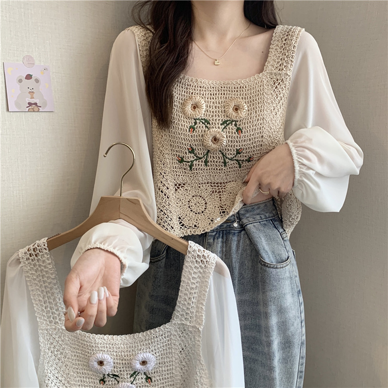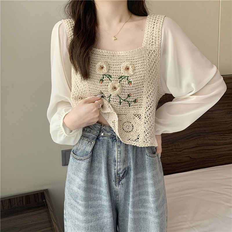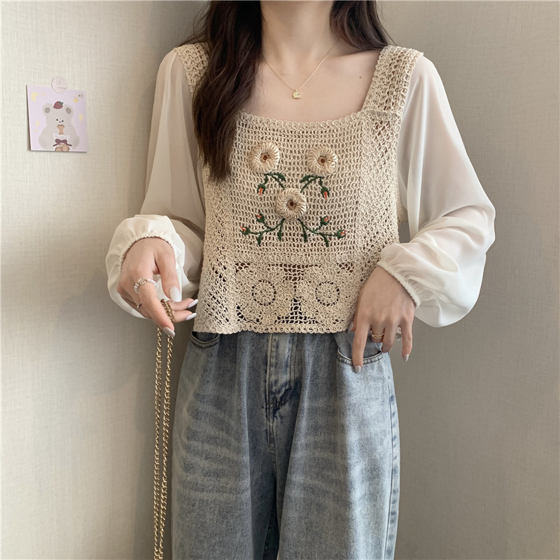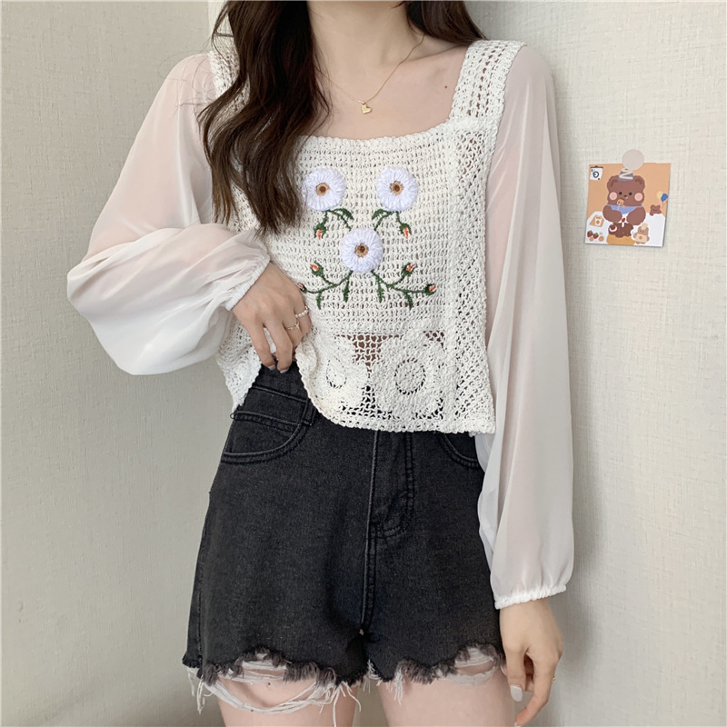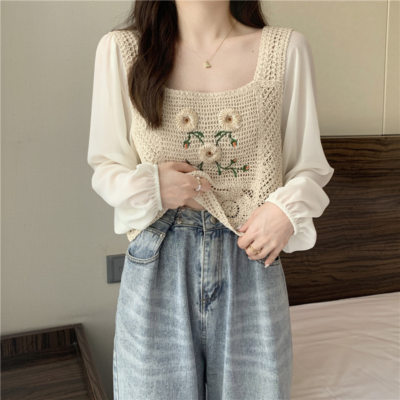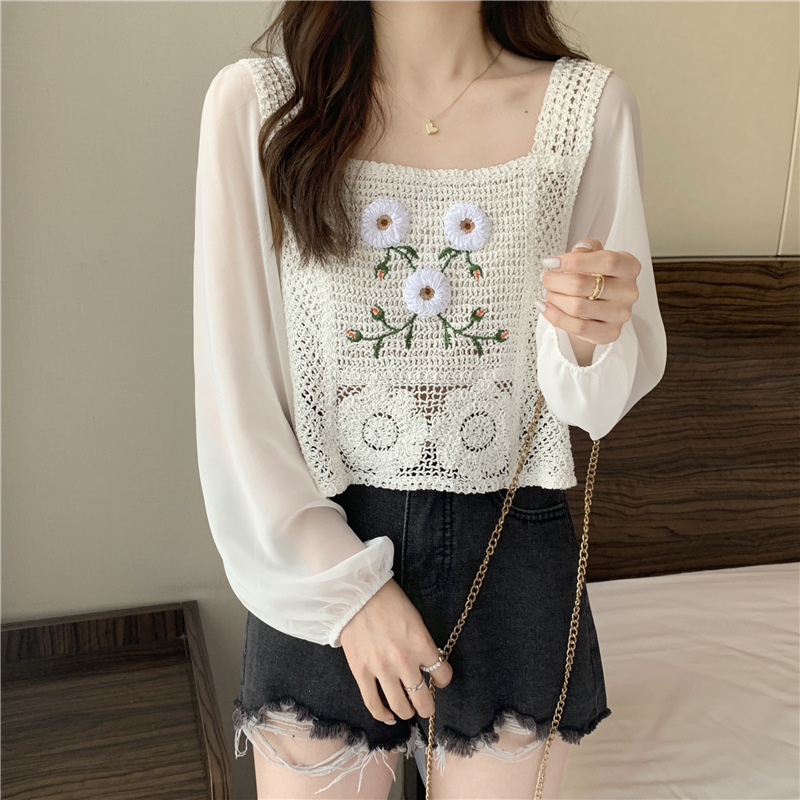设计感镂空针织拼接方领衬衫女夏2023新款盐系防晒雪纺衫长袖上衣