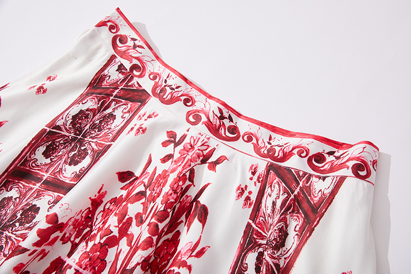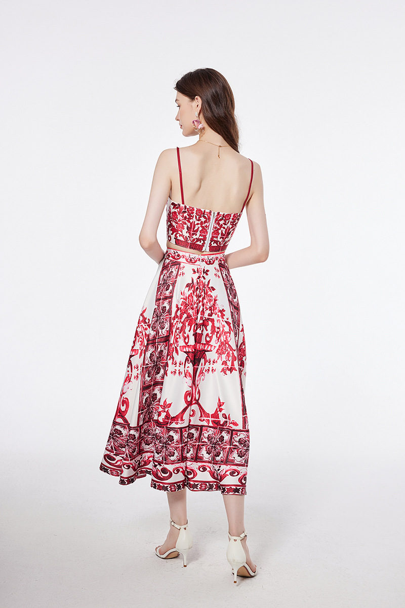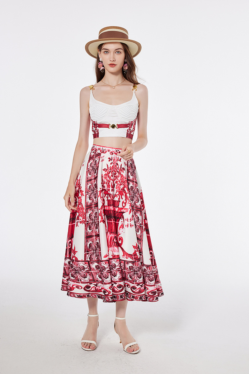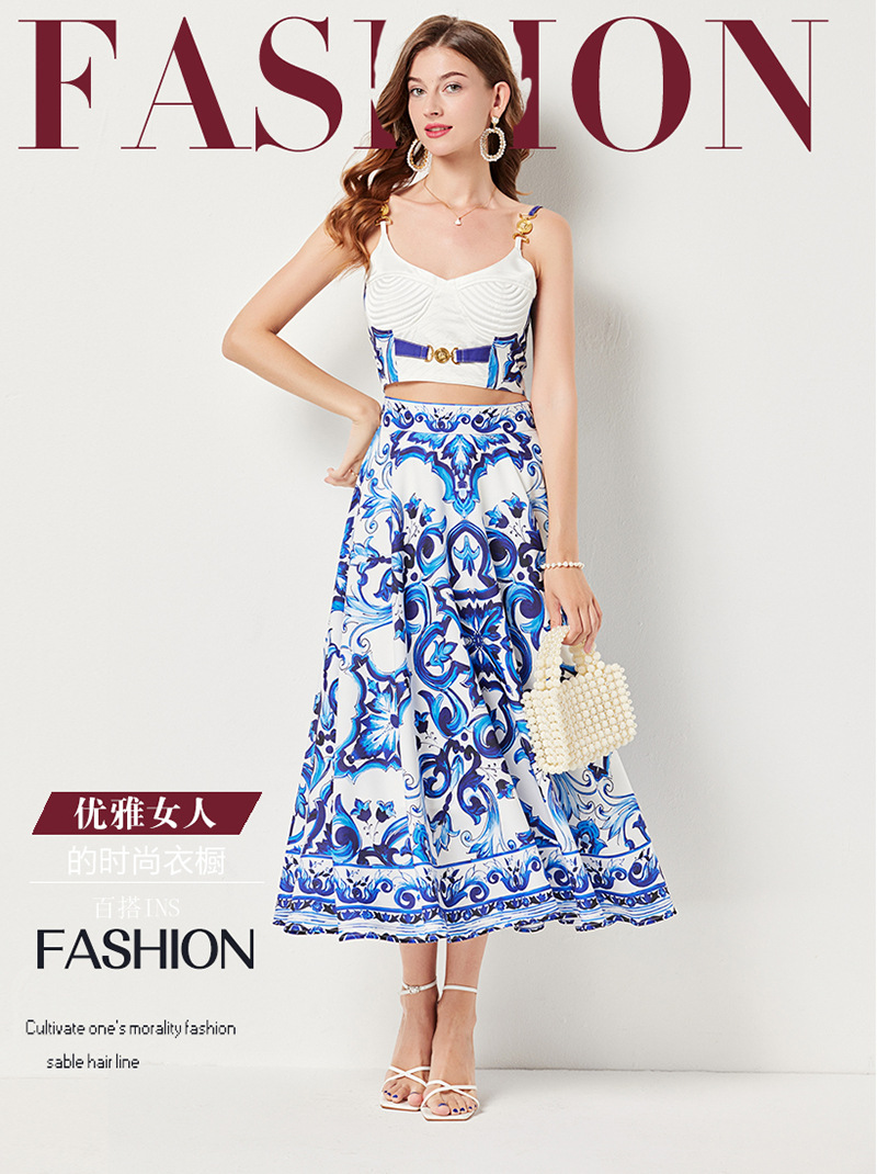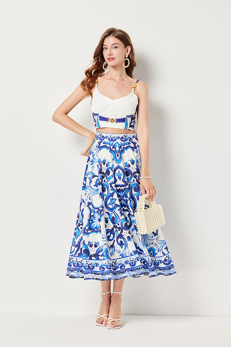 휴가 스타일 여성의 파란색과 흰색 도자기 인쇄 금속 버클 스티치 섹시한 스트랩 탑 하이 웨이스트 A 라인 긴 원피스 세트