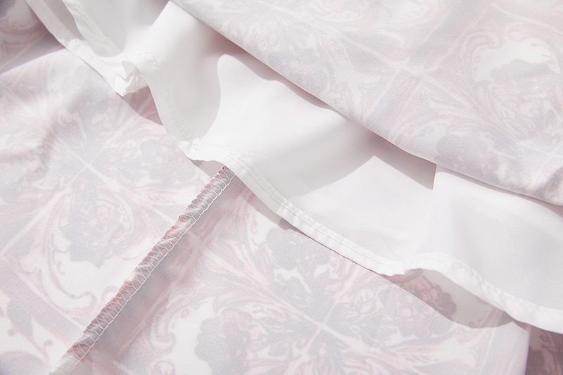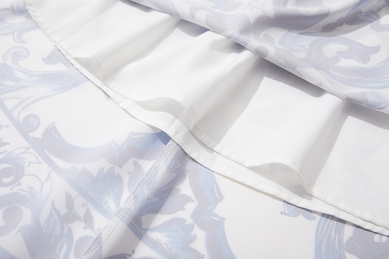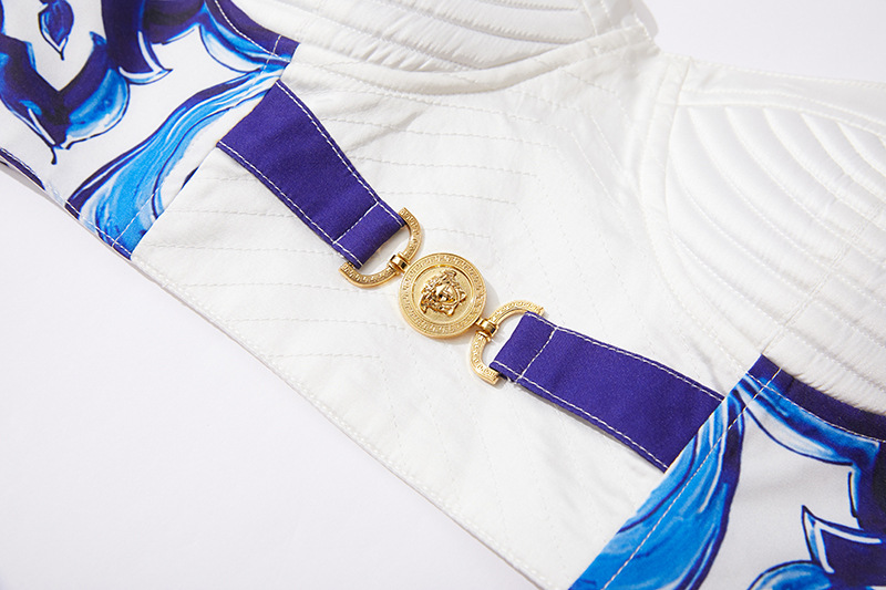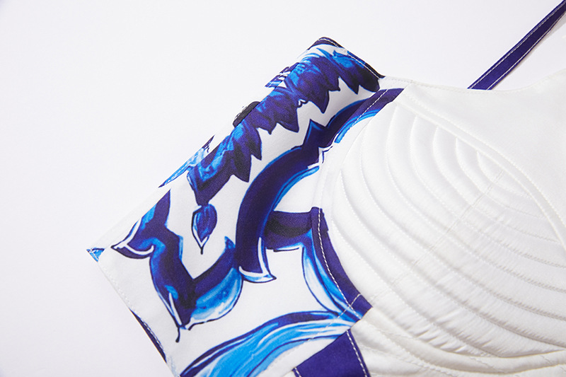휴가 스타일 여성의 파란색과 흰색 도자기 인쇄 금속 버클 스티치 섹시한 스트랩 탑 하이 웨이스트 A 라인 긴 원피스 세트스토어 가기