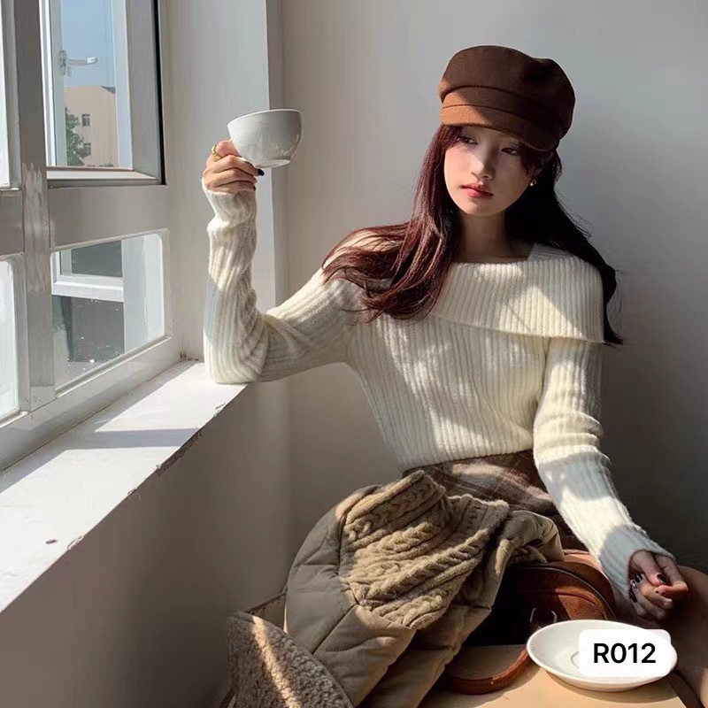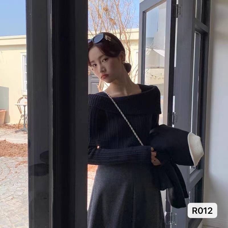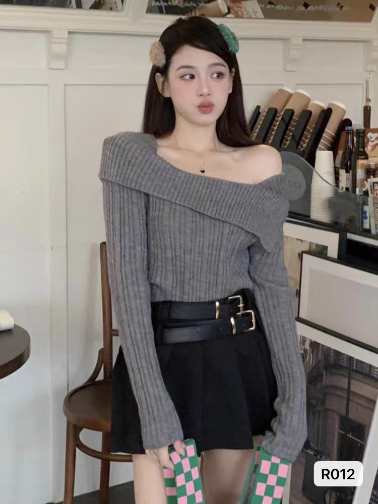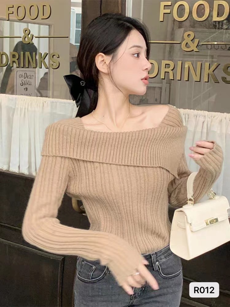 가을 2023 틈새 디자인 옷깃 숄더 탑 숄더 슬리밍 모든 매치 순수한 욕망 스타일 여성용 니트 의류스토어 가기