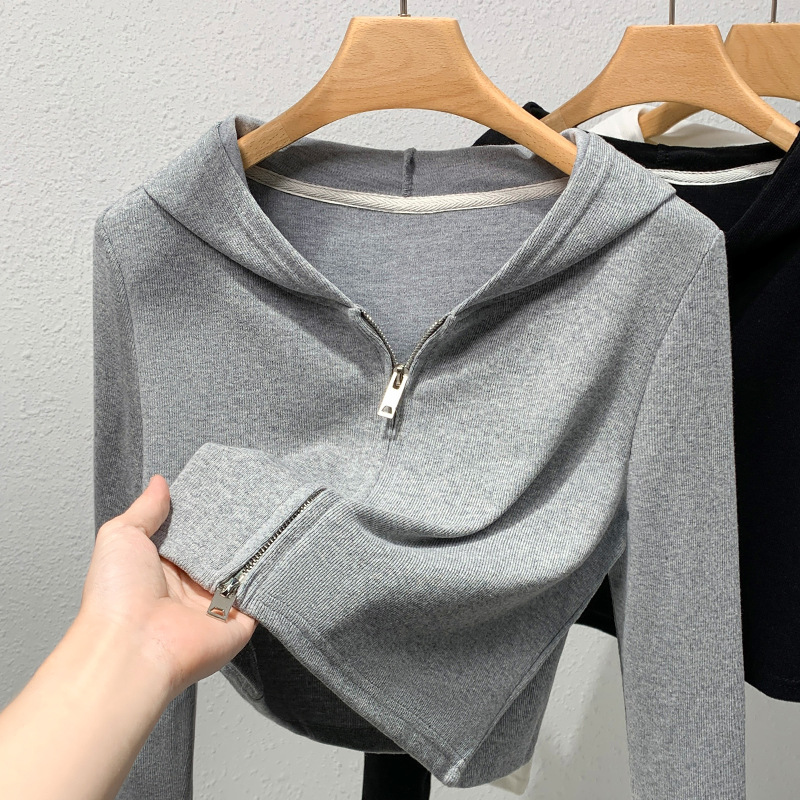 지퍼 후드 티셔츠 여성 회색 v 넥 긴팔 짧은 캐주얼 재킷 봄, 가을 2025 새로운 여성 의류스토어 가기