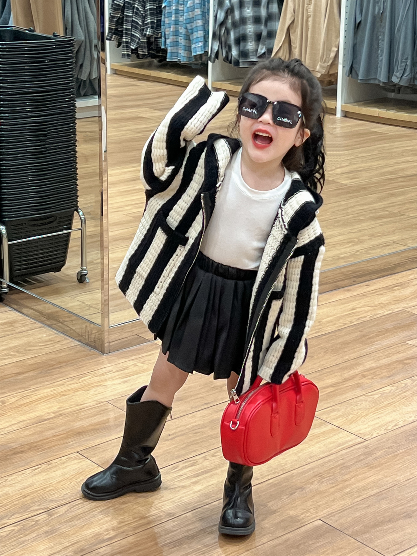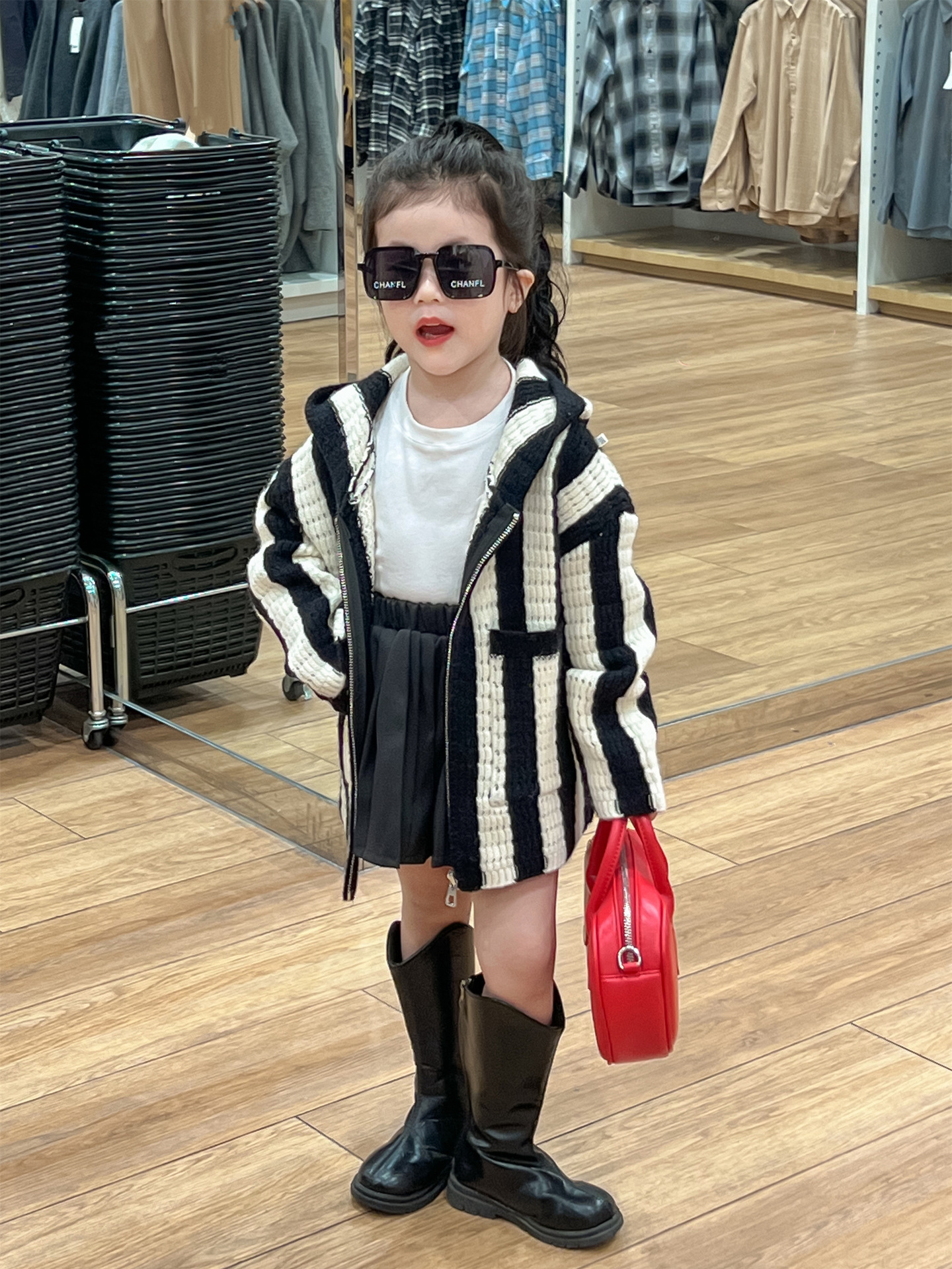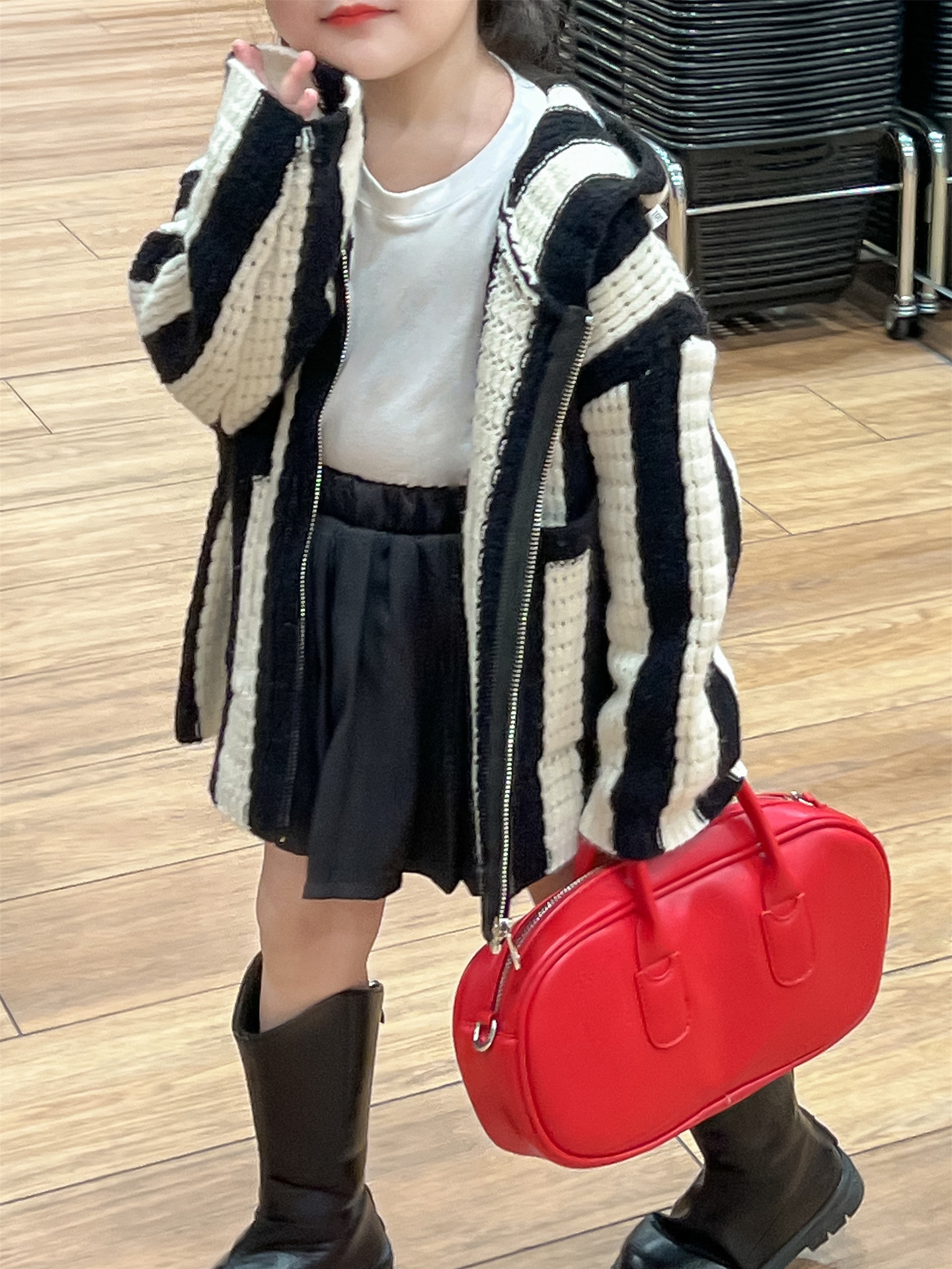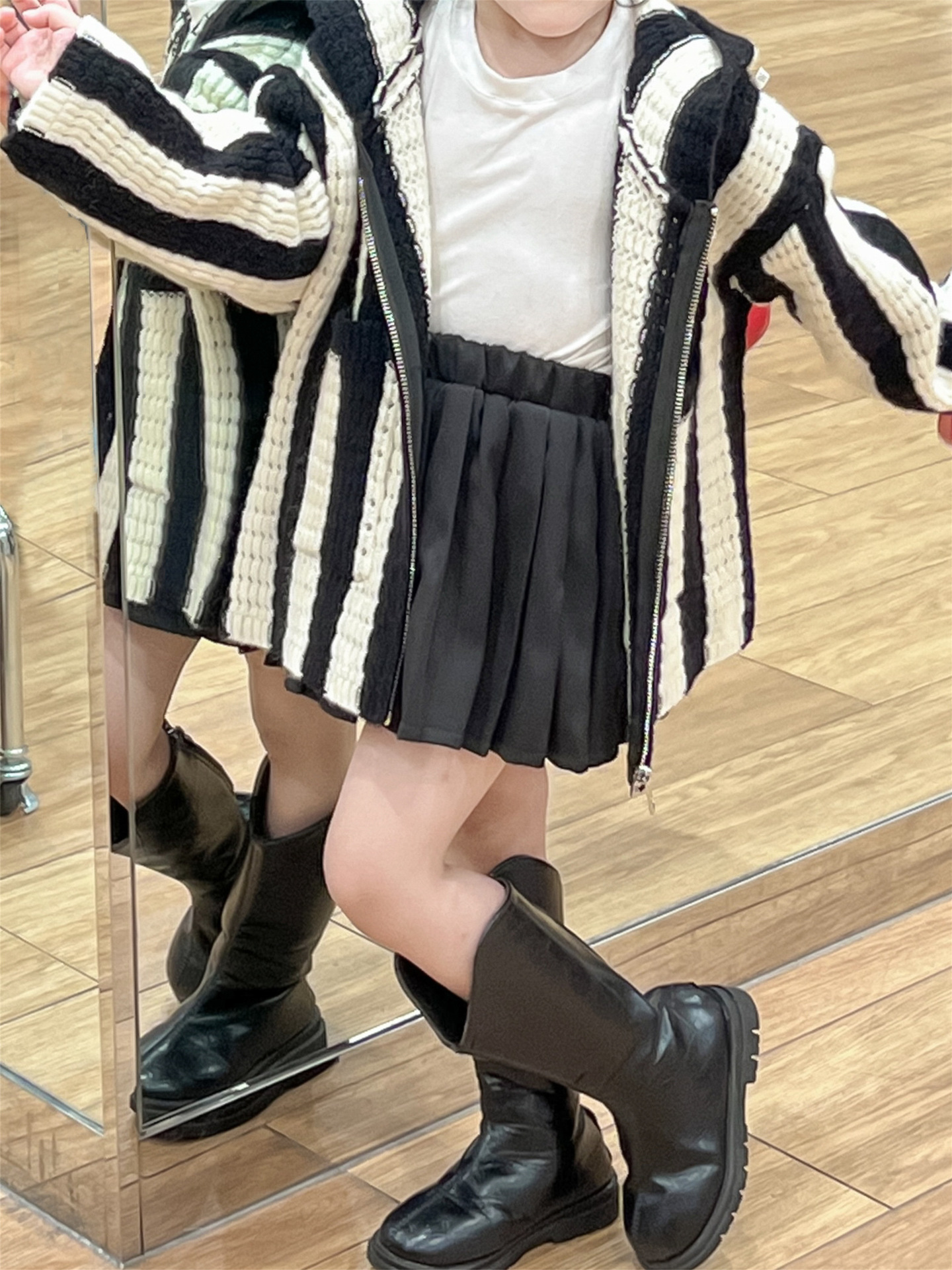 가을 달콤한 멋진 소녀 흑백 와이드 세로 울 후드 지퍼 카디건 재킷 + 검은 주름 치마 분할스토어 가기