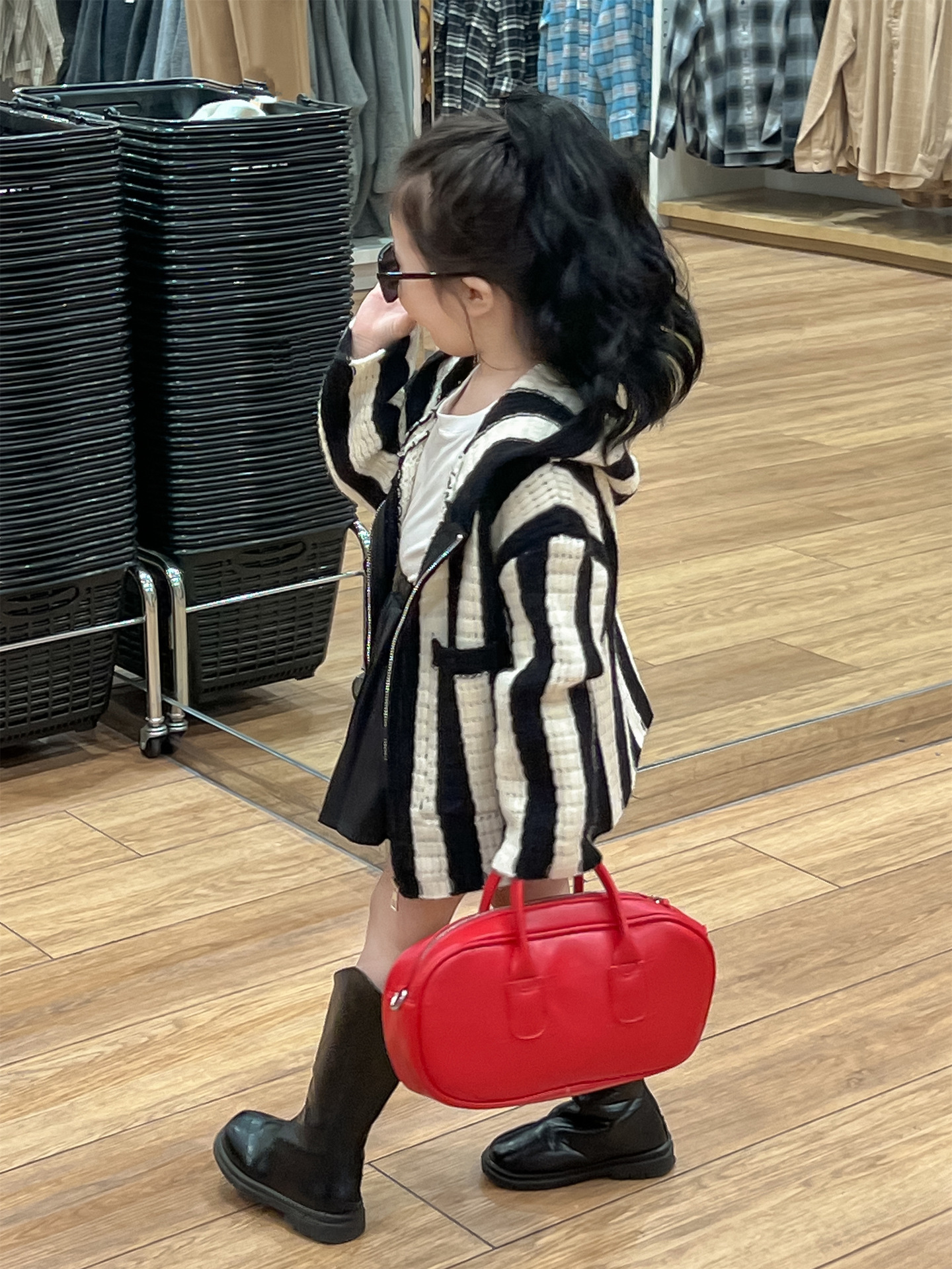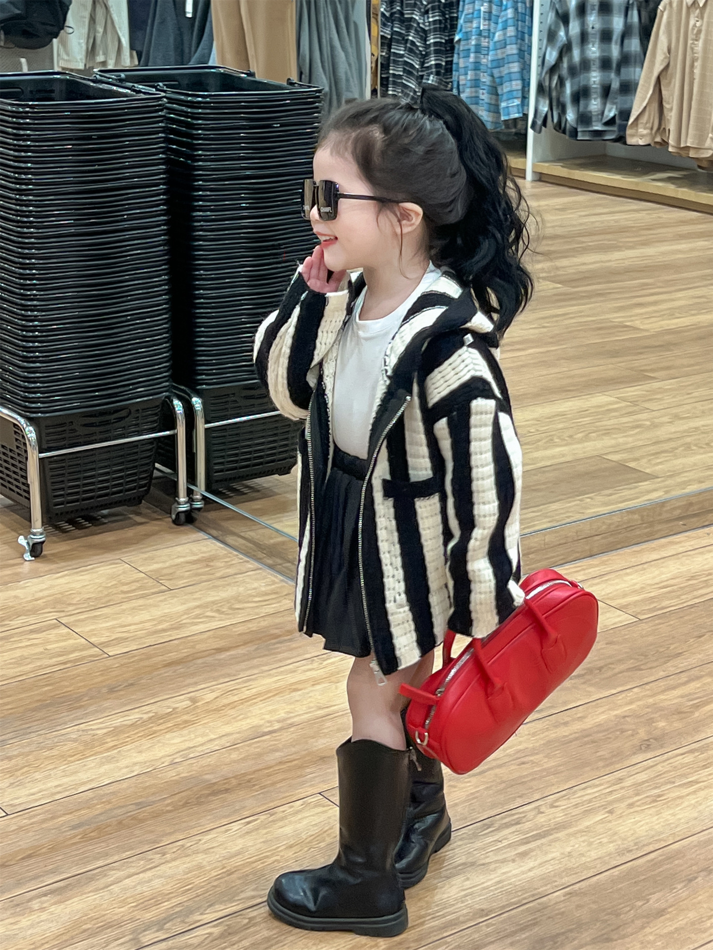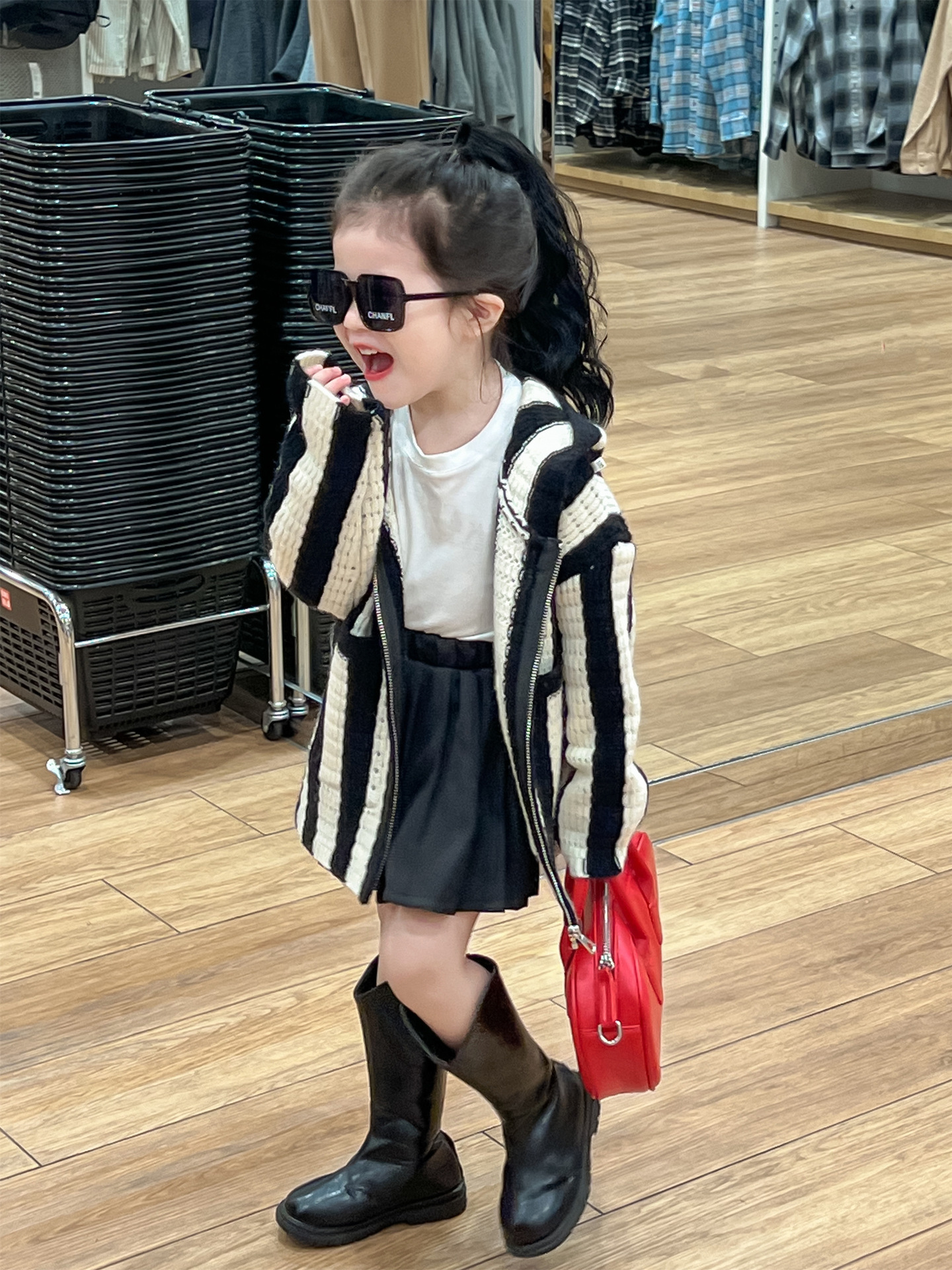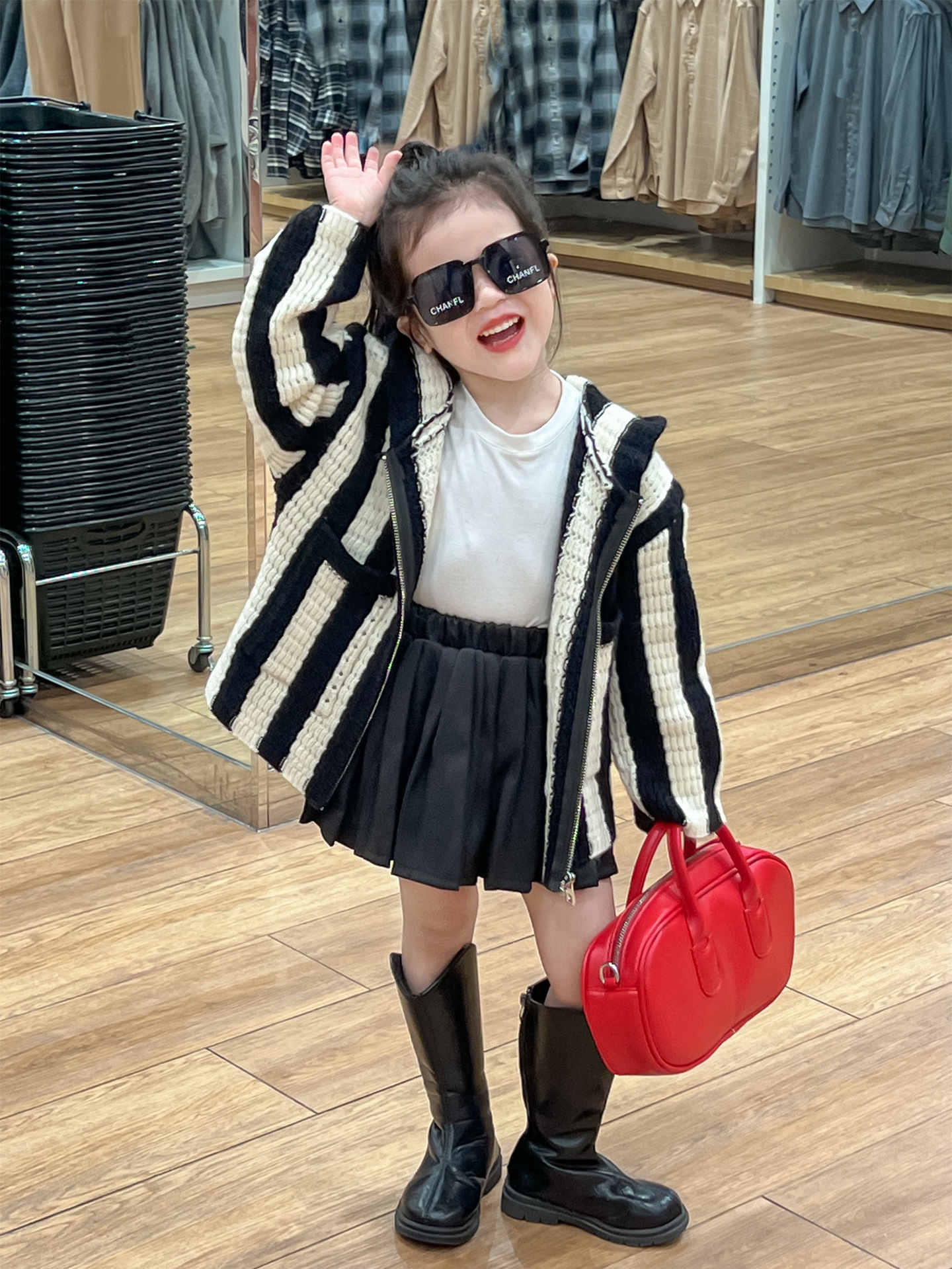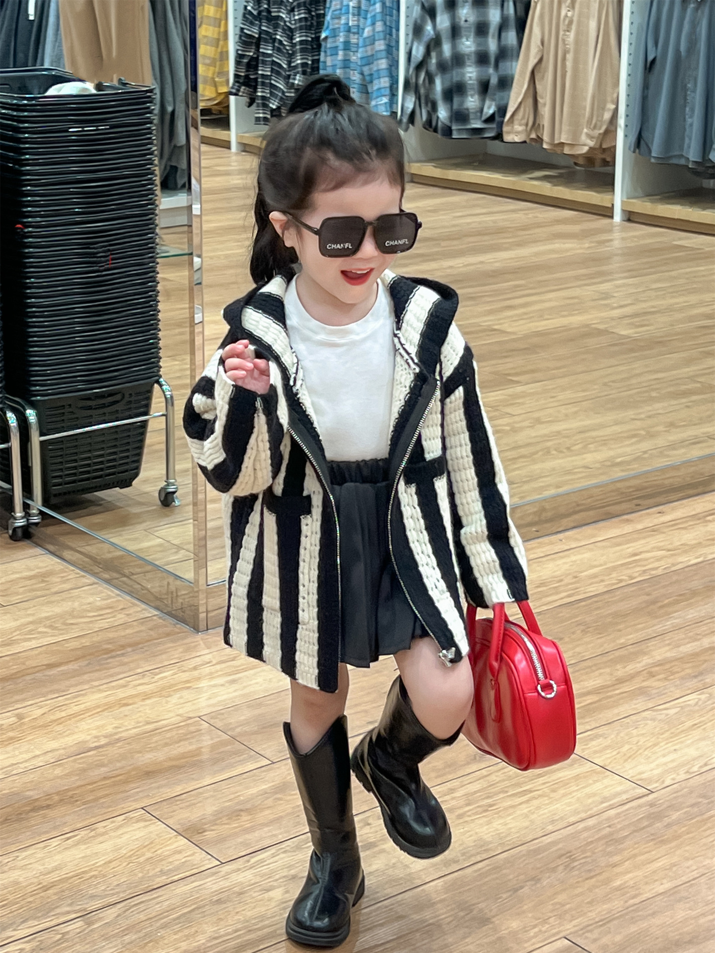 가을 달콤한 멋진 소녀 흑백 와이드 세로 울 후드 지퍼 카디건 재킷 + 검은 주름 치마 분할스토어 가기