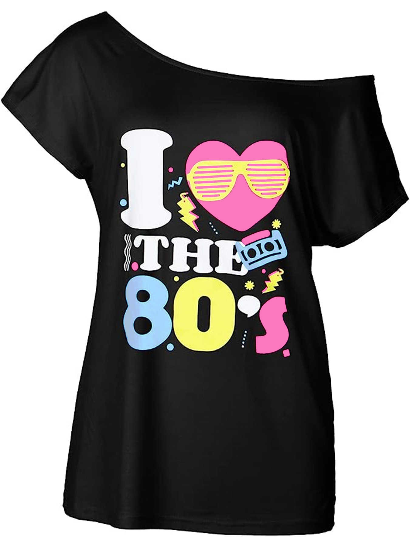 유럽과 미국의 느낌 슬림 경사 어깨 티셔츠 나는 80 년대 편지 사랑 그래픽 인쇄 여성 탑