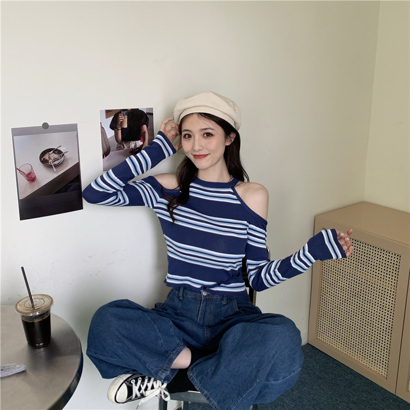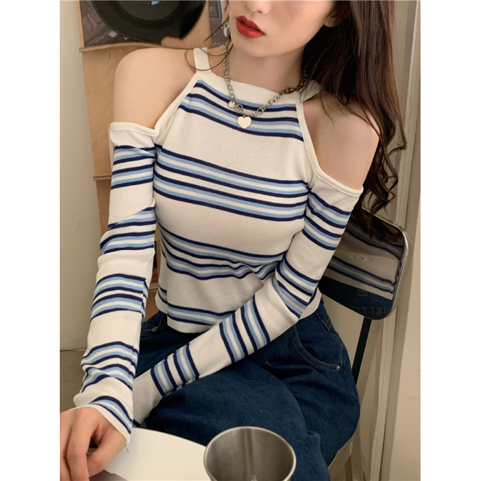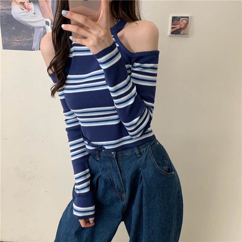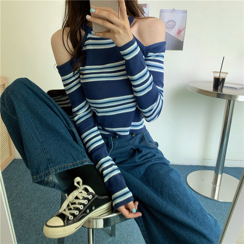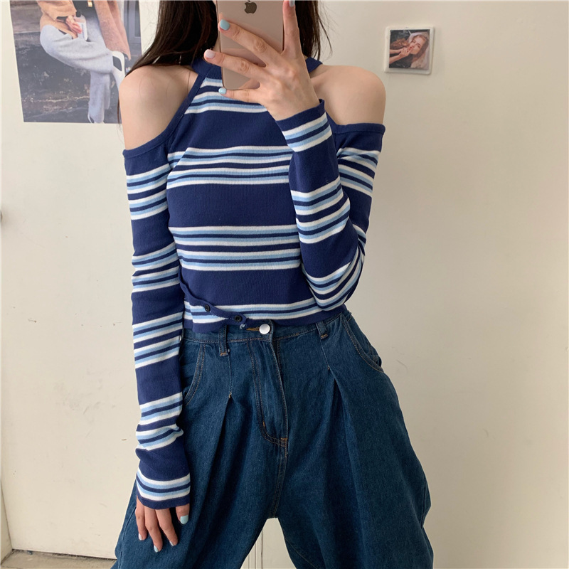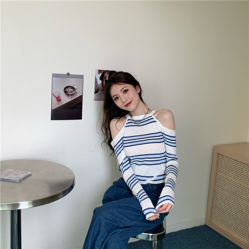 봄과 가을 새로운 여성의 니트 셔츠 인터넷 연예인 핫 스타일 교수형 목 어깨 스트라이프 긴 소매 내부베이스 셔츠 탑 착용스토어 가기