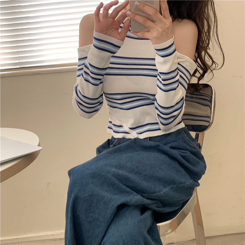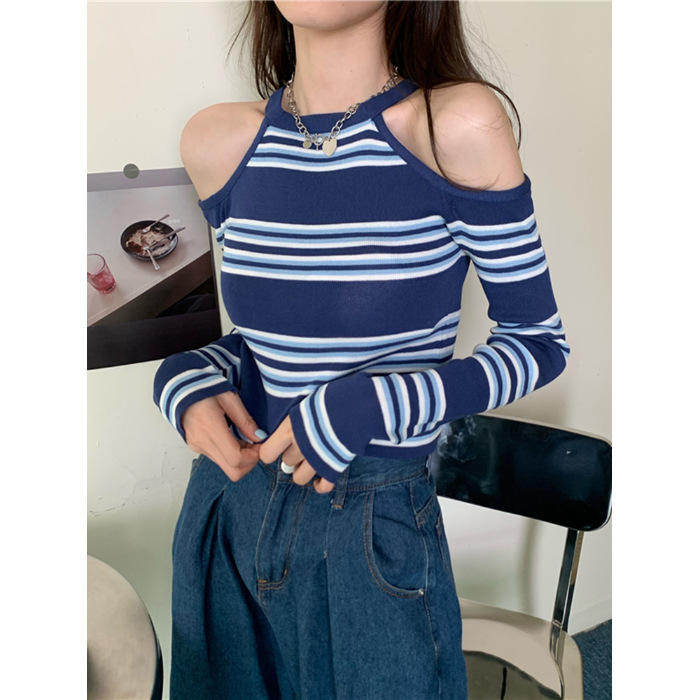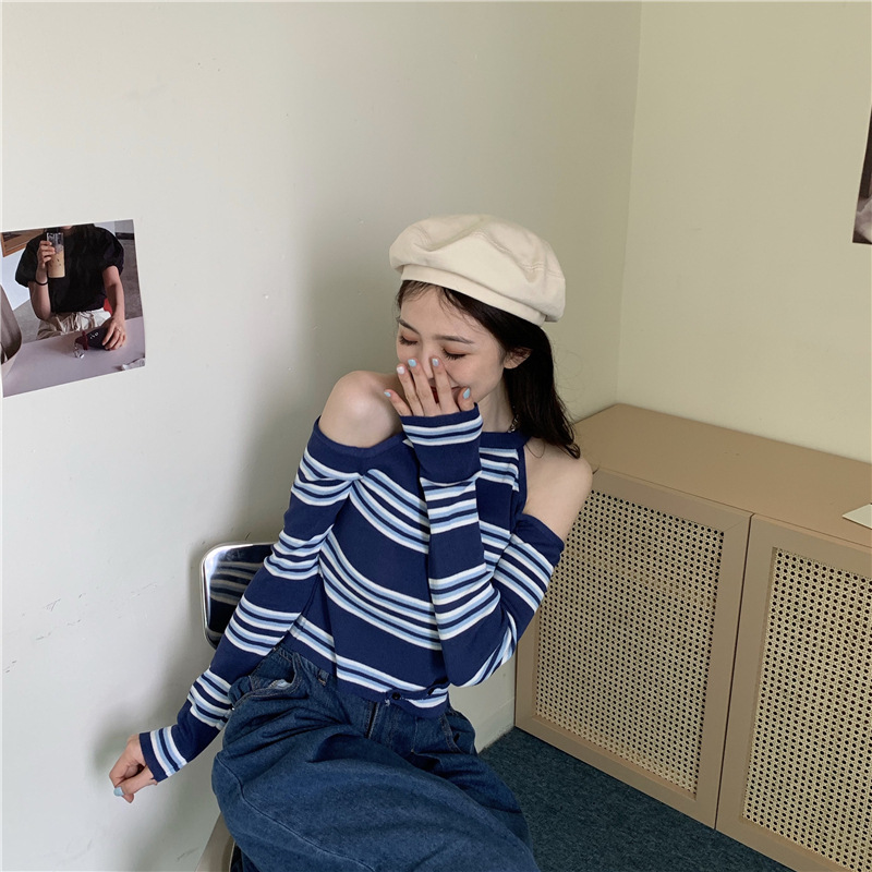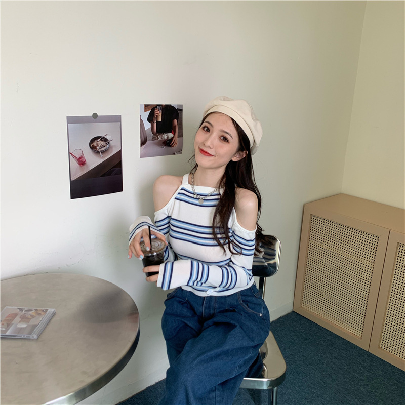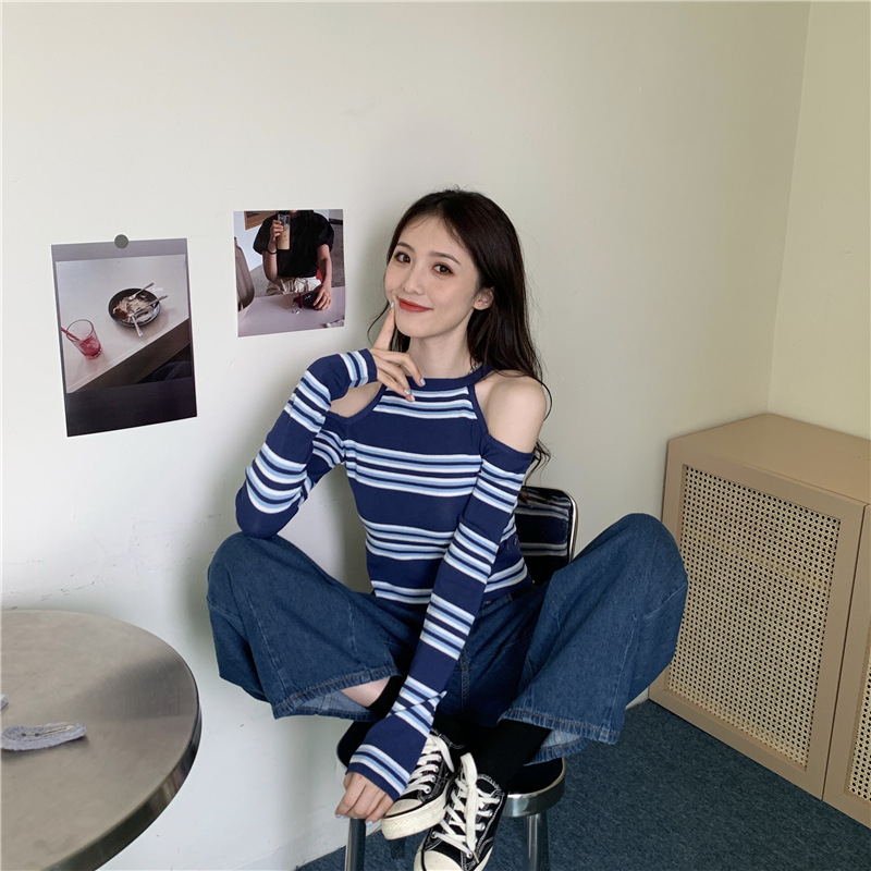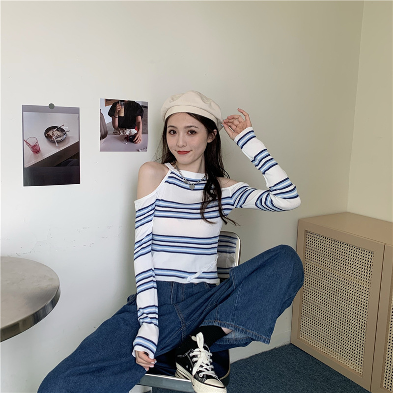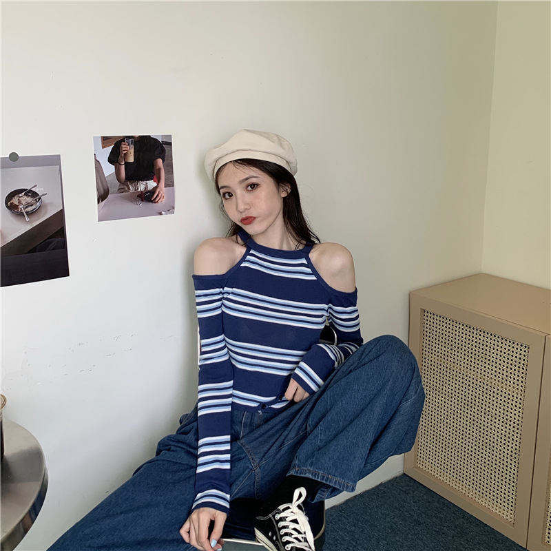 봄과 가을 새로운 여성의 니트 셔츠 인터넷 연예인 핫 스타일 교수형 목 어깨 스트라이프 긴 소매 내부베이스 셔츠 탑 착용스토어 가기