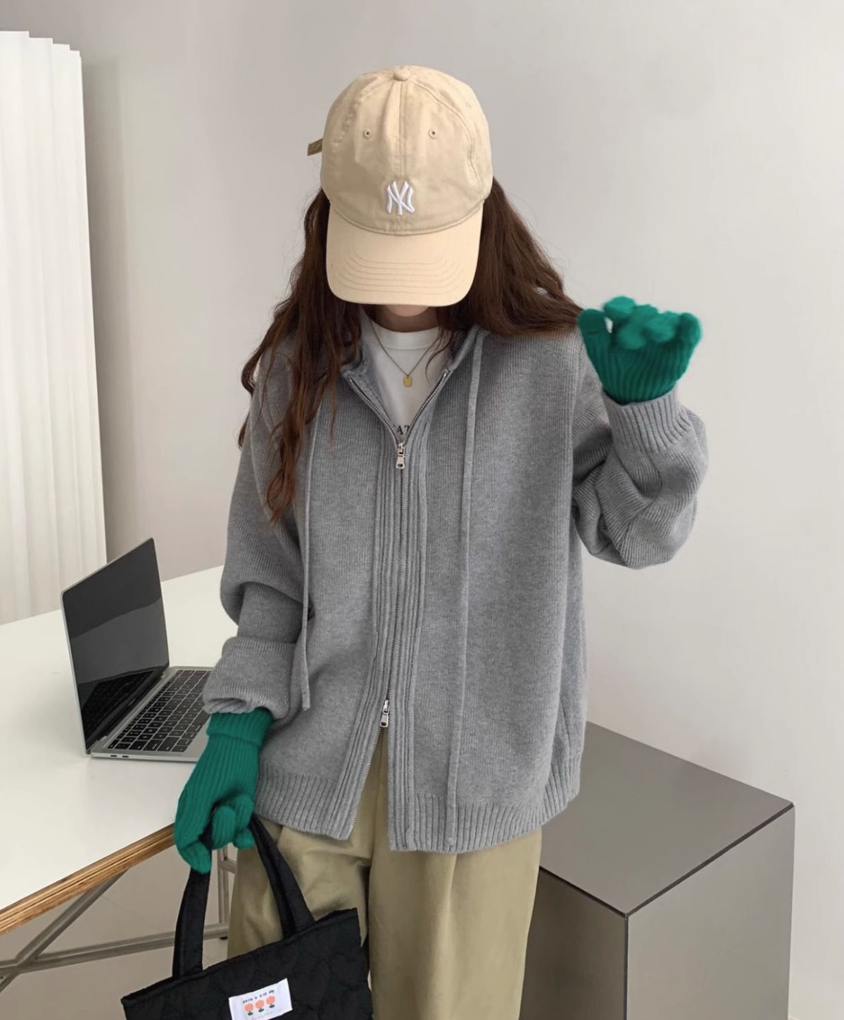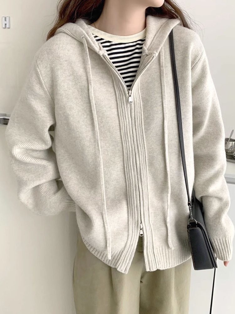 2024 봄 가을 겨울 후드 더블 지퍼 스웨터 코트 여성용 루즈 아우터웨어 게으른 스타일 두꺼운 스웨터 카디건