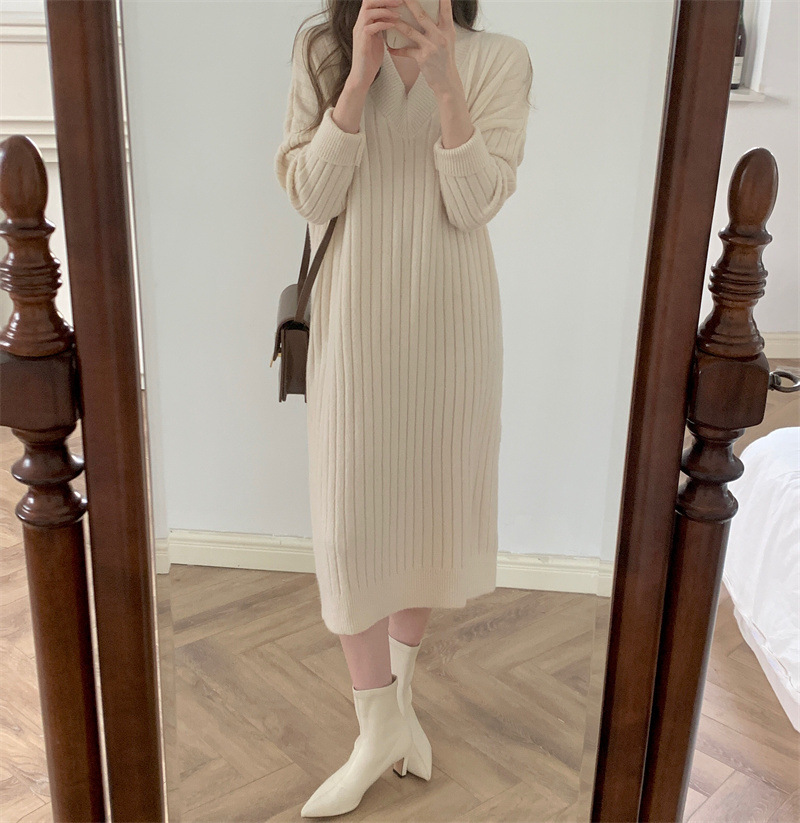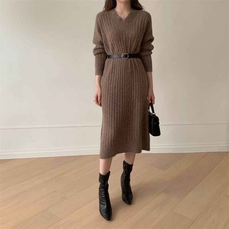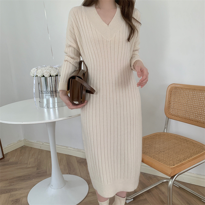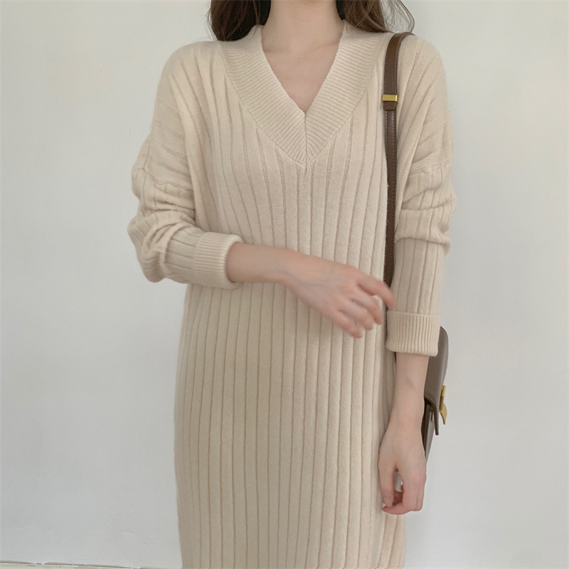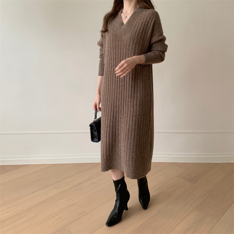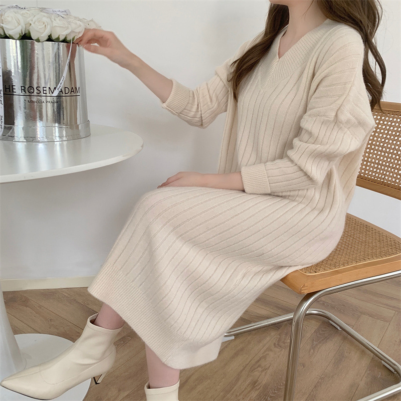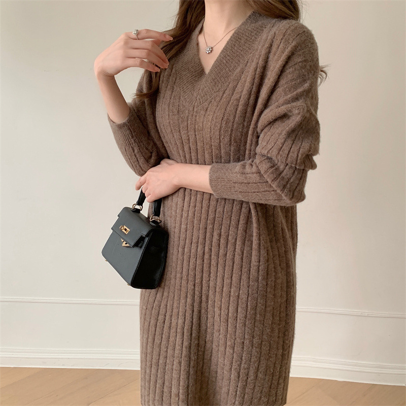 가을과 겨울 프랑스 복고풍 틈새 우아한 V-넥 니트 원피스 느슨한 중간 길이 이상 무릎 바닥 내부 스웨터 원피스스토어 가기