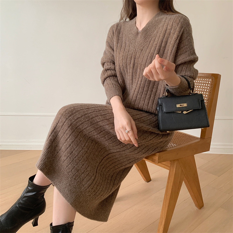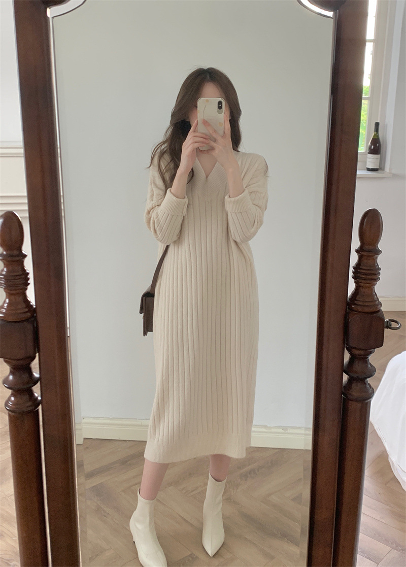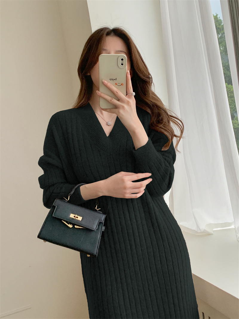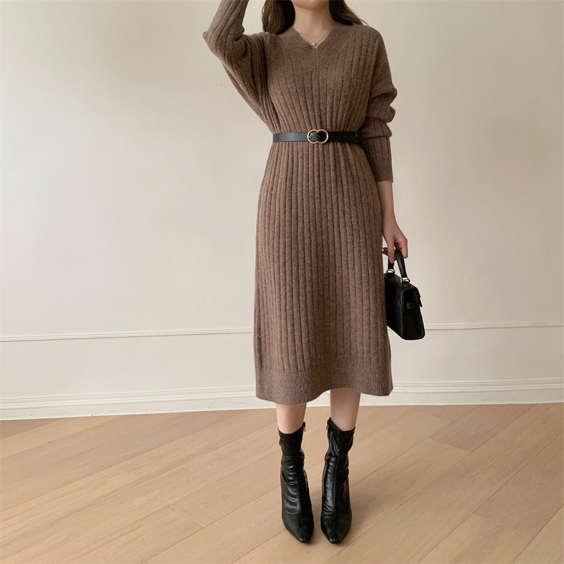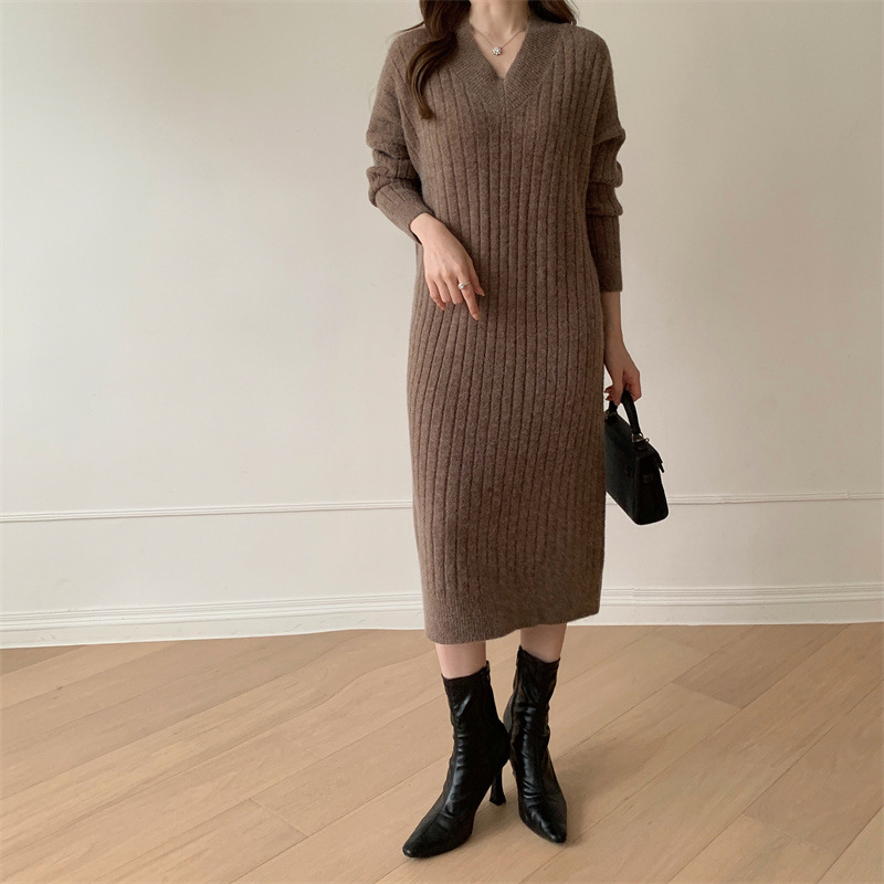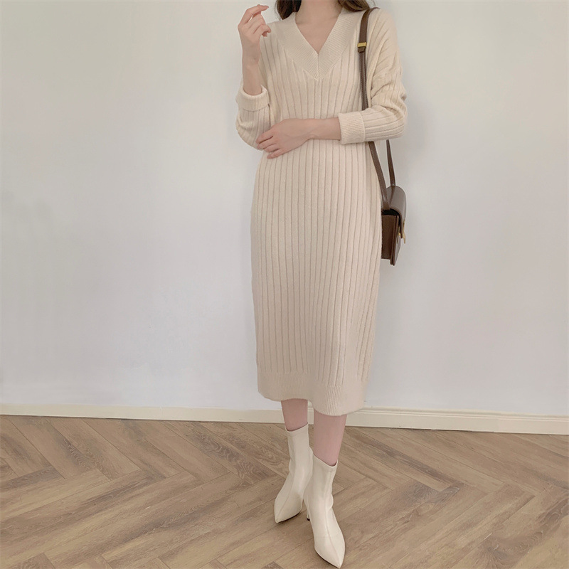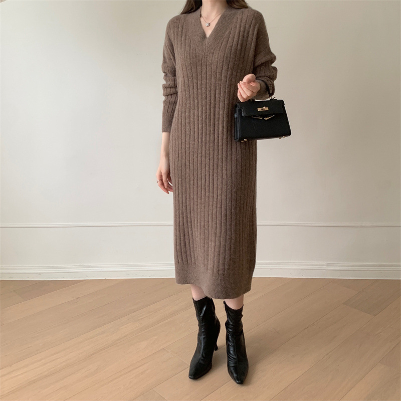 가을과 겨울 프랑스 복고풍 틈새 우아한 V-넥 니트 원피스 느슨한 중간 길이 이상 무릎 바닥 내부 스웨터 원피스스토어 가기