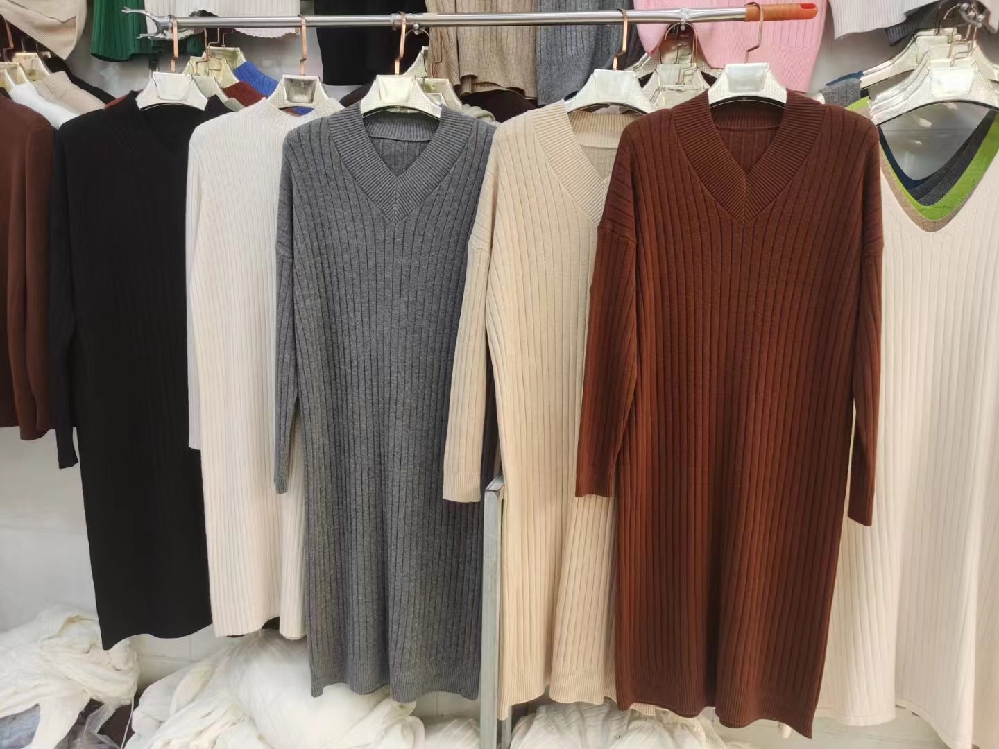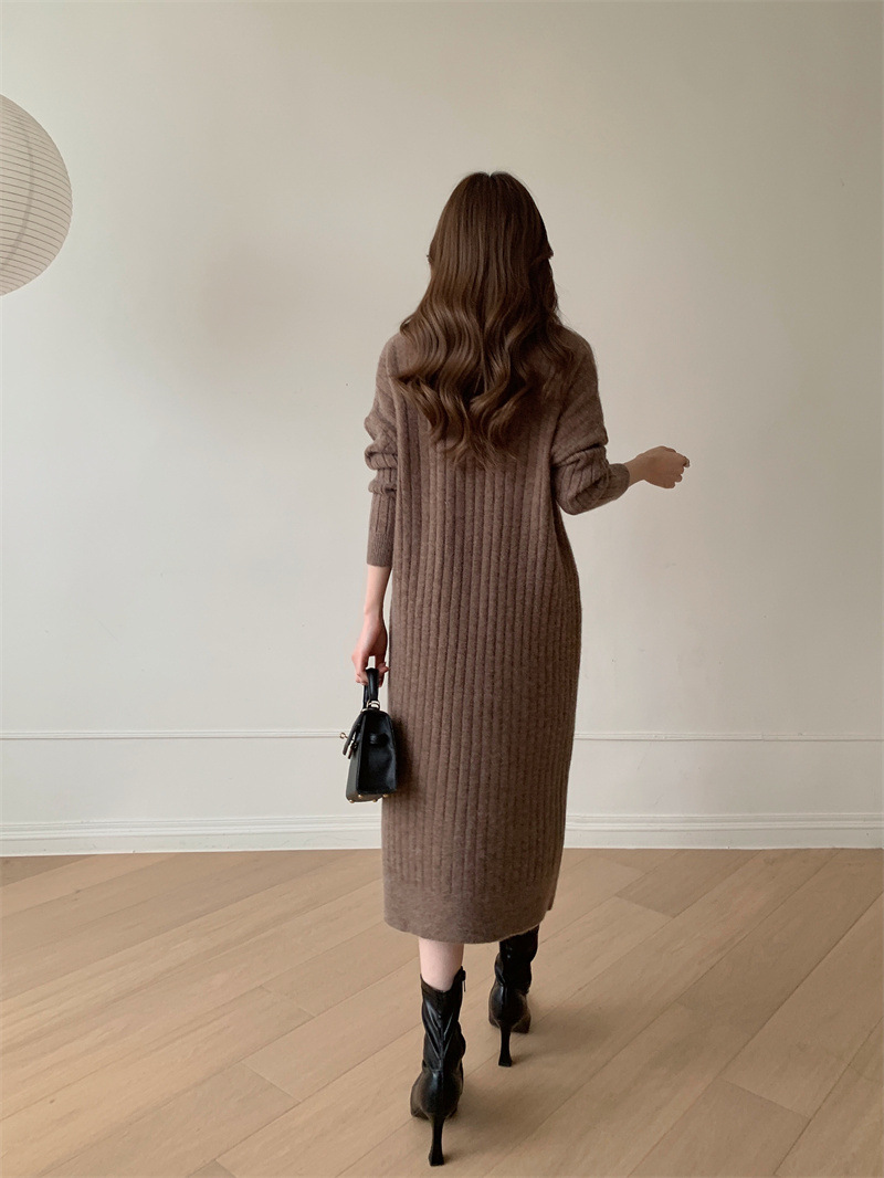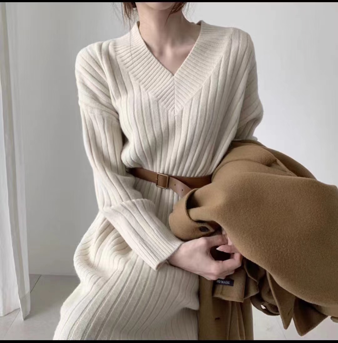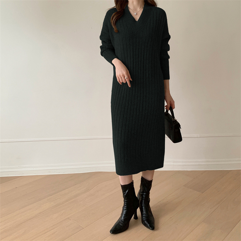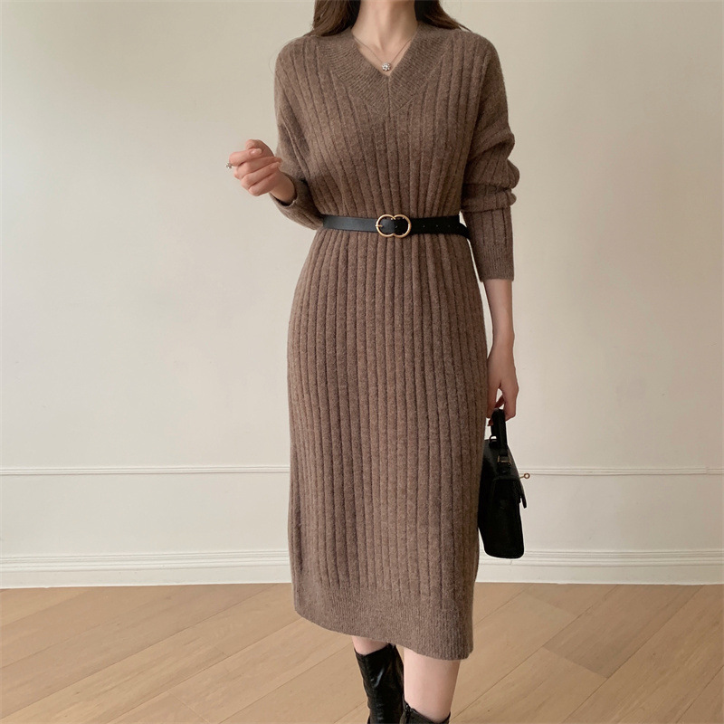 가을과 겨울 프랑스 복고풍 틈새 우아한 V-넥 니트 원피스 느슨한 중간 길이 이상 무릎 바닥 내부 스웨터 원피스스토어 가기