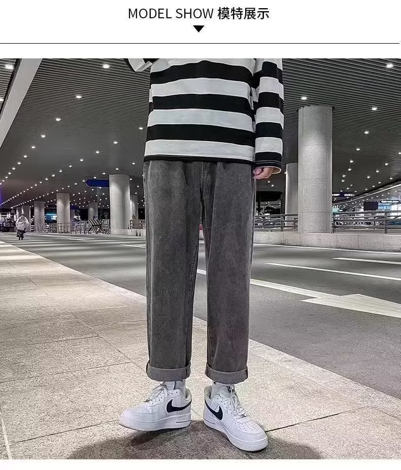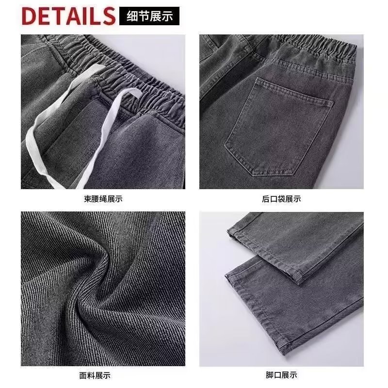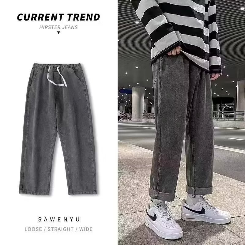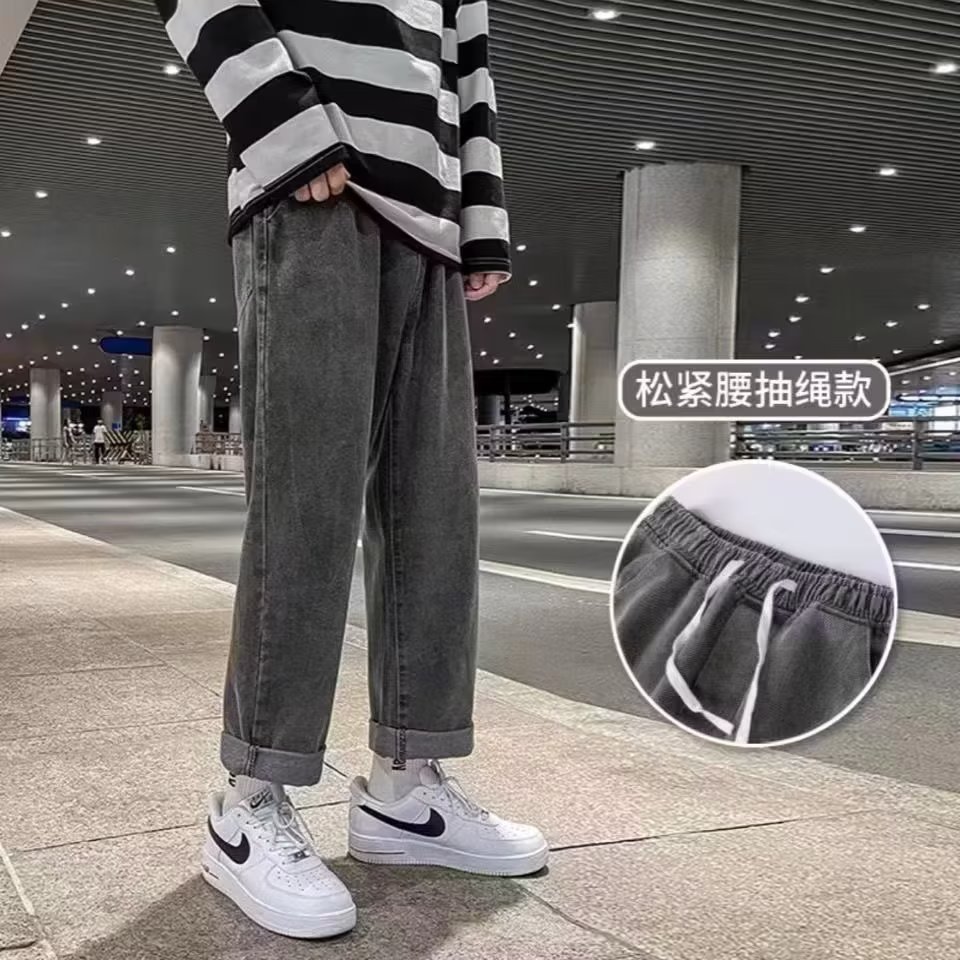 봄과 여름 새로운 드로스트링 탄성 허리 청바지 남성용 느슨한 스트레이트 크롭 와이드 레그 팬츠 캐주얼 트렌디 테더 팬츠스토어 가기
