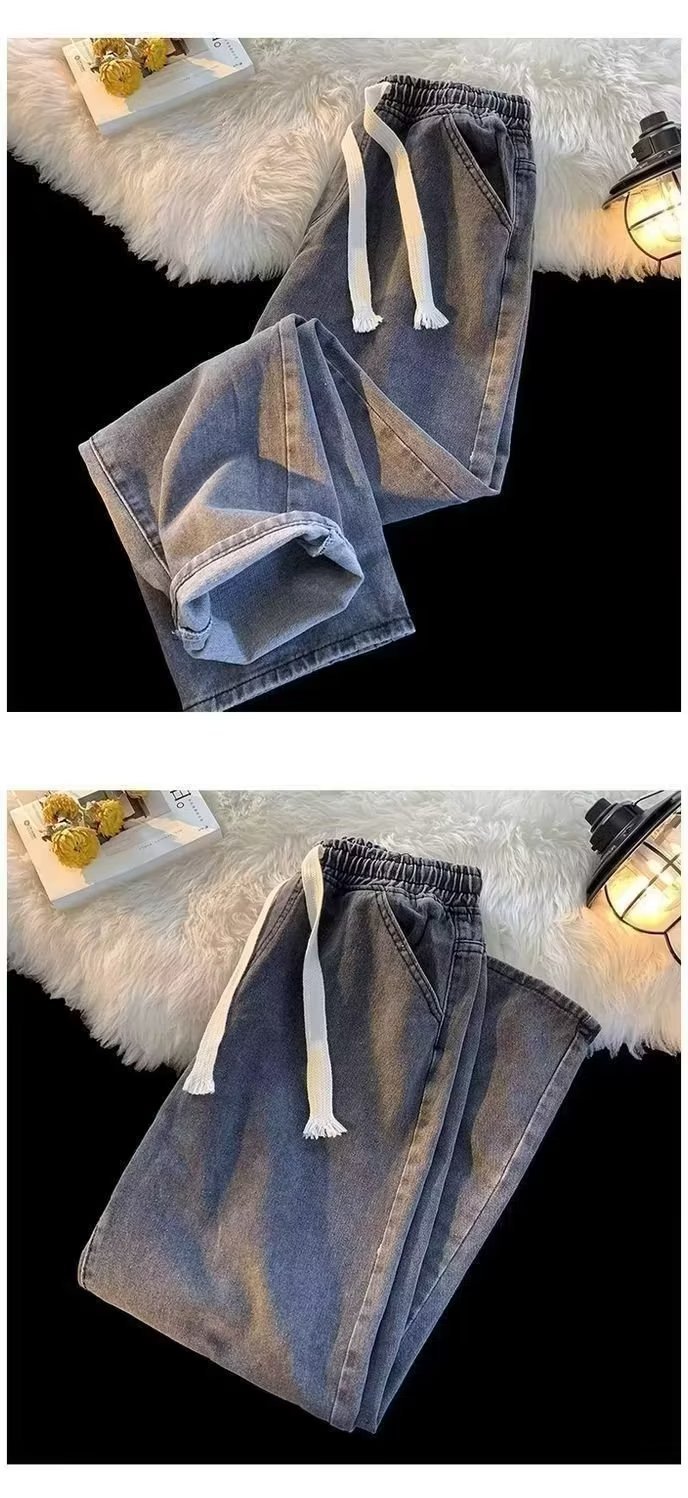 봄과 여름 새로운 드로스트링 탄성 허리 청바지 남성용 느슨한 스트레이트 크롭 와이드 레그 팬츠 캐주얼 트렌디 테더 팬츠