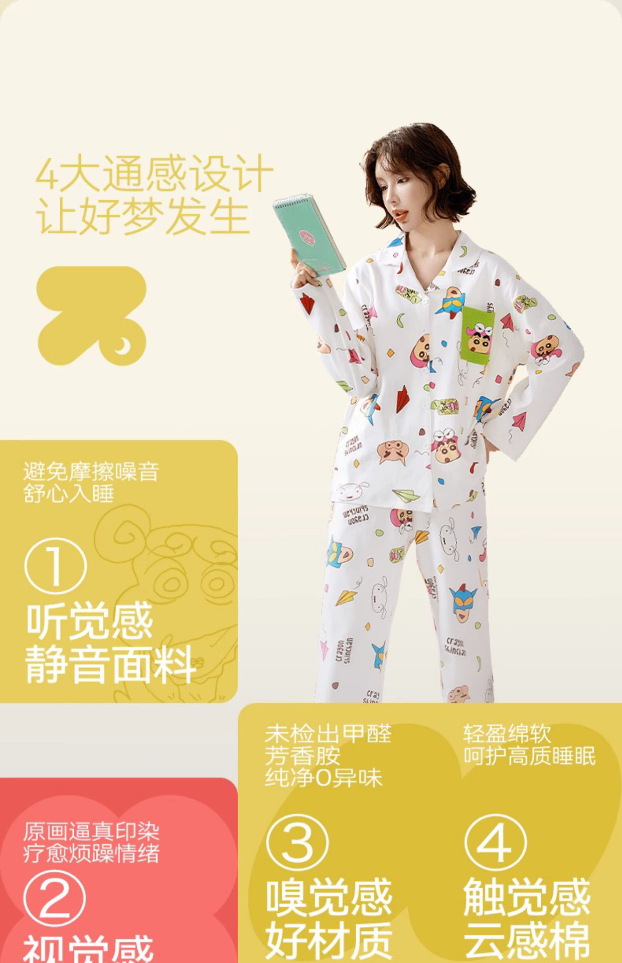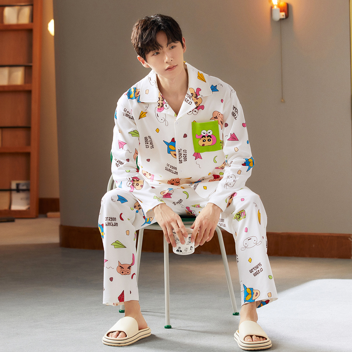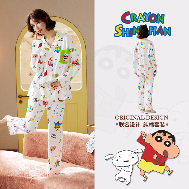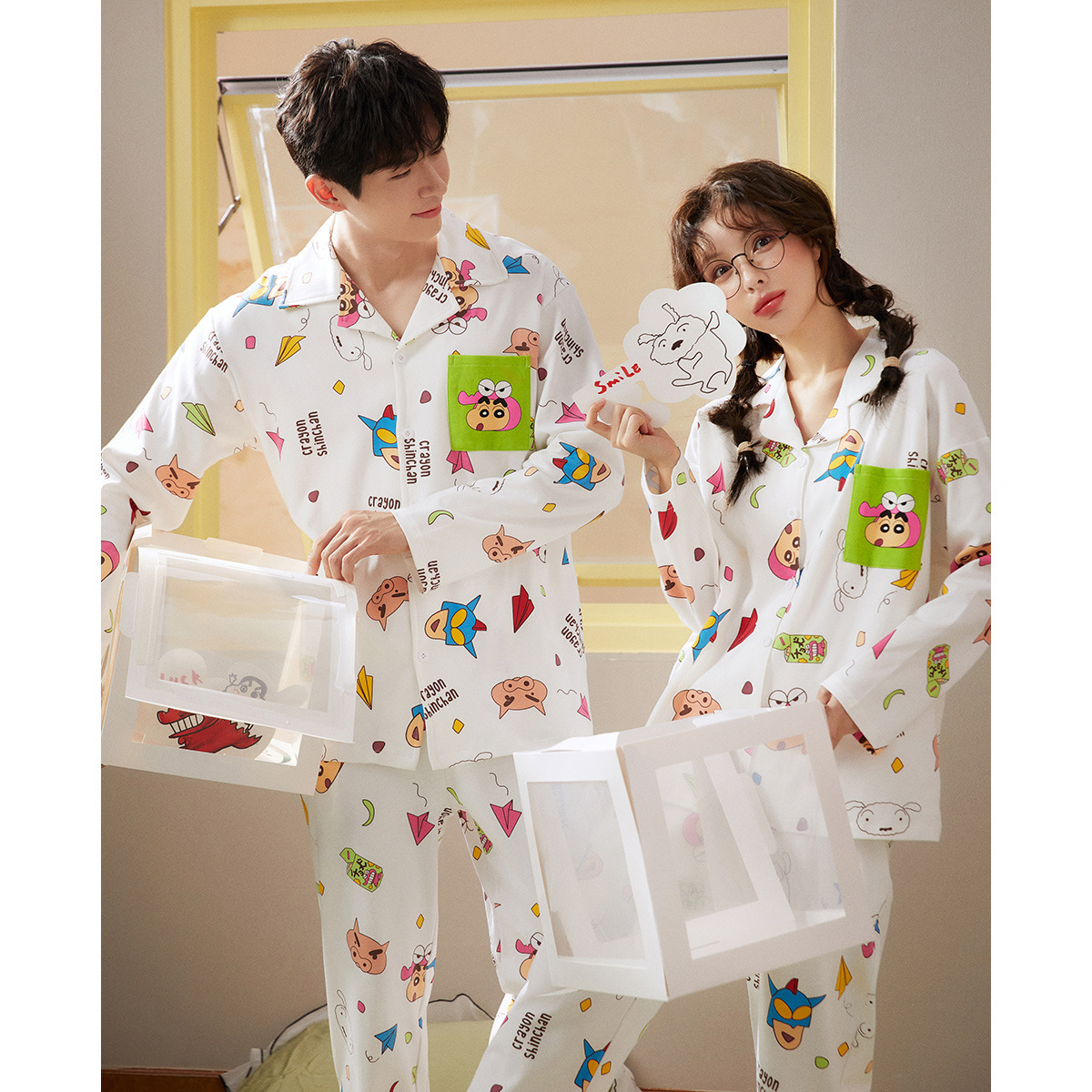 런마 [가볍고 부드러운] 크레용 작은 새 커플 잠옷 여자의 봄과 가을 긴 소매 세트 아우터 순면 가정 옷 남자스토어 가기