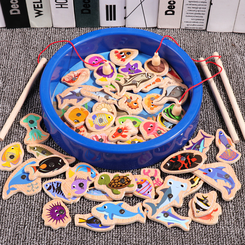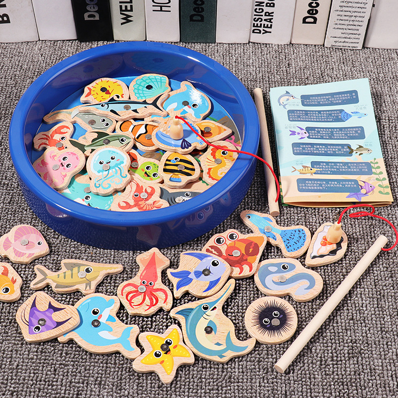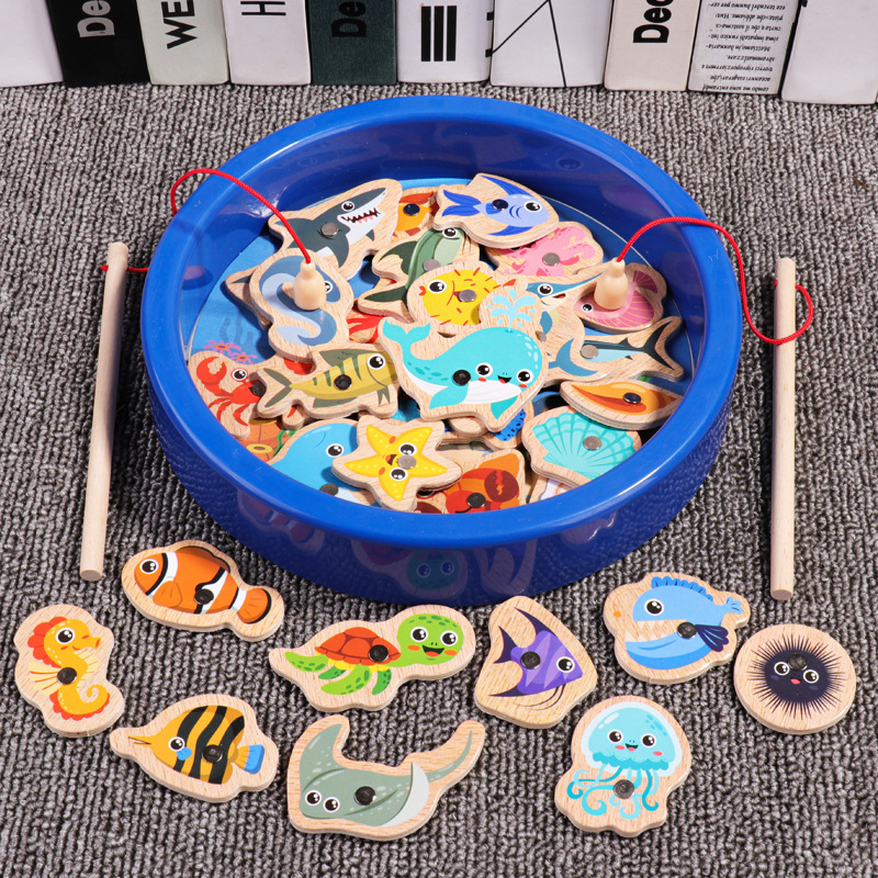 나무통에 담긴 해양 낚시 게임 장난감, 조기 교육, 교육적, 인지적, 재미있는 자석 해양 나무 물고기, 부모-자녀 여행스토어 가기