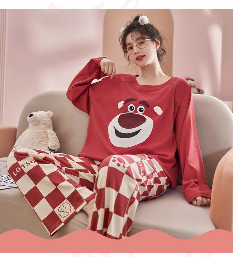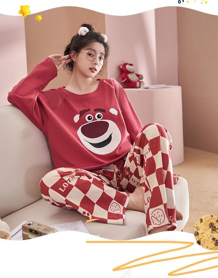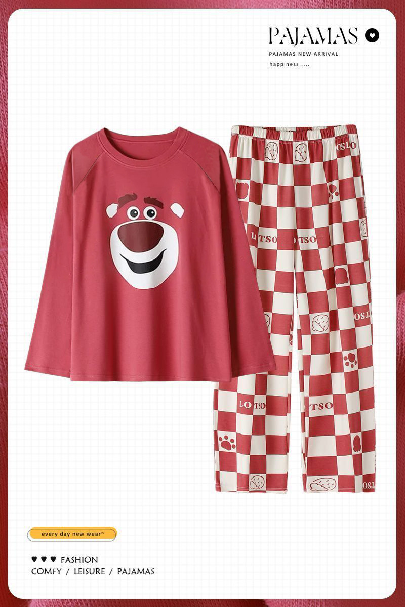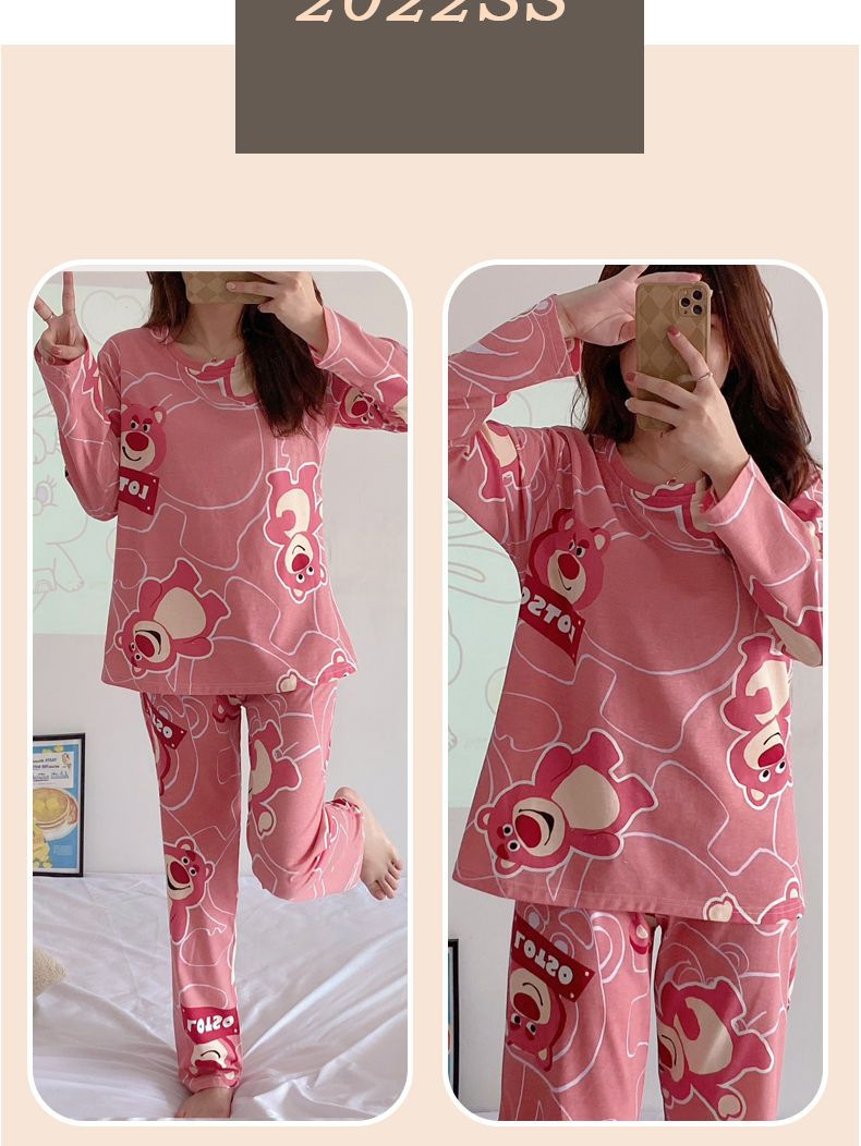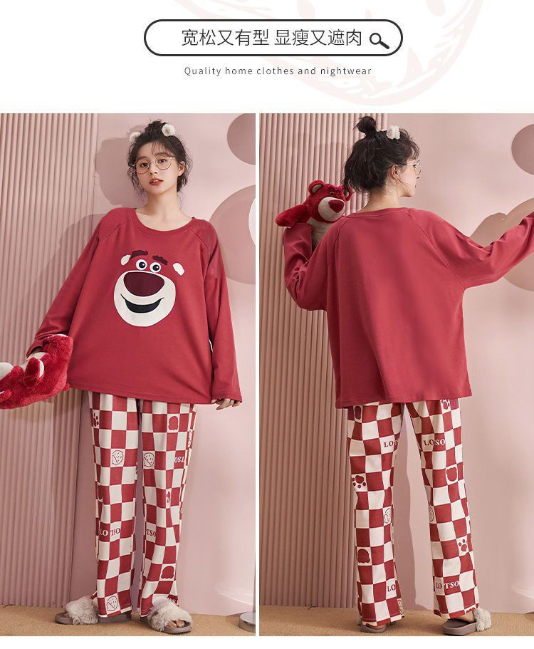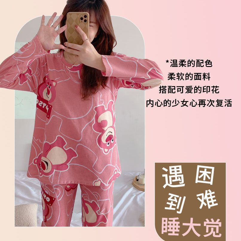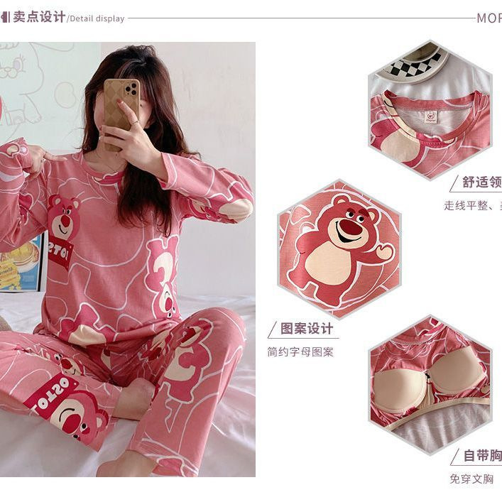 만화 달콤한 딸기 곰 크루넥 긴 소매 잠옷 여자 가슴 패드 봄과 가을 캐주얼 소녀 느슨한 플러스 뚱뚱한 세트