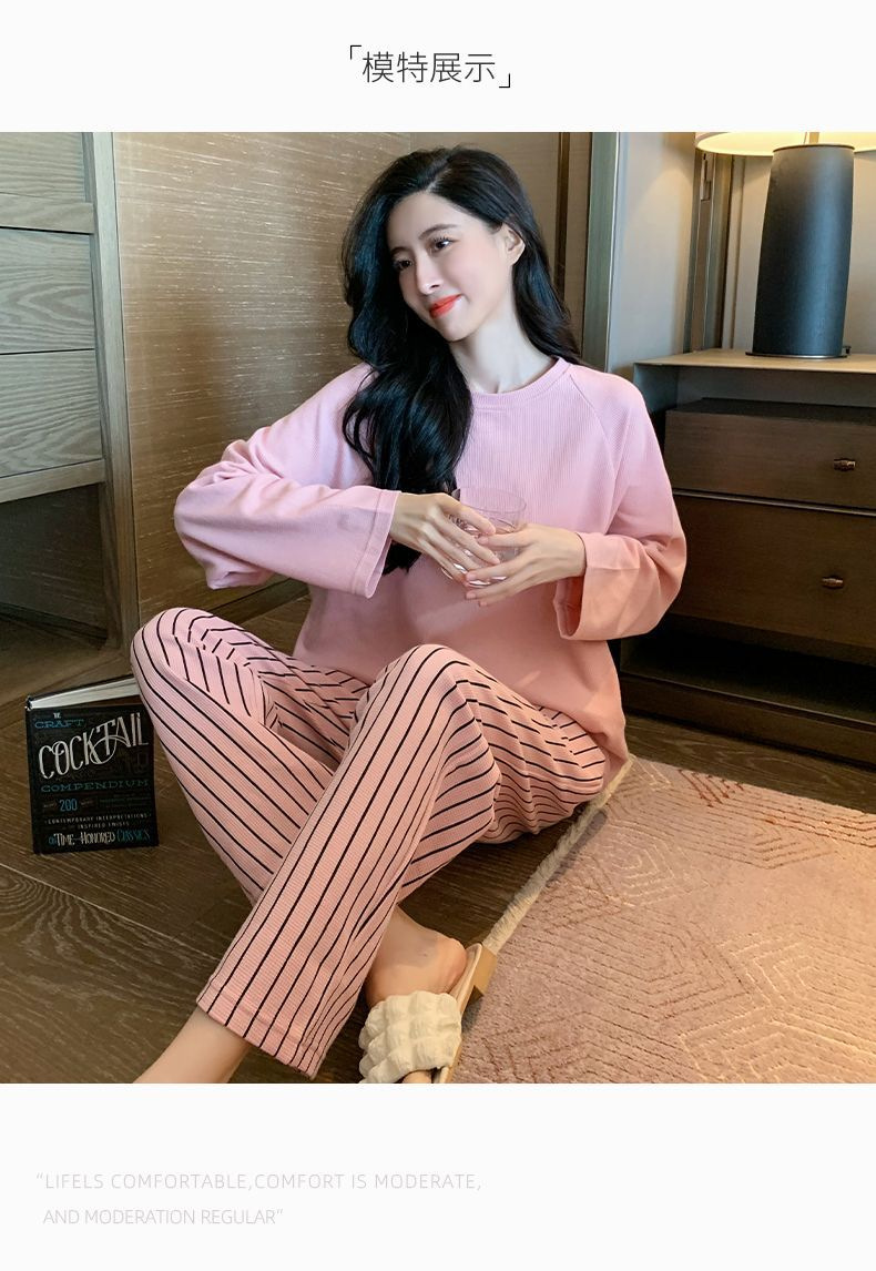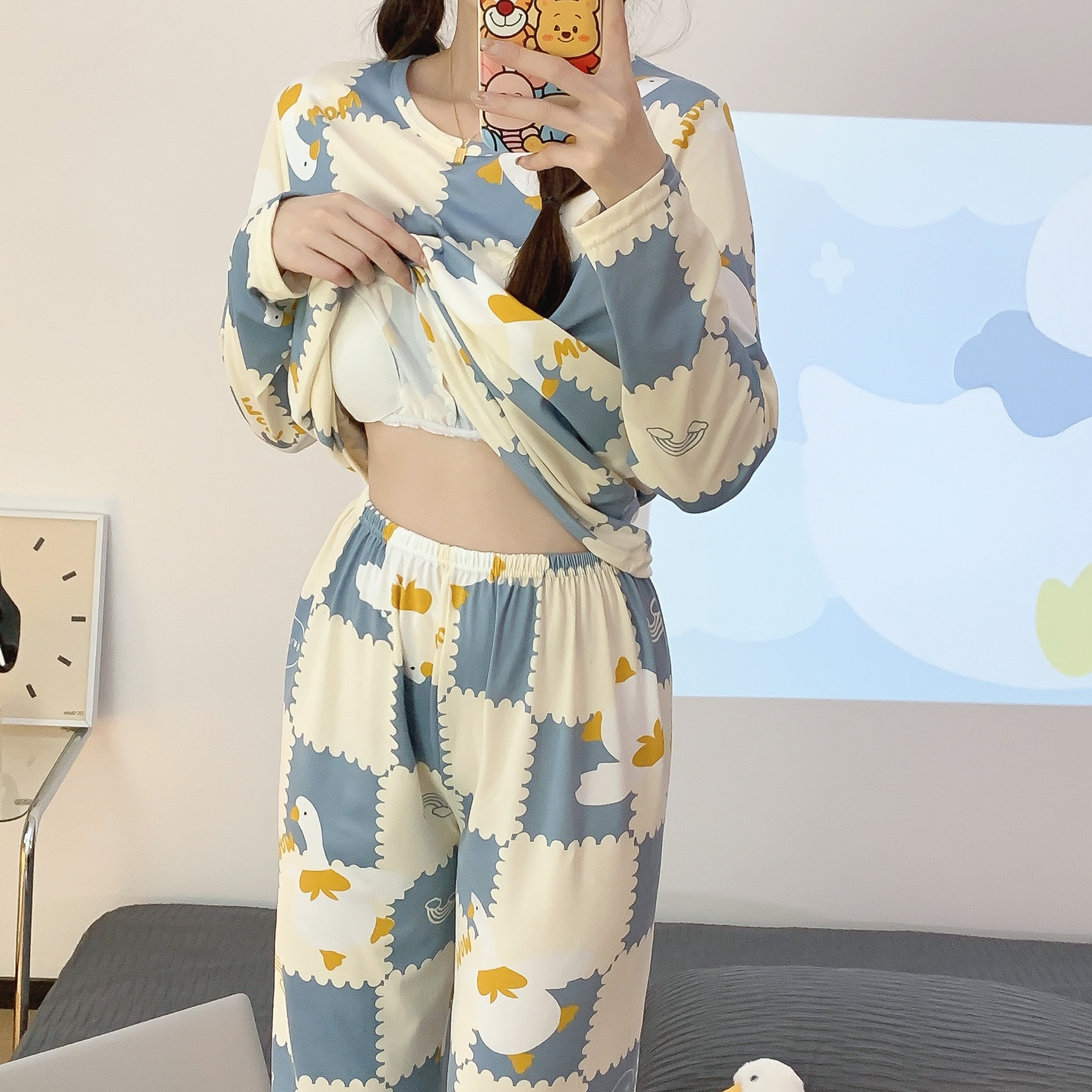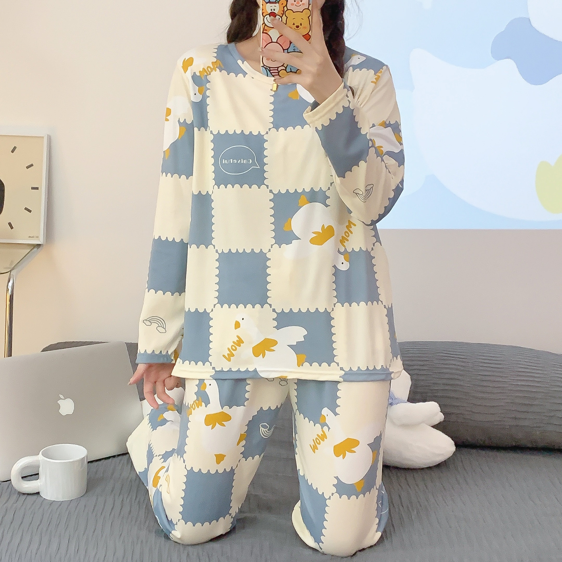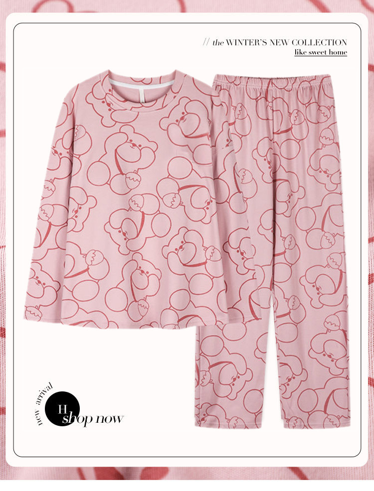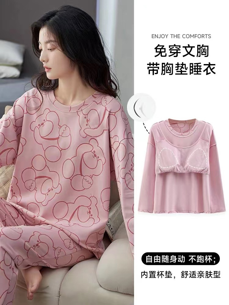 만화 달콤한 딸기 곰 크루넥 긴 소매 잠옷 여자 가슴 패드 봄과 가을 캐주얼 소녀 느슨한 플러스 뚱뚱한 세트