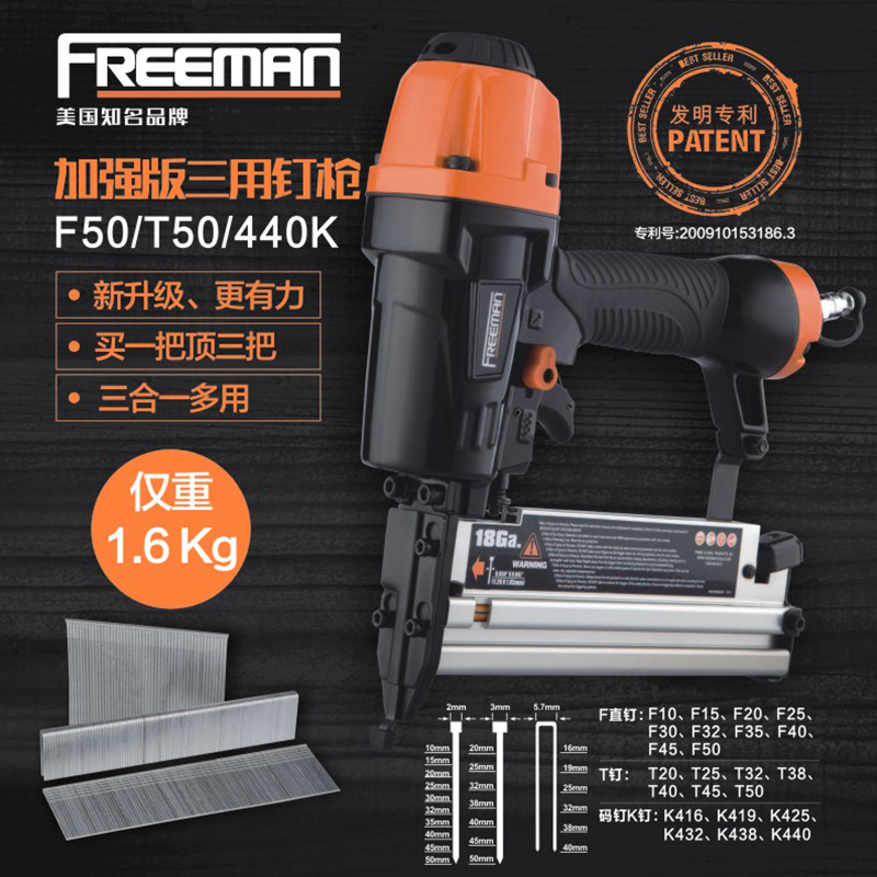 프리맨(FREEMAN) 3-in-1 에어 네일건 F30 직선형 못 K440 코드형 못 T50 목공용 공압식 네일건스토어 가기
