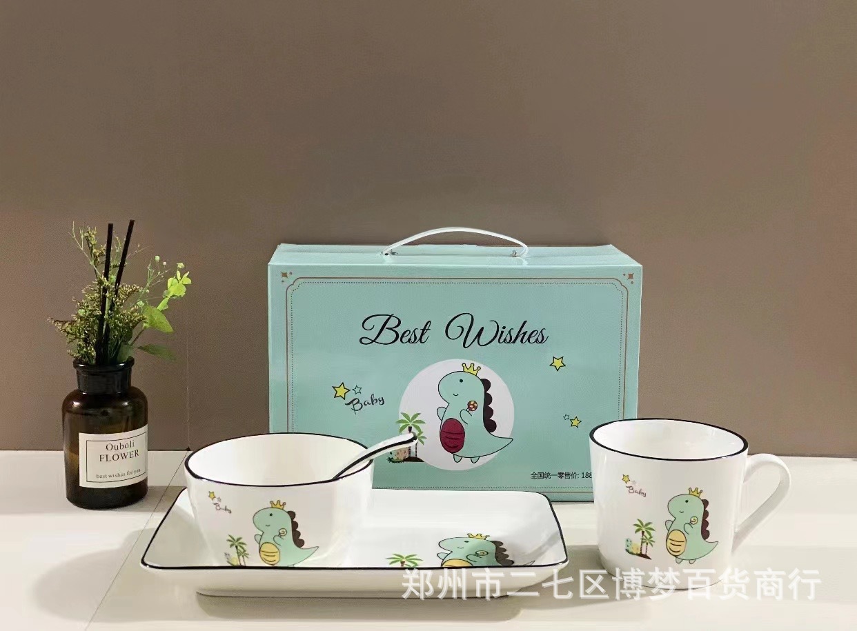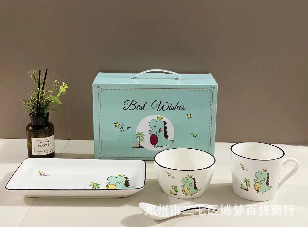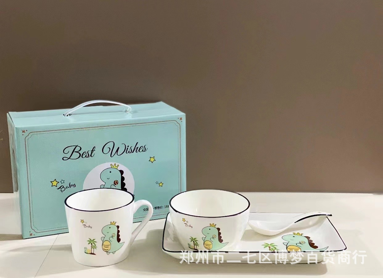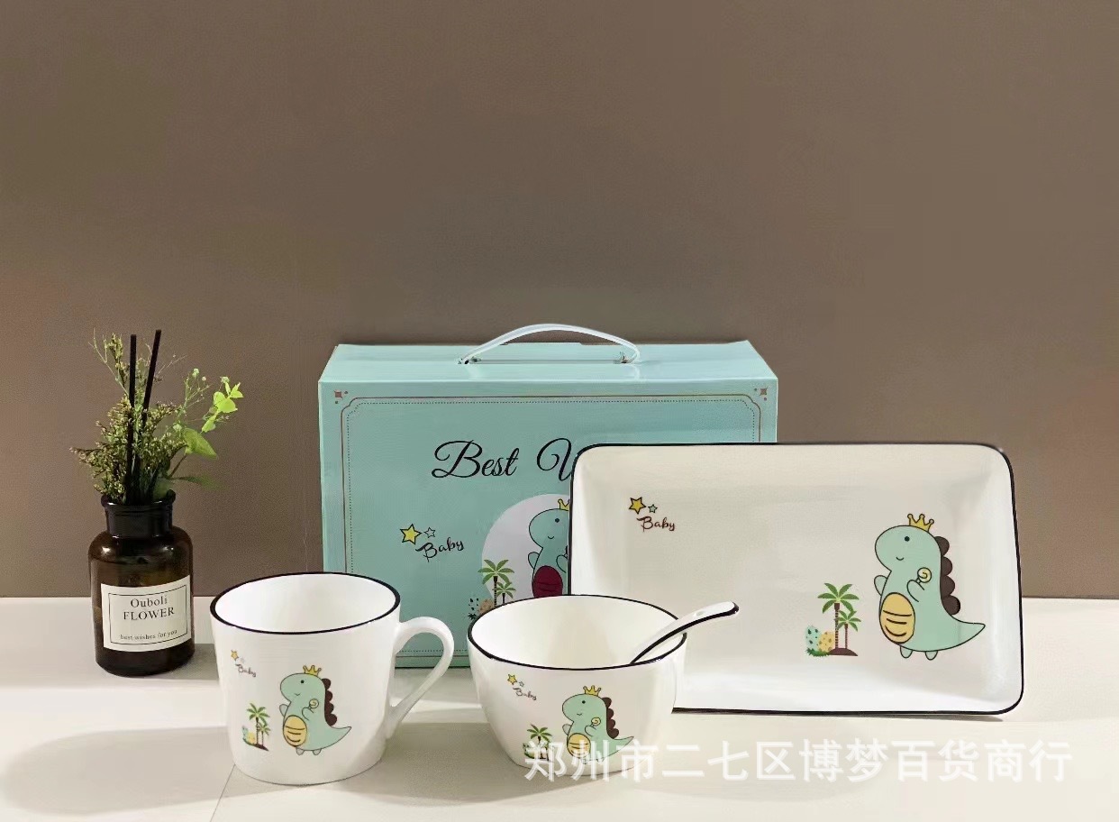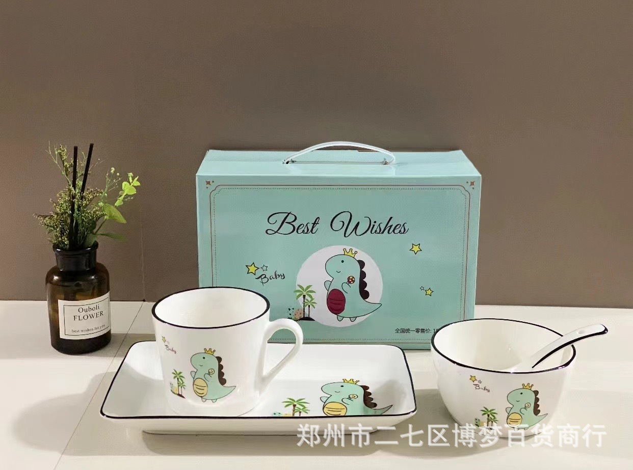 공룡 식기 4 종 세트 세라믹 물 컵 조합 가정용 머그 어린이 아침 식사 컵 우유 컵 오프닝 활동
