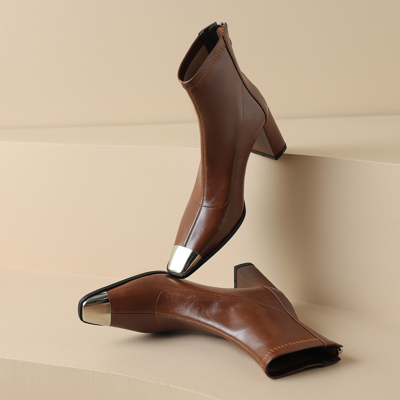 질감이 폭발하다~ 유럽과 미국의 메탈 토 안티킥 여성용 숏부츠, 패셔너블한 두꺼운 굽, 뒷지퍼, 하이힐 소가죽 마틴부츠