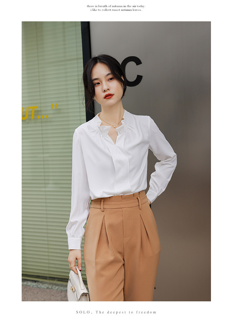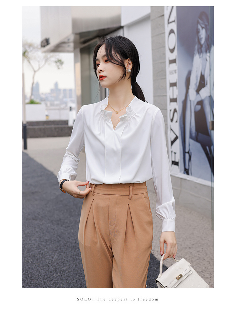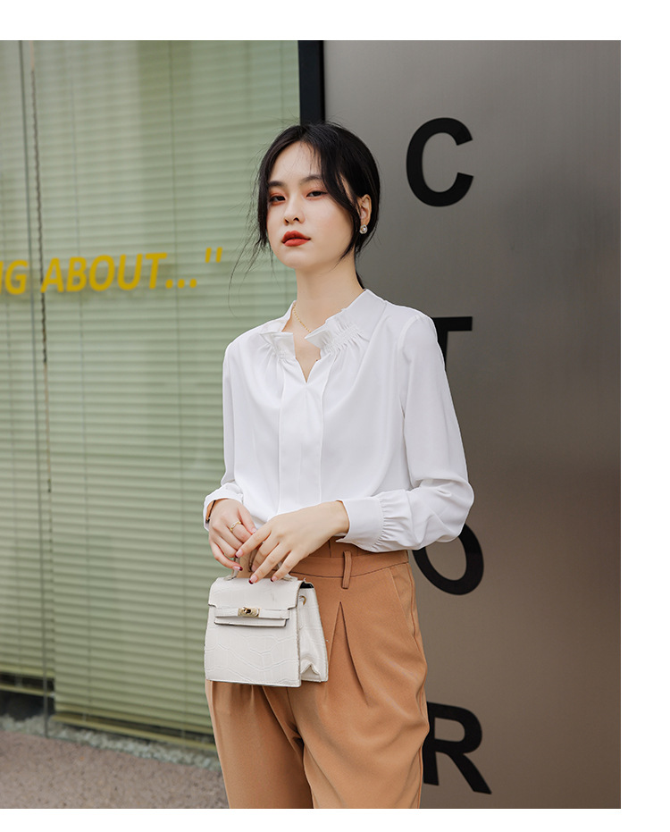 여성용 화이트 프렌치 셔츠 2025 봄 신작 긴팔 러플 브이넥 슬림 쉬폰 탑 하프 오픈 칼라