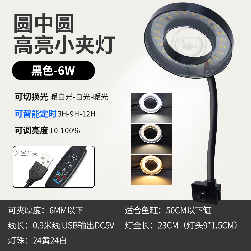 • [타임 디밍이 가능한 새로운 모델] 6W 검정색 원형 클립 램프 USB에는 플러그가 포함되어 있지 않습니다.