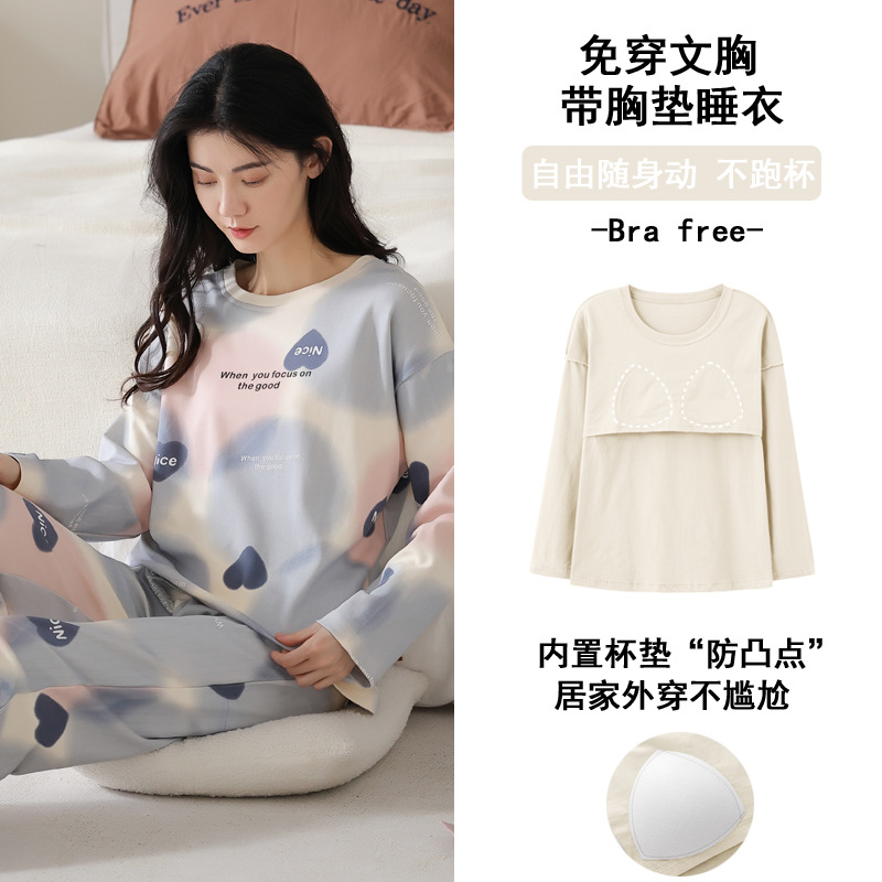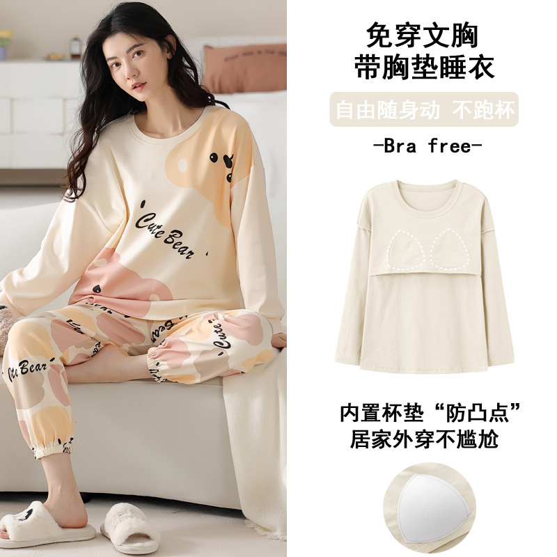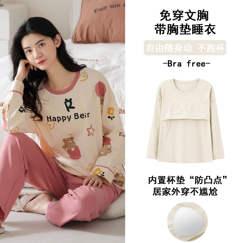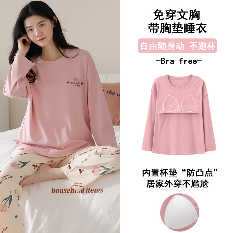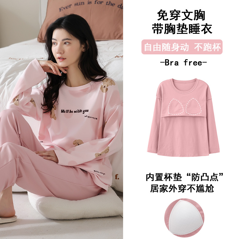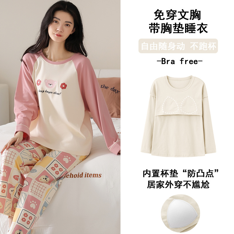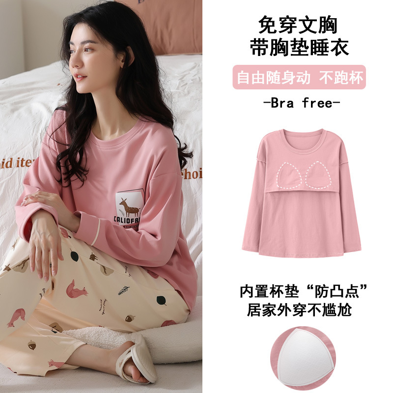 [가슴 패드로] 잠옷 여성 봄과 가을 면 긴 소매 바지 투피스 가을 여성 면 홈 옷 세트