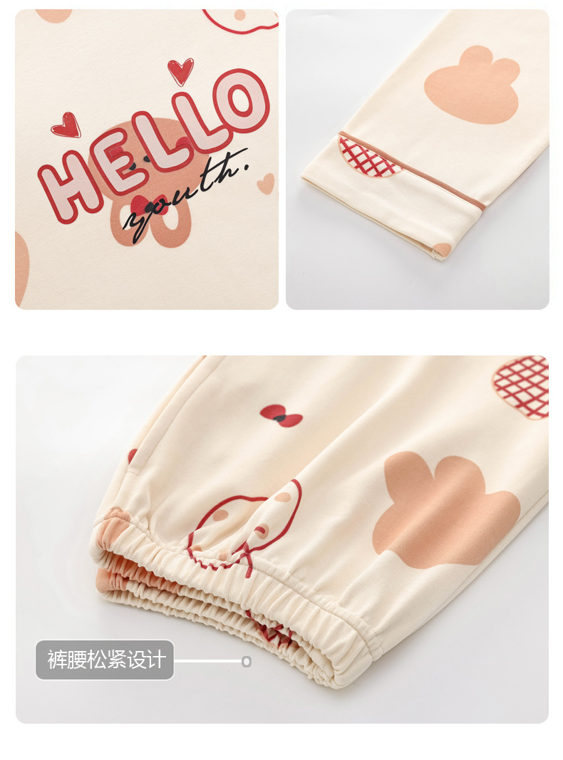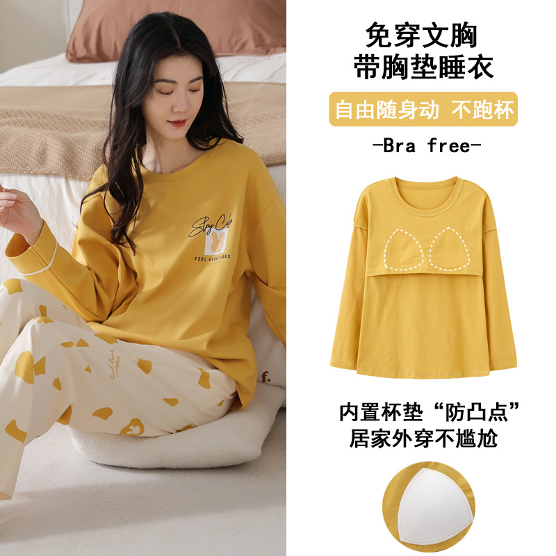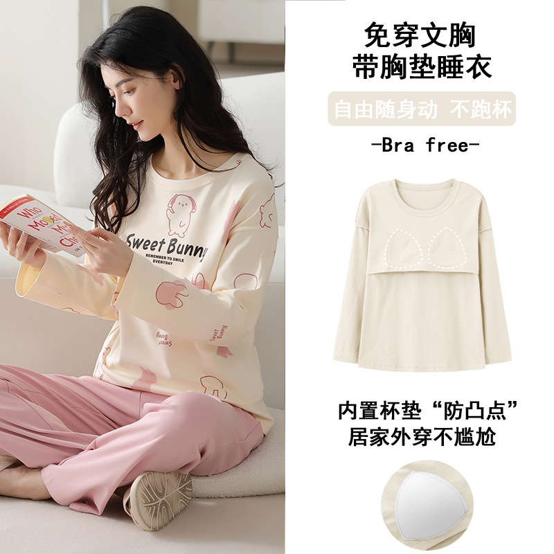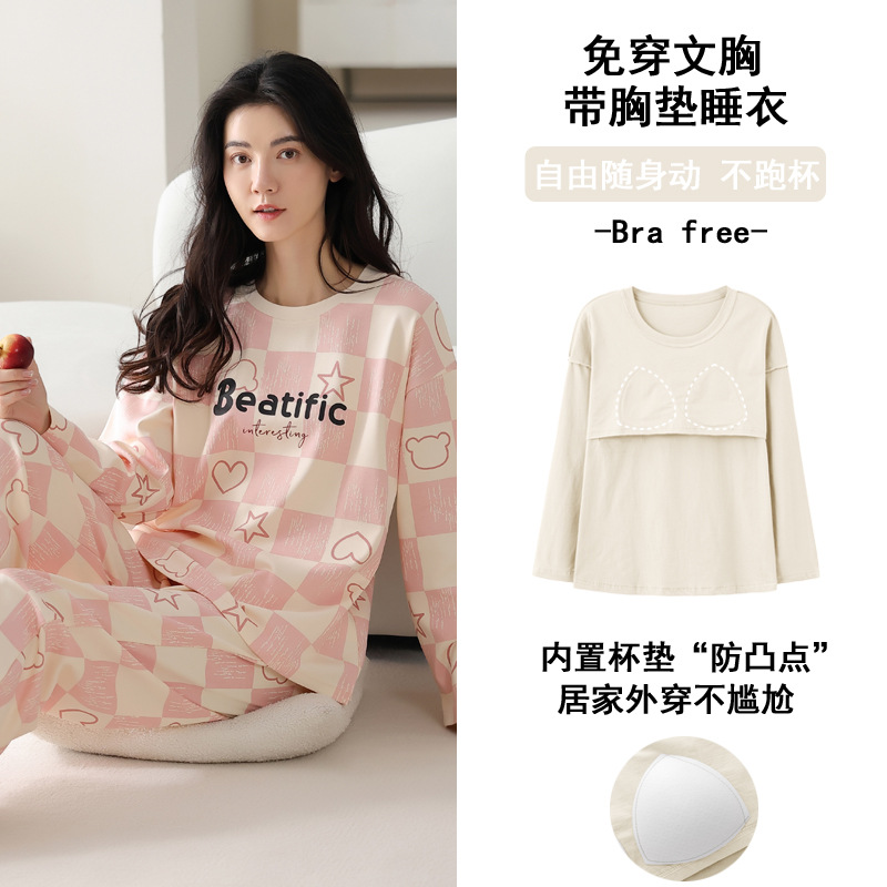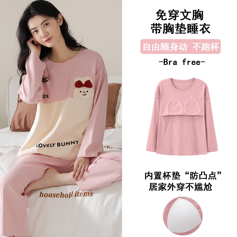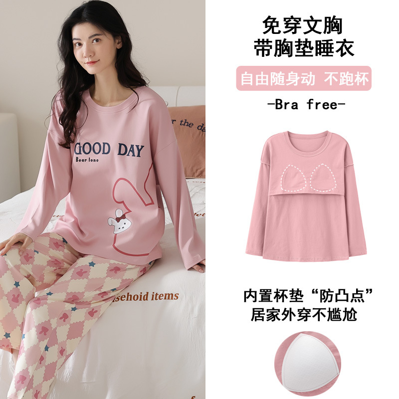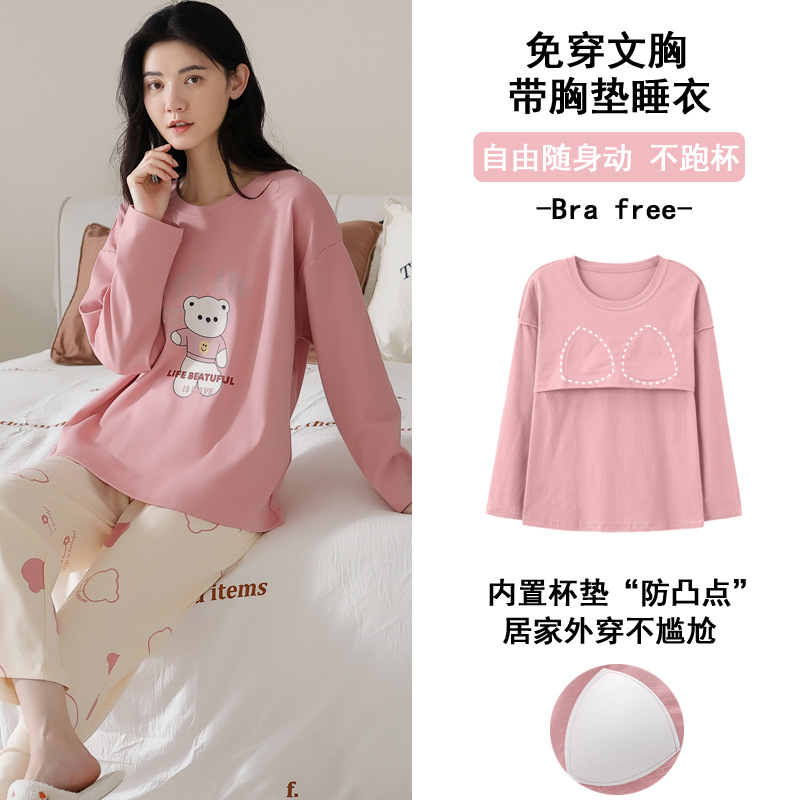 [가슴 패드로] 잠옷 여성 봄과 가을 면 긴 소매 바지 투피스 가을 여성 면 홈 옷 세트