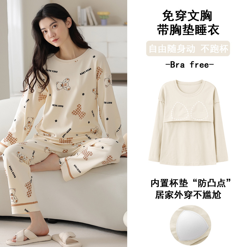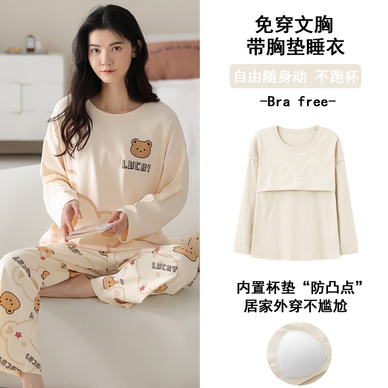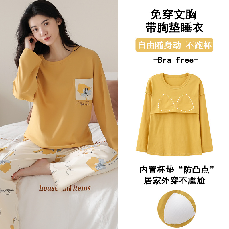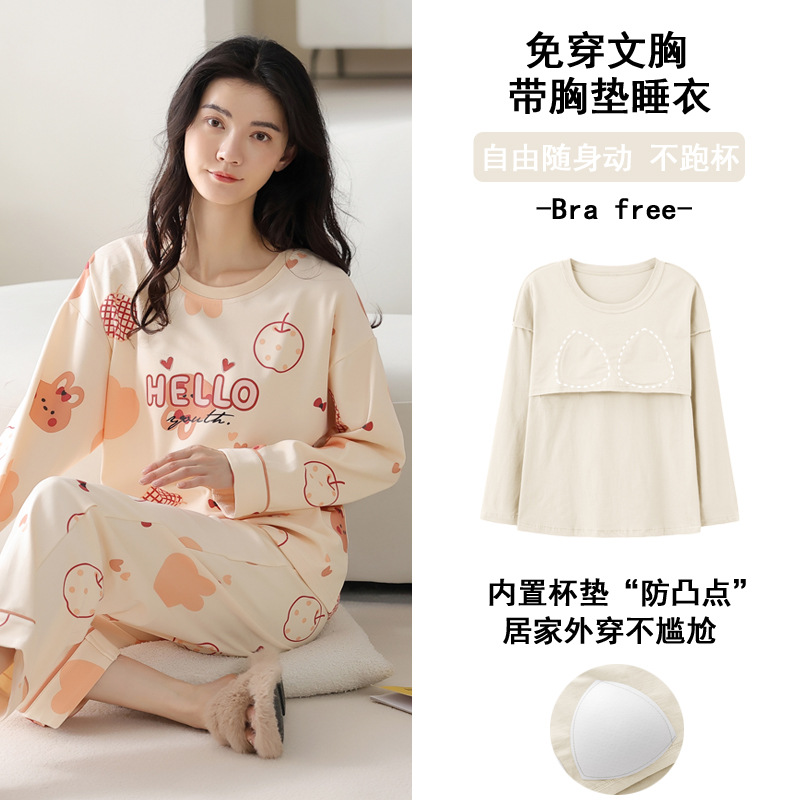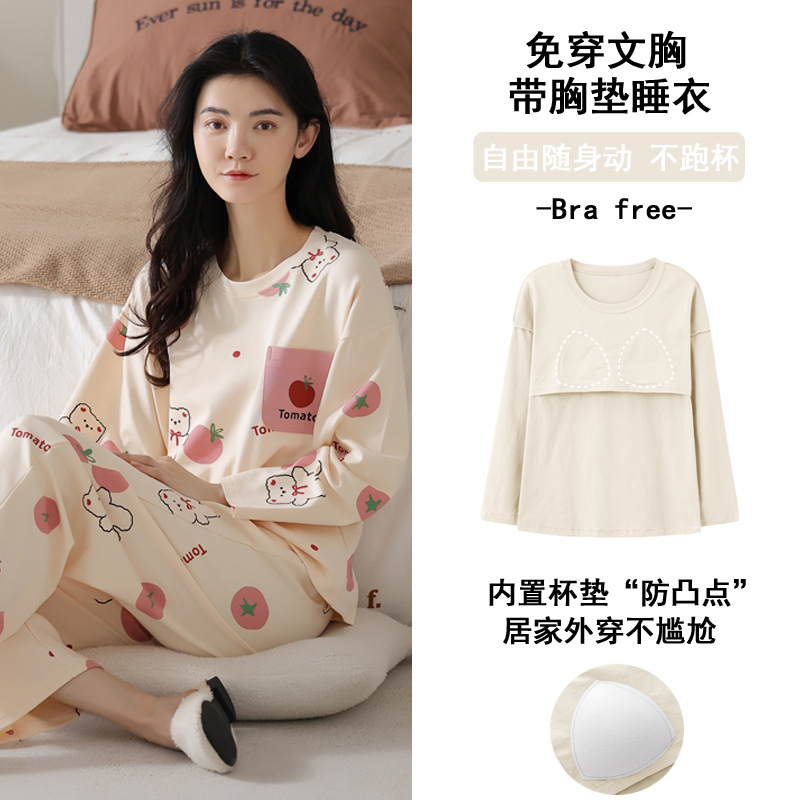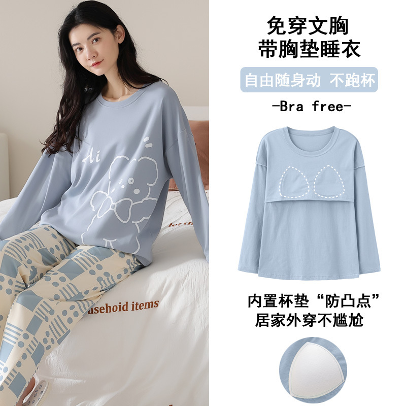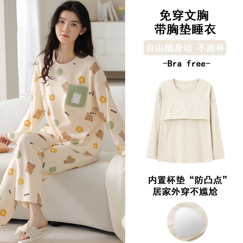 [가슴 패드로] 잠옷 여성 봄과 가을 면 긴 소매 바지 투피스 가을 여성 면 홈 옷 세트스토어 가기