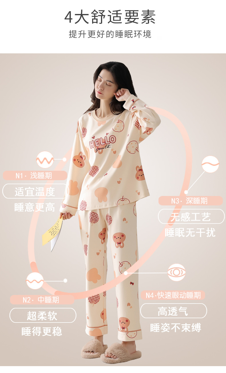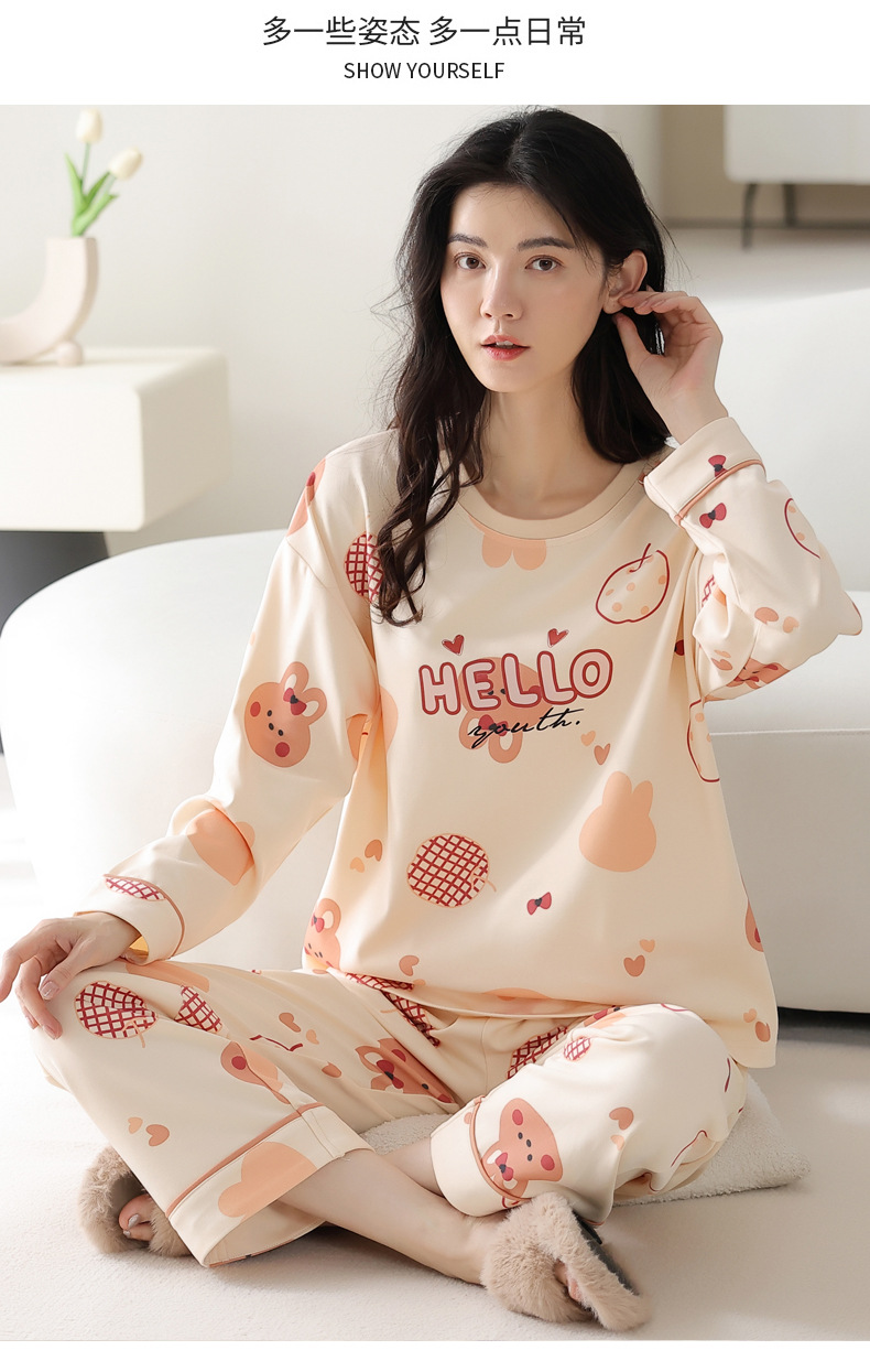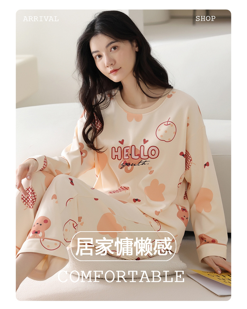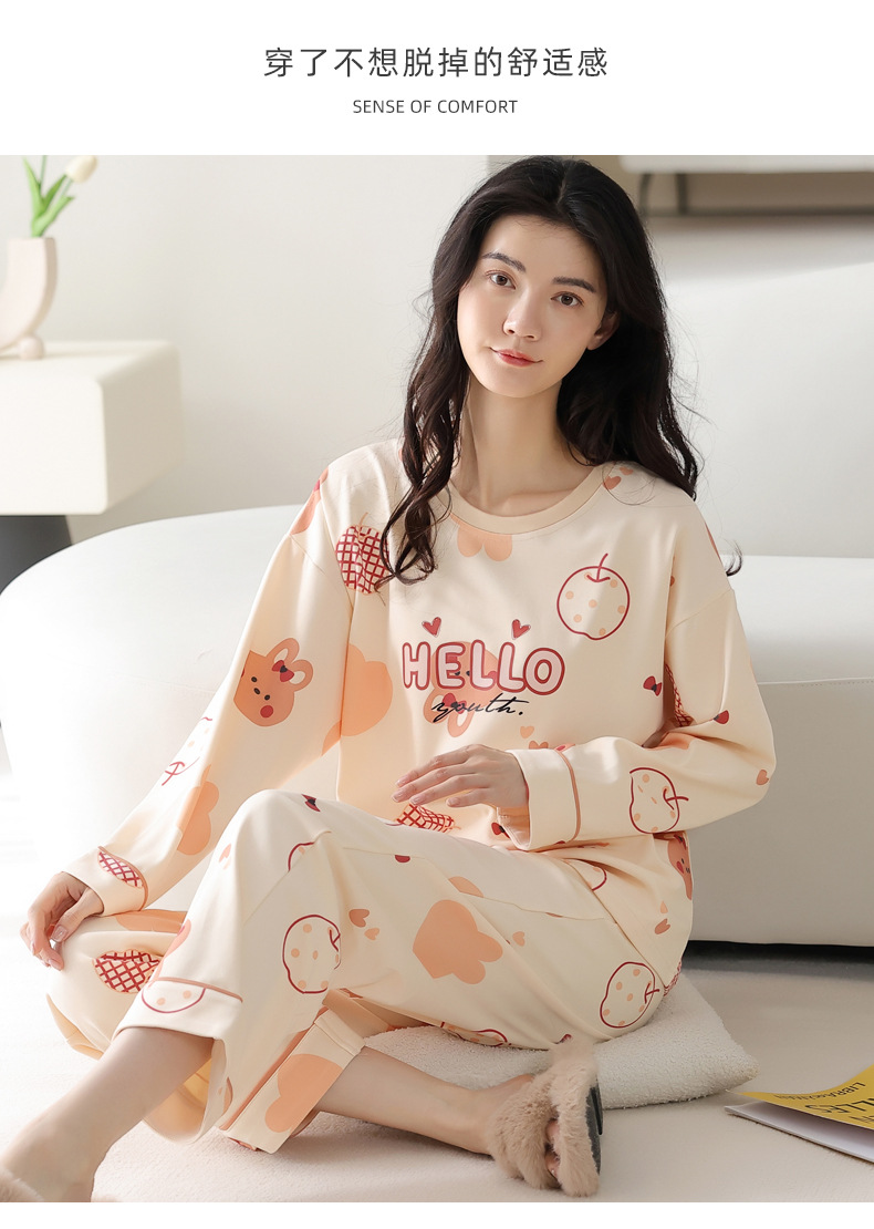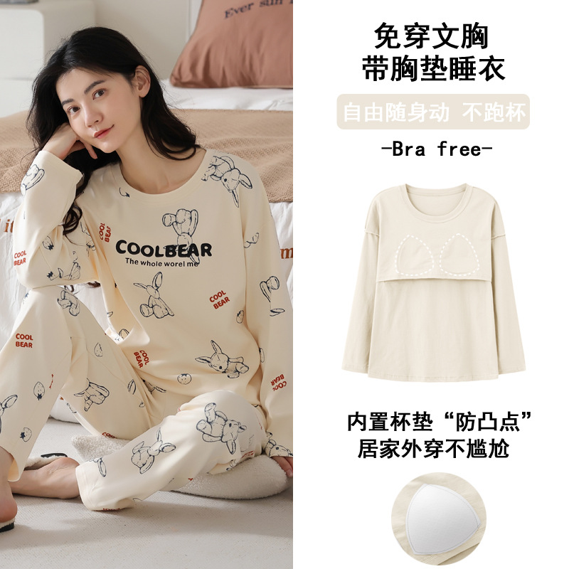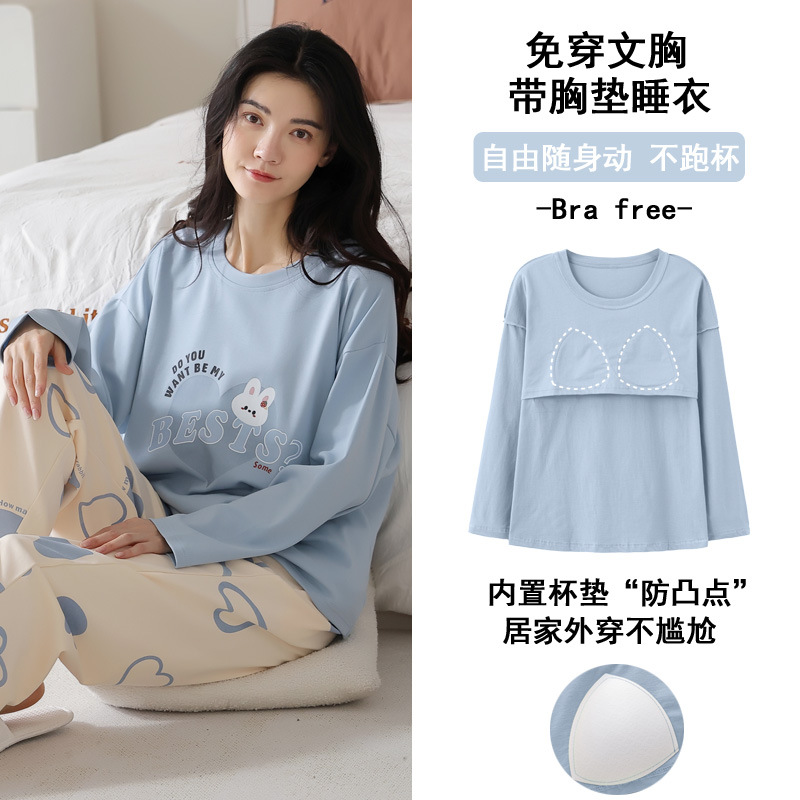 [가슴 패드로] 잠옷 여성 봄과 가을 면 긴 소매 바지 투피스 가을 여성 면 홈 옷 세트스토어 가기