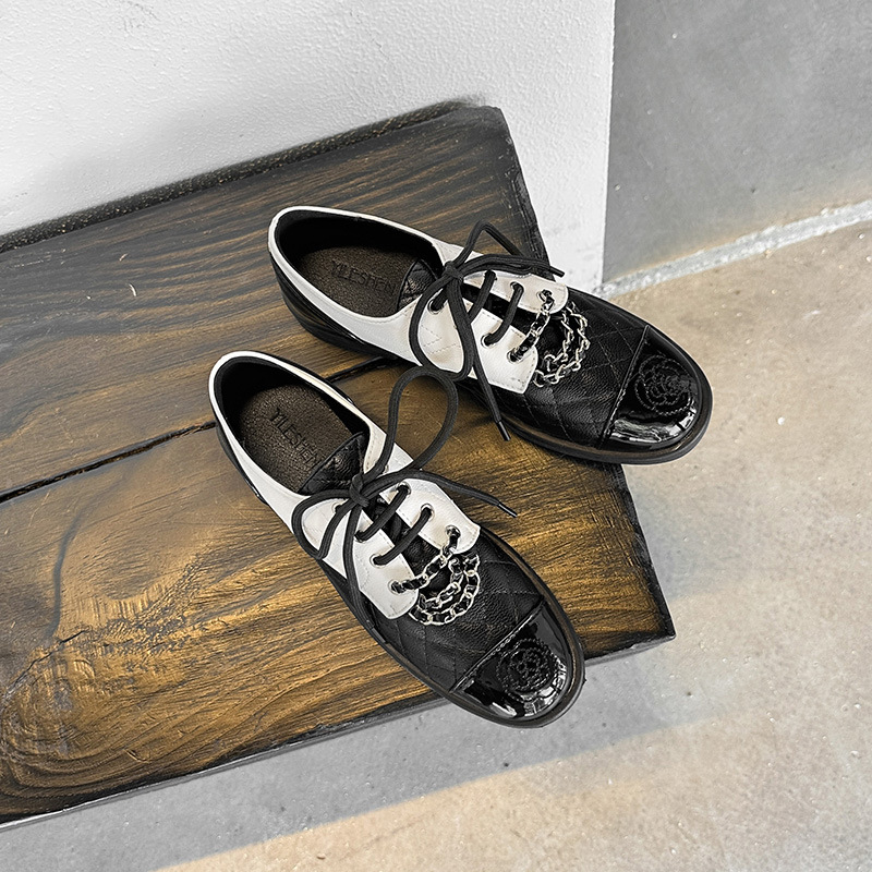 가을 2023 새로운 작은 가죽 신발 색상 일치 동백 체인 향기로운 스타일 플랫 바닥 소 2 층 싱글 슈즈 여성용 로퍼