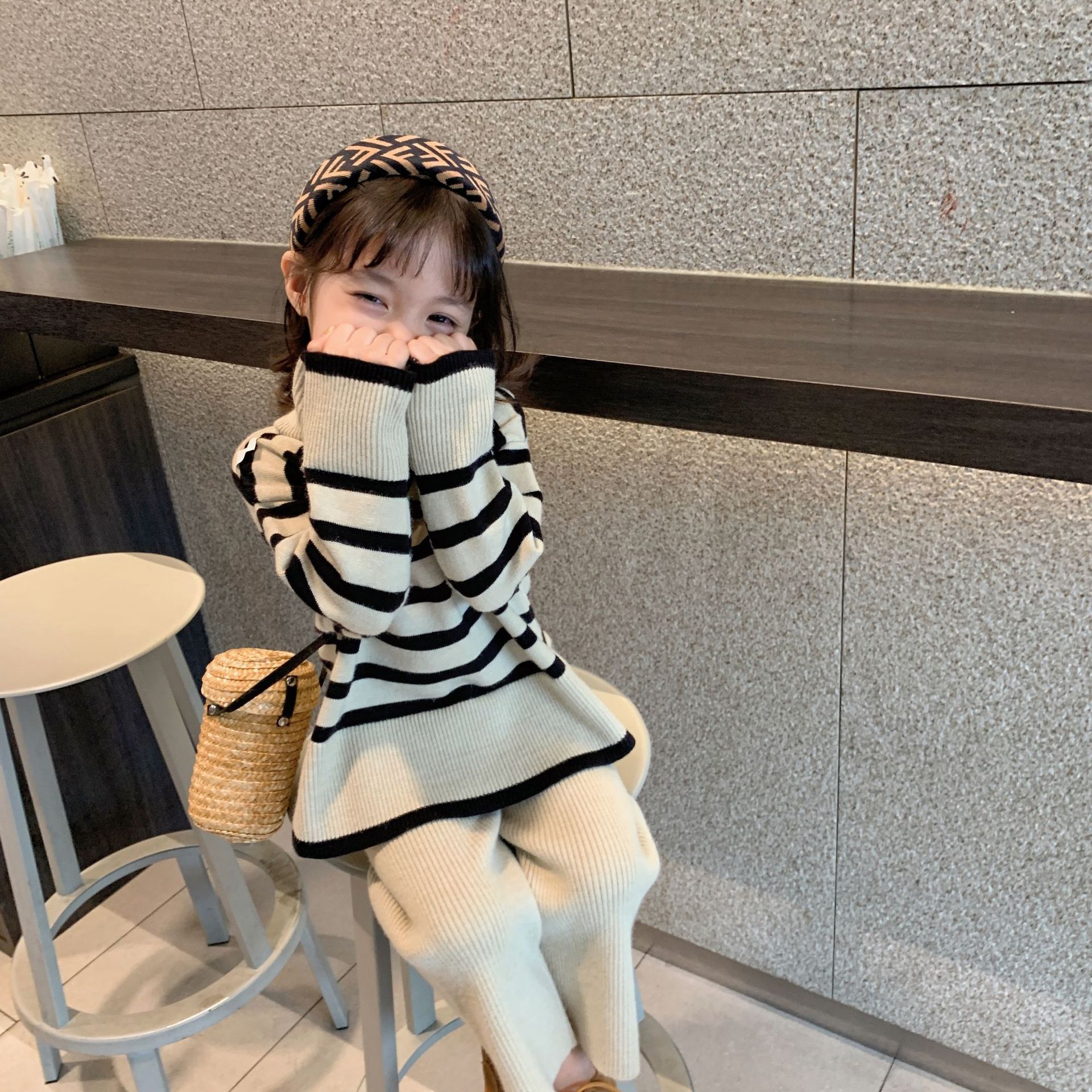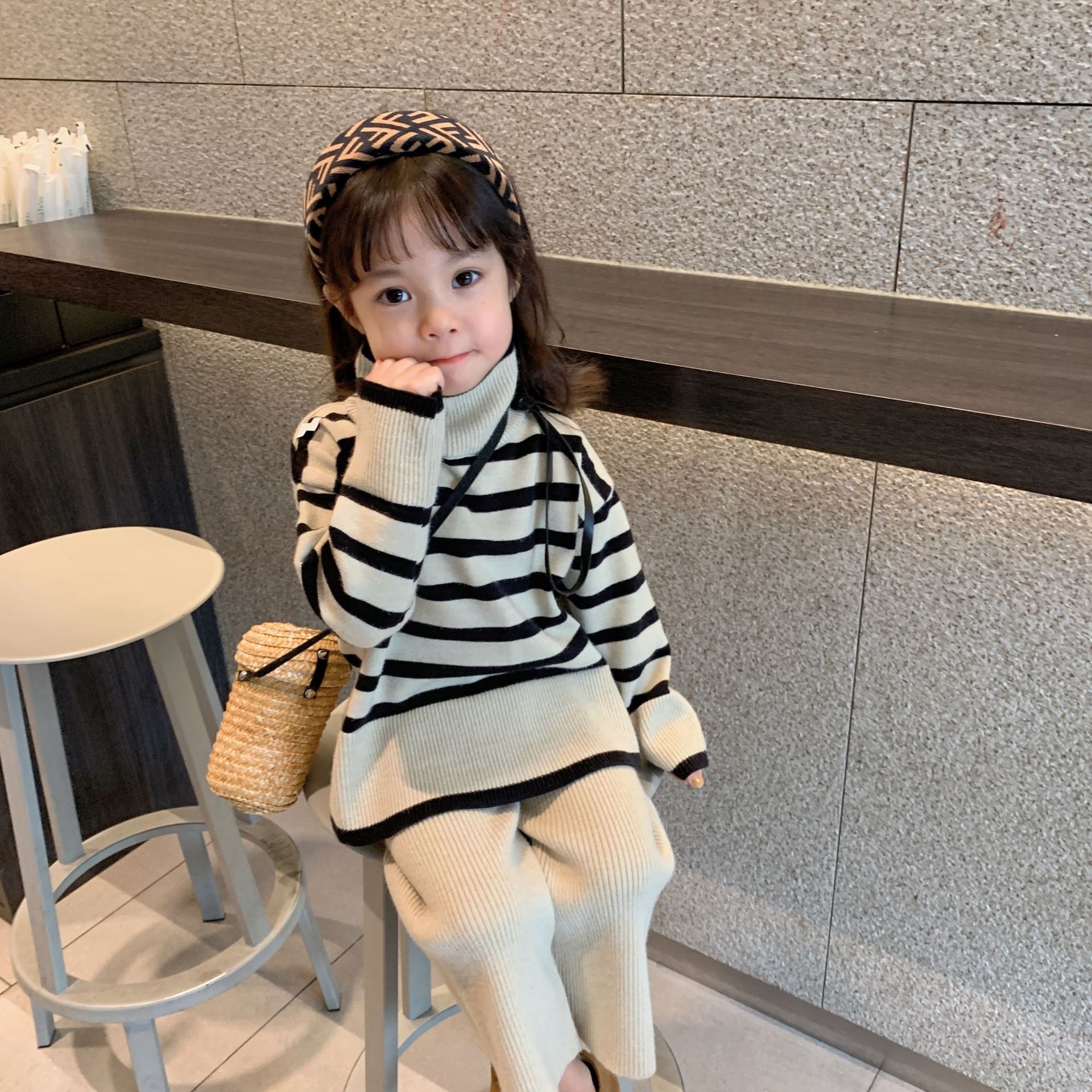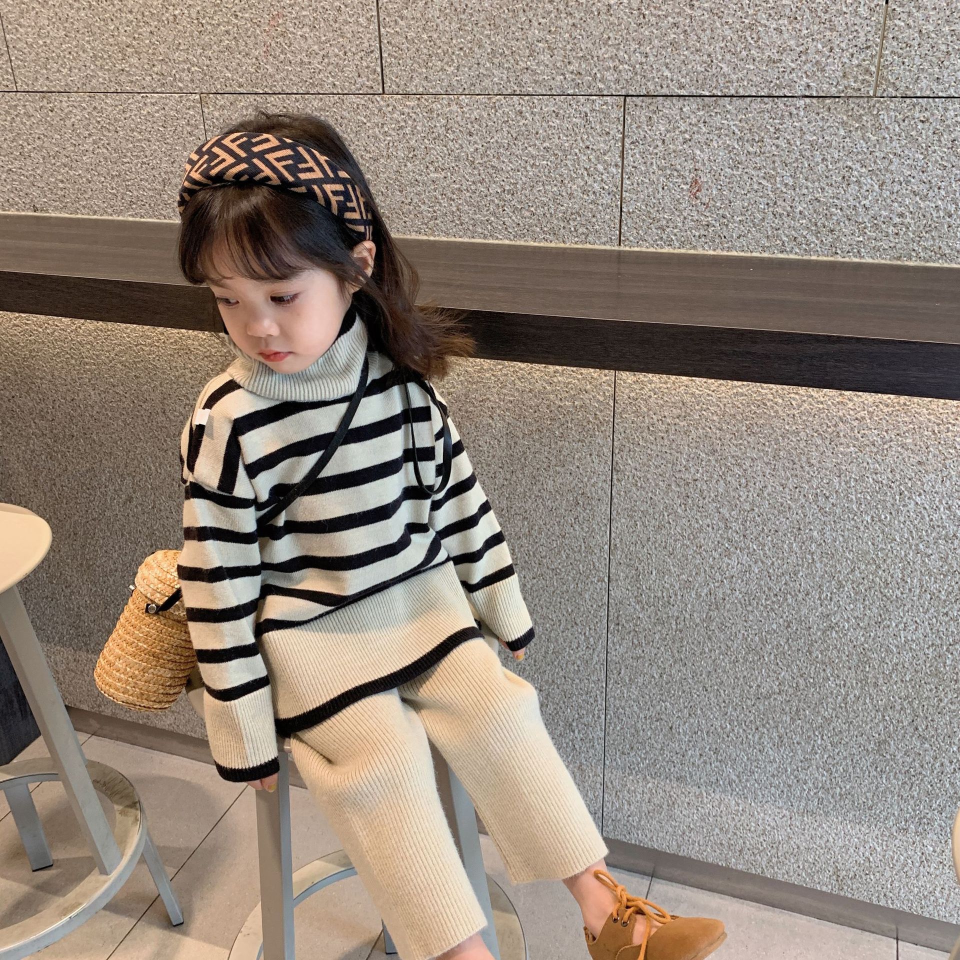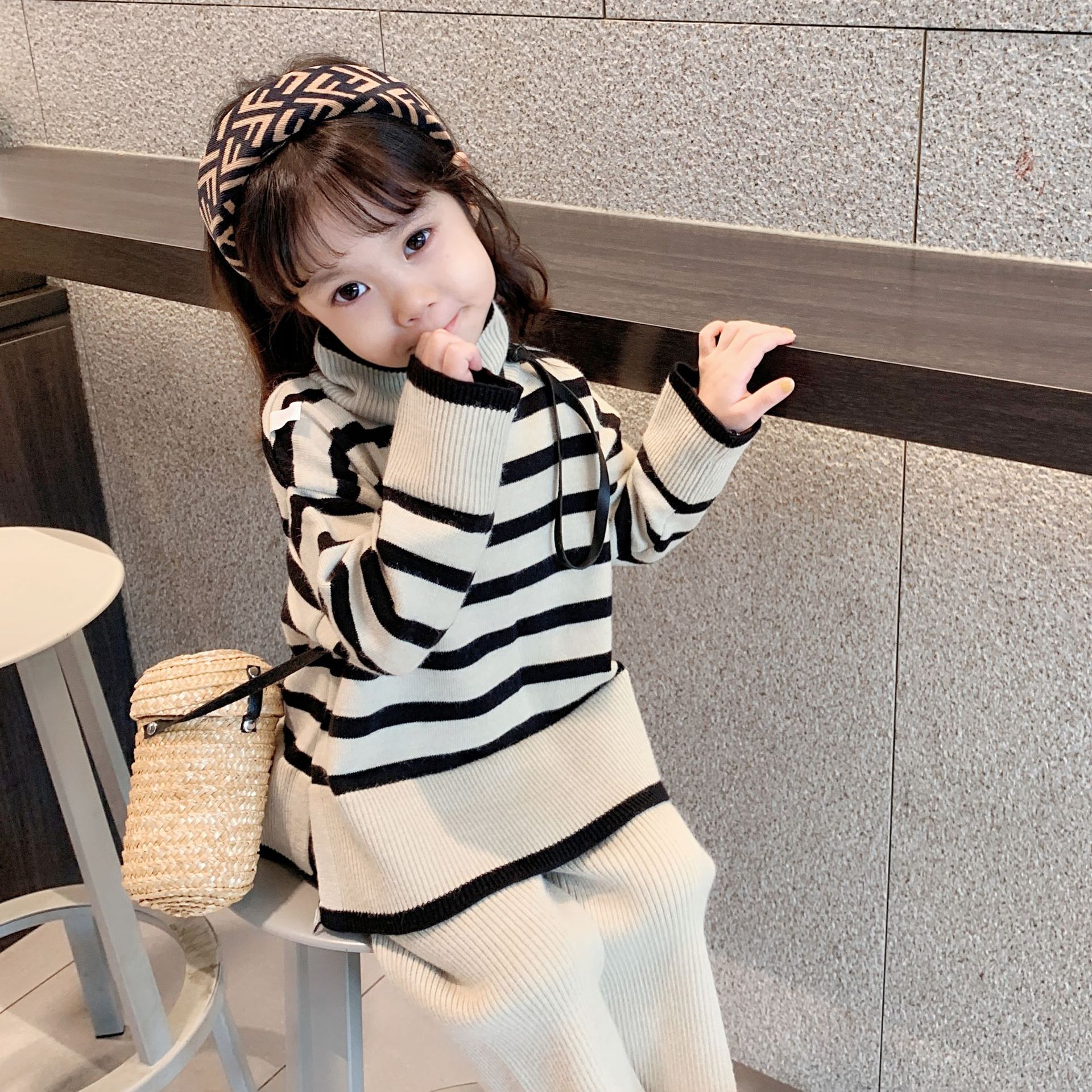 어린이 가을 새로운 한국식 스웨터 와이드 레그 로드 세트 소녀의 유행 서양 스타일 스트라이프 니트 투피스 세트스토어 가기