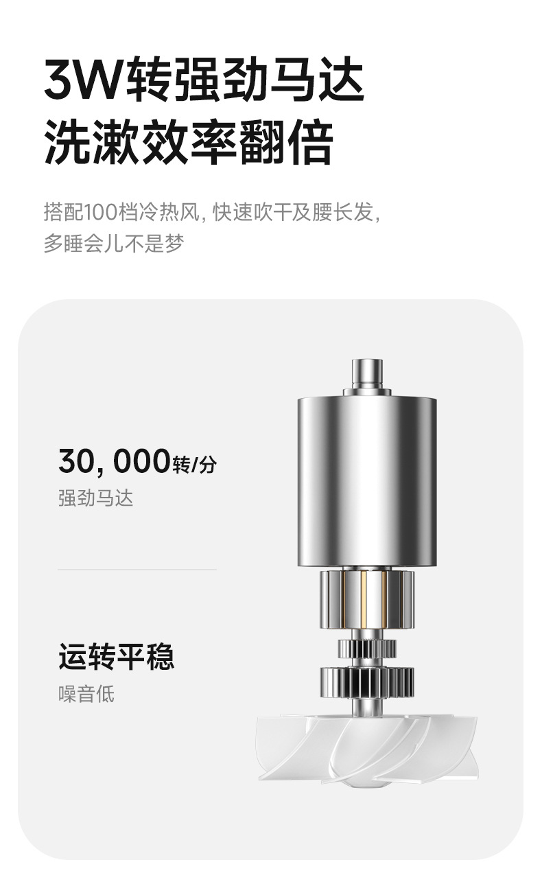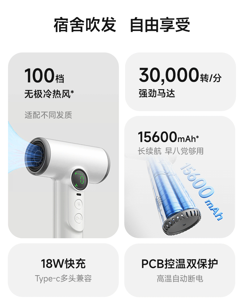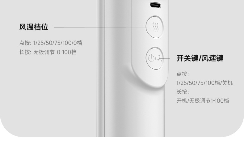 • 화이트 - USB 고속 충전 - 풍량/온도 100단계 조절 - 배터리 잔량 표시