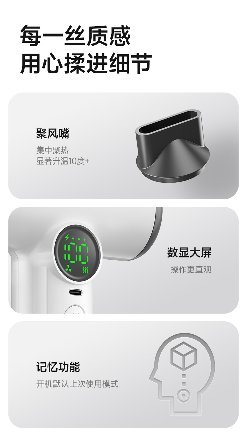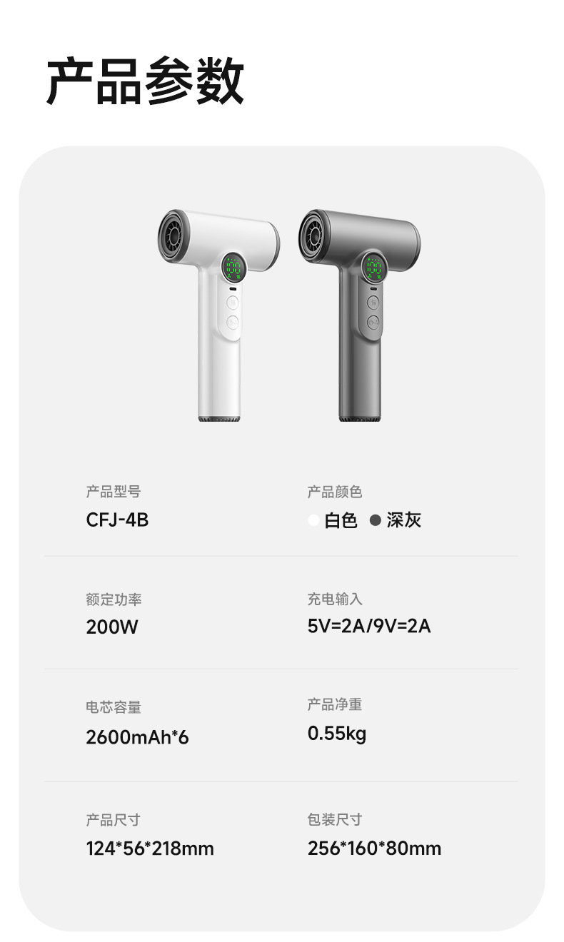 • 다크 그레이 - USB 고속 충전 - 풍력/온도 100단계 - 배터리 표시