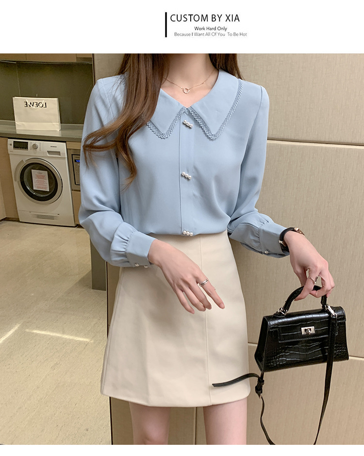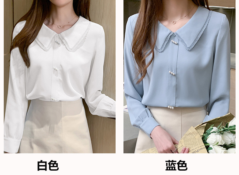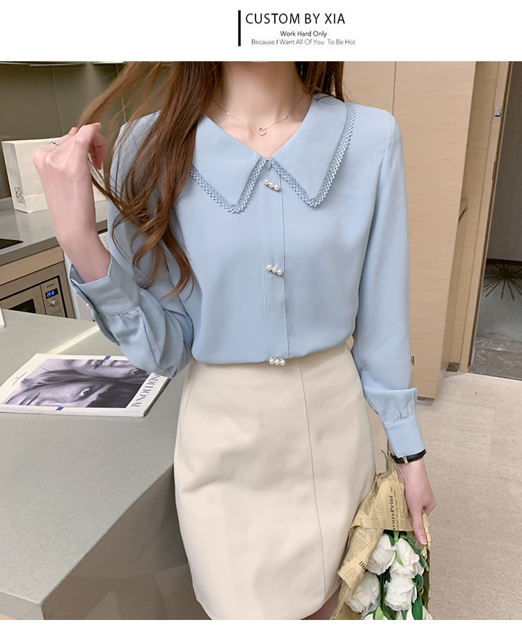 재고 셔츠 여성의 패션 외국 스타일 인형 칼라 프랑스 구슬 레이스 셔츠 긴 소매 쉬폰 셔츠 상단의 큰 수스토어 가기