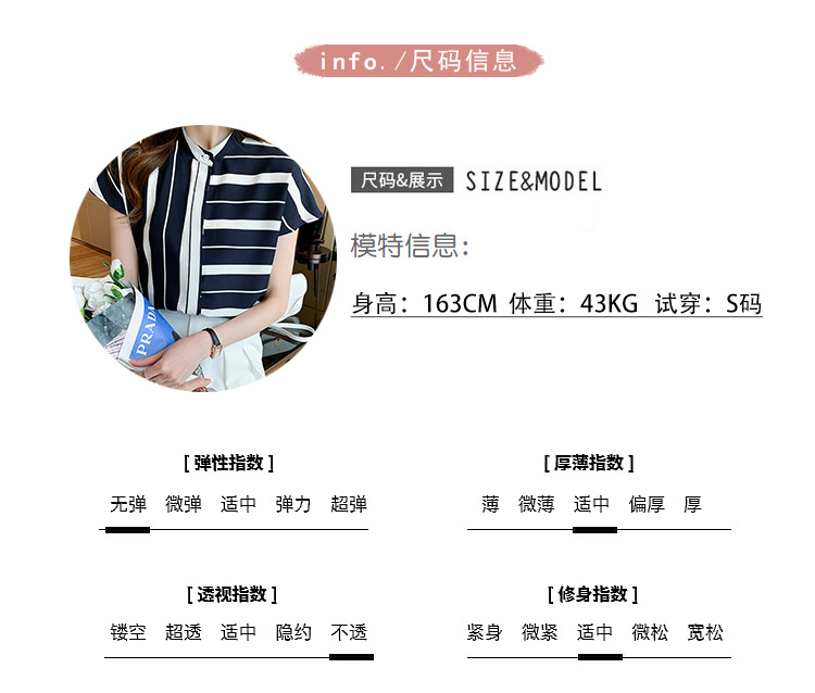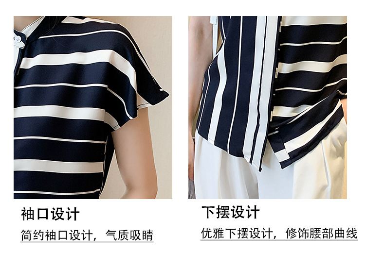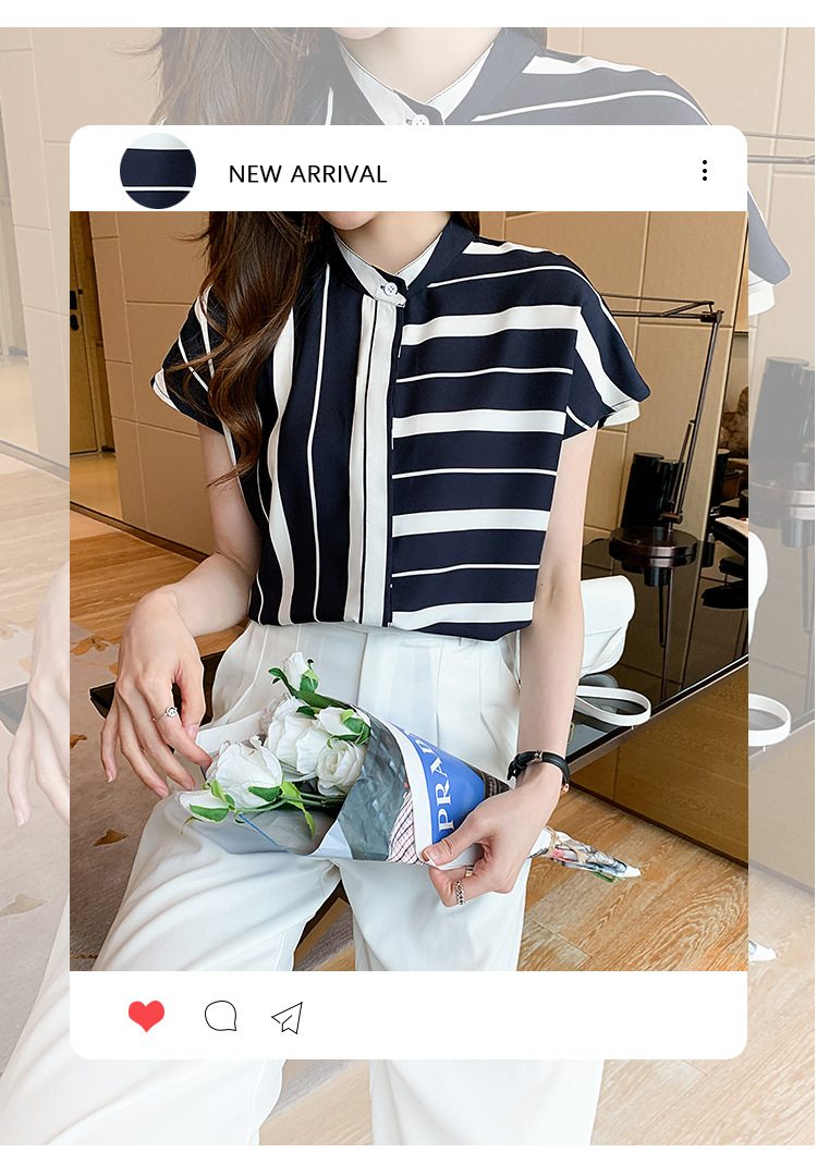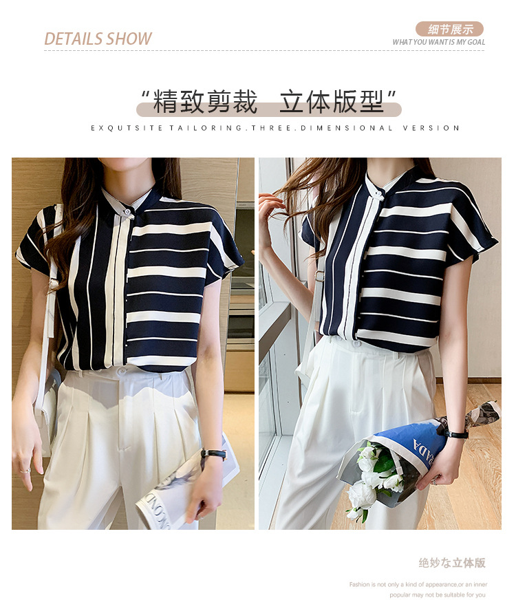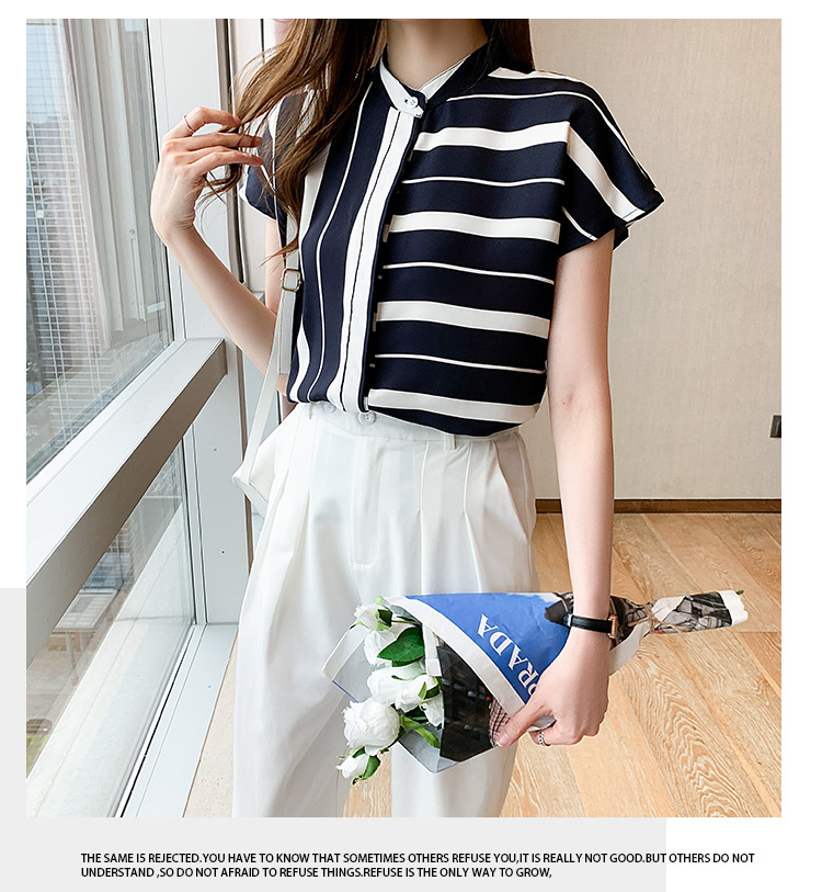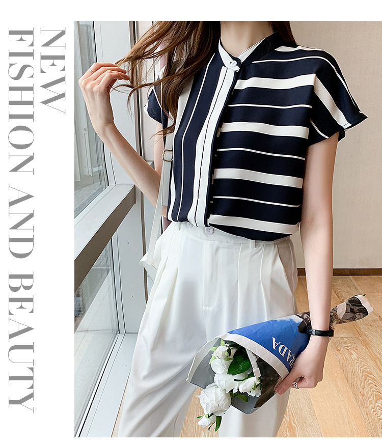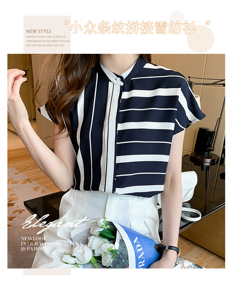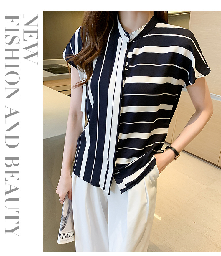 유럽 상품 불규칙한 줄무늬 쉬폰 반팔 셔츠 여성용 2022 봄과 여름 새로운 우아한 스탠드 칼라 반팔 슬림 탑