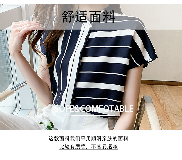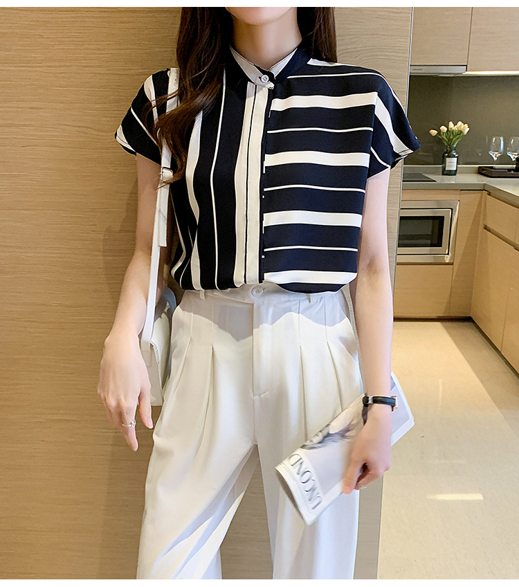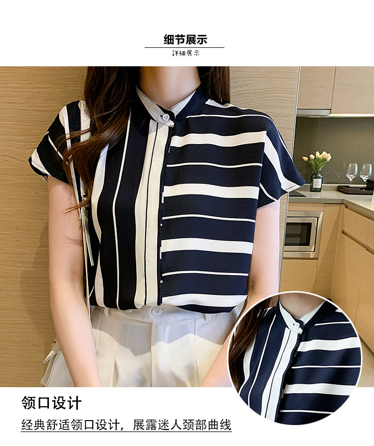 유럽 상품 불규칙한 줄무늬 쉬폰 반팔 셔츠 여성용 2022 봄과 여름 새로운 우아한 스탠드 칼라 반팔 슬림 탑스토어 가기