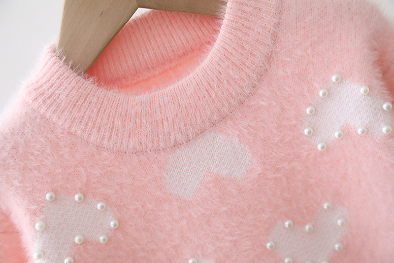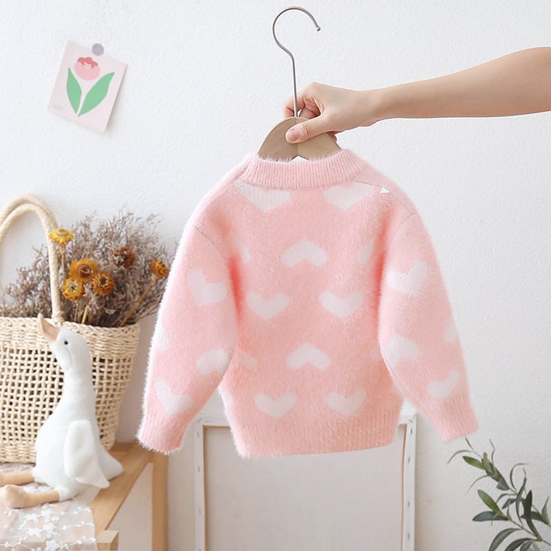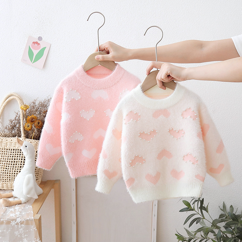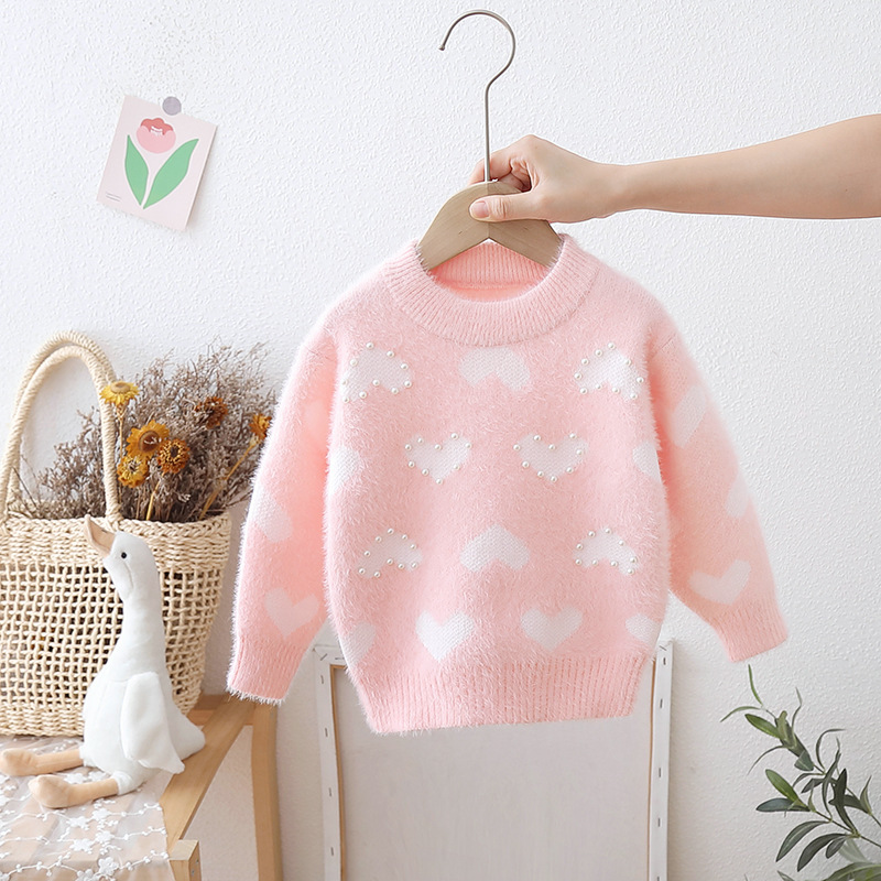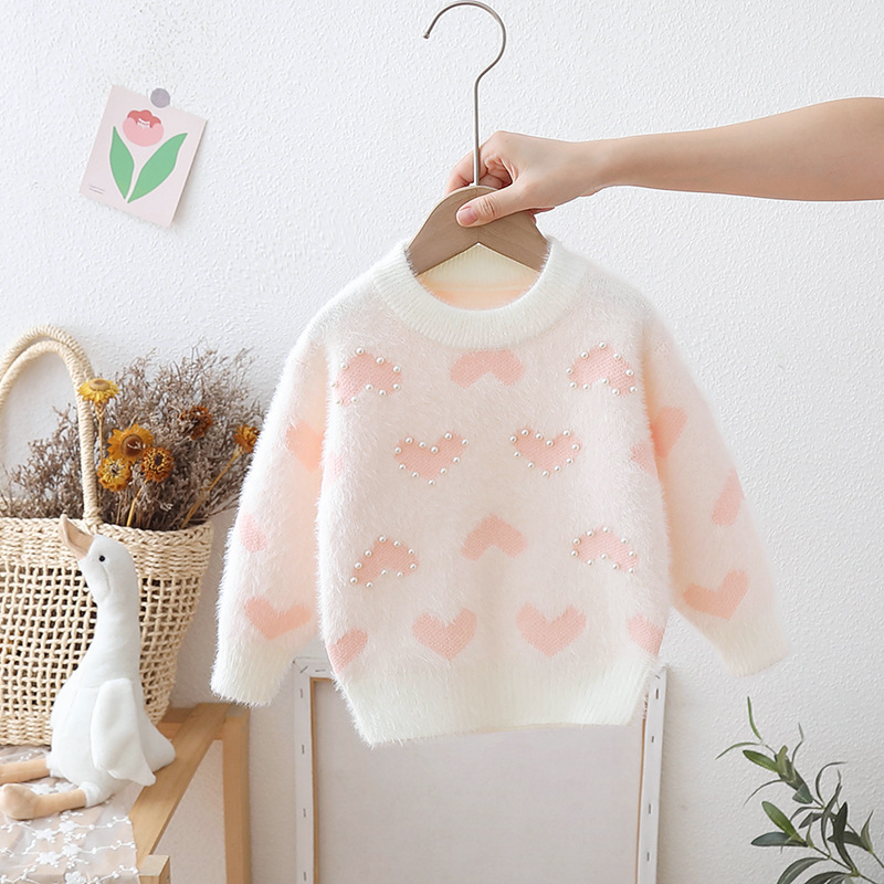 어린이 밍크 벨벳 스웨터 두꺼운 가을, 겨울 2024 새로운 한국어 스타일 베이비 풀오버 니트 소녀 사랑 바닥 셔츠