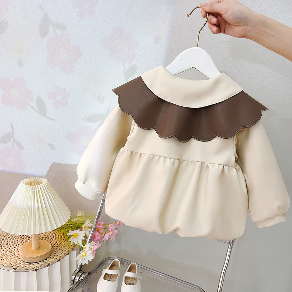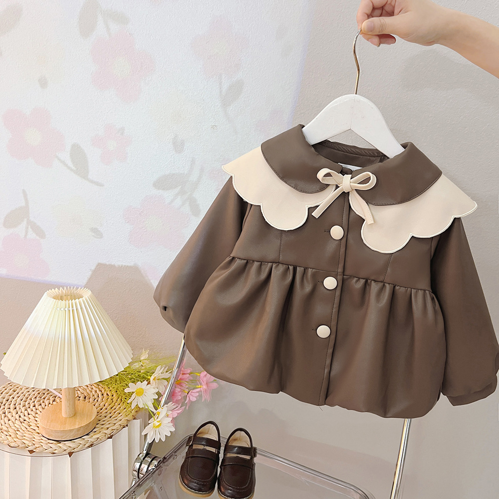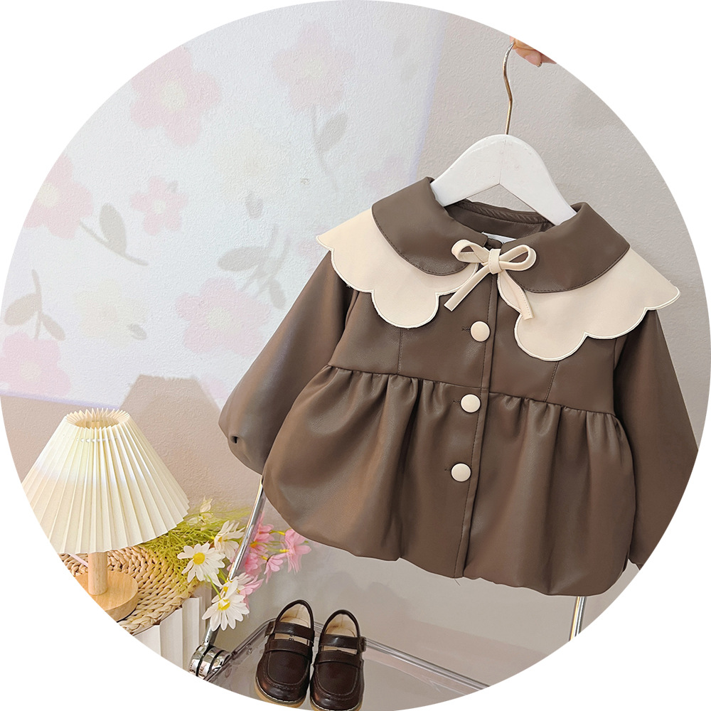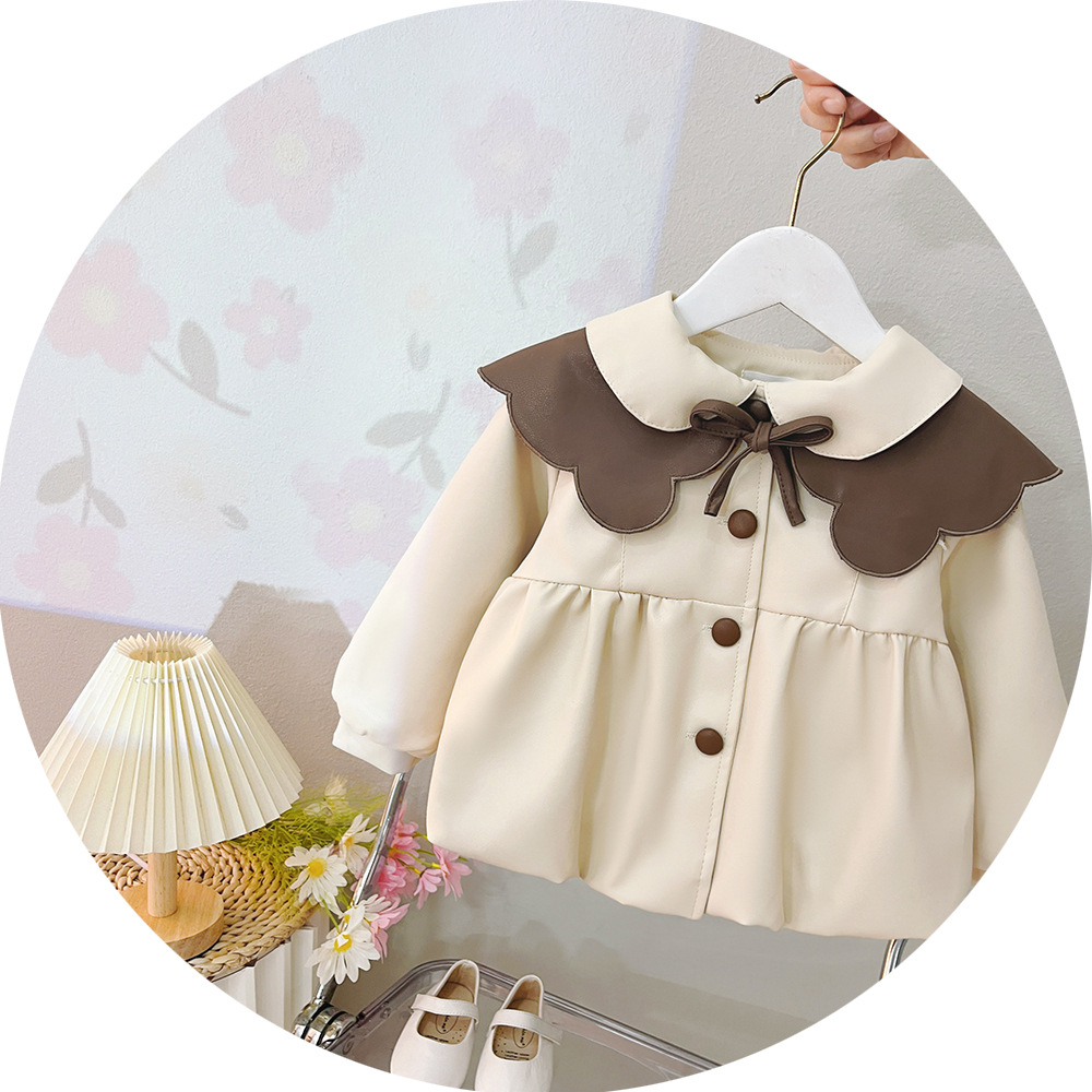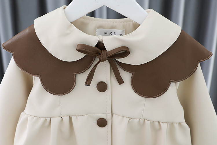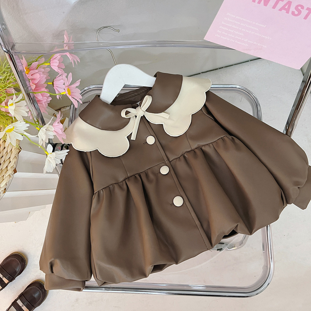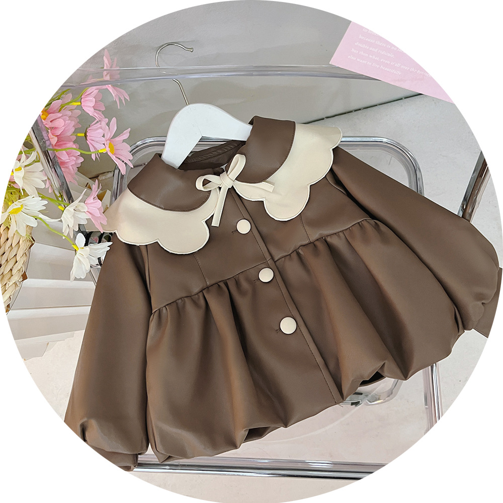 2025 가을 신상 여아 레이스 칼라 솔리드 컬러 가죽 재킷 여자 어린이 얇은 중간 길이 코트 한국 스타일 아우터스토어 가기